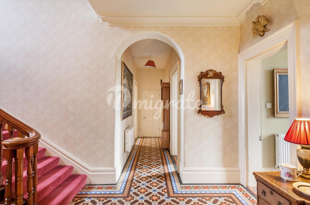 Через дубовую входную дверь можно пройти в просторный коридор с узорчатым викторианским кафельным полом и центральной лестницей из красного дерева и перилами. Справа примыкающие столовая и гостиная, обе с элегантными каминами с мраморными накладками и последняя, ведущая в зимний сад.