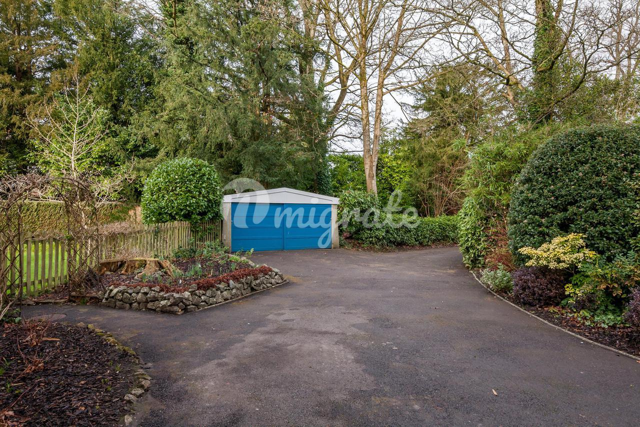 В передней части есть несколько клумб со взрослыми кустарниками, живой изгородью и деревьями, которые создают уединение от дороги, а также небольшой огороженный сад с газоном. Подковообразная дорога с асфальтовым покрытием соединяет два входа, а с одной стороны от нее находится гараж на две машины. Слева от дома двор, конюшня и примыкающий однокомнатный коттедж.