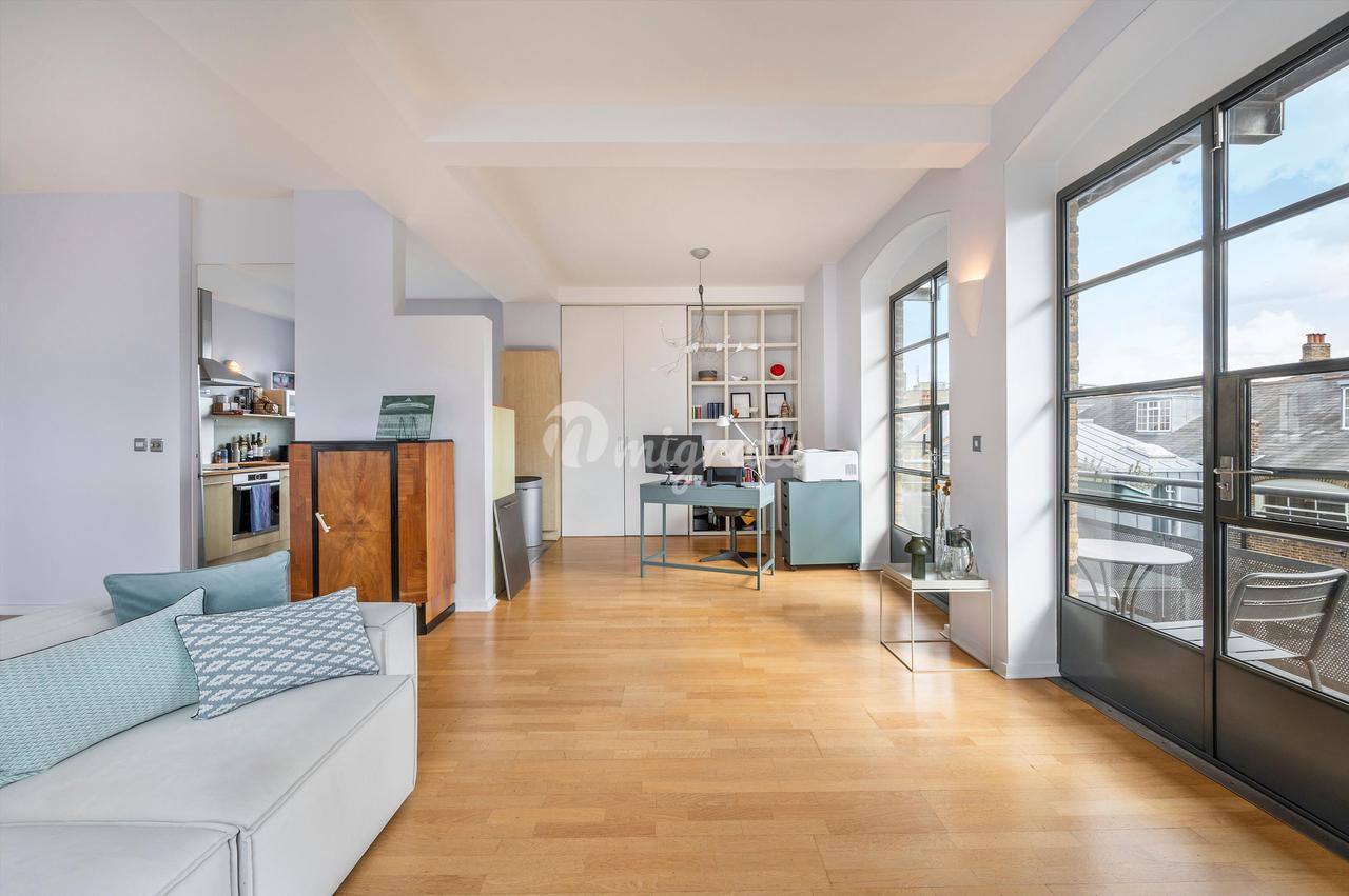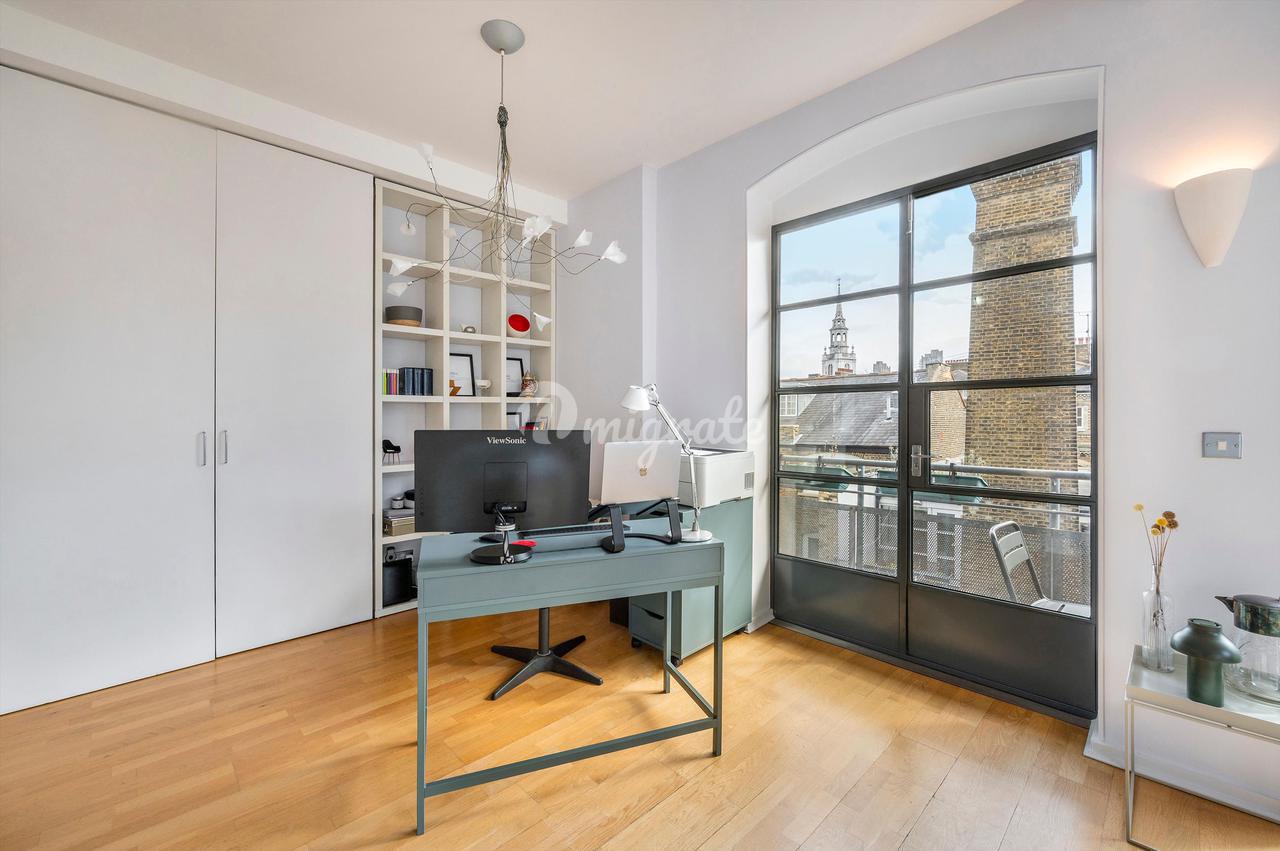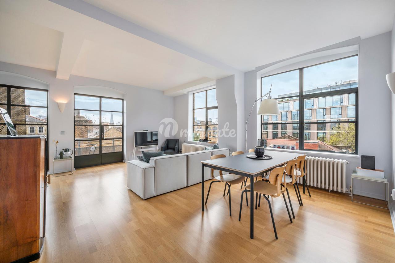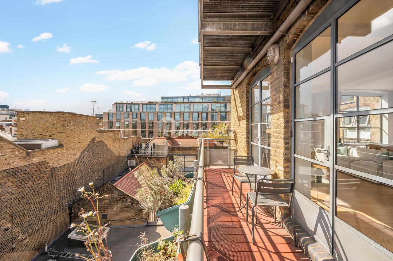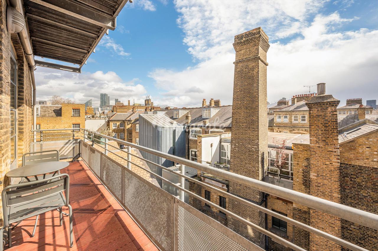 Квартира расположена в тихом месте в задней части здания, с тройным видом на восток, Юг и Запад, и залита светом, а также имеет очаровательный вид на эклектичные крыши Клеркенуэлла.