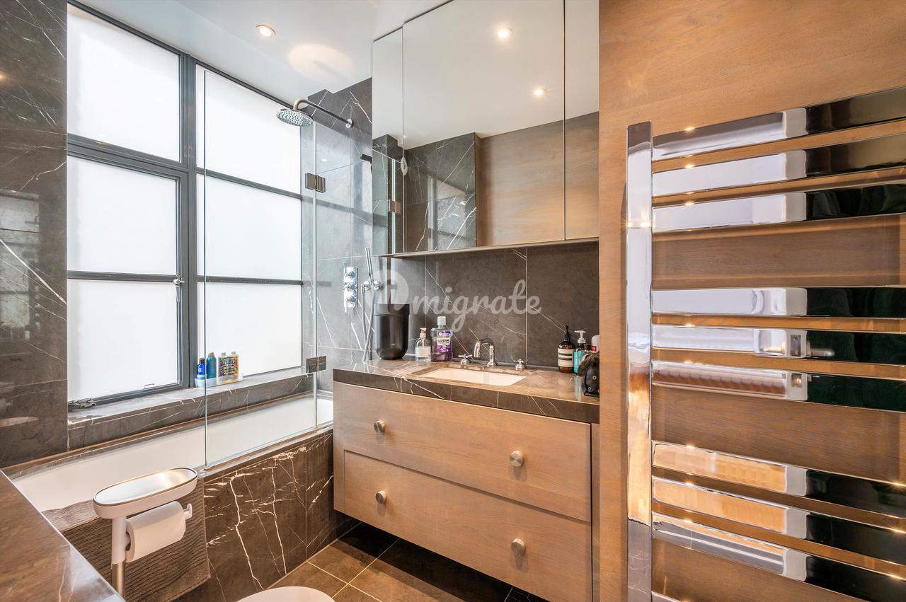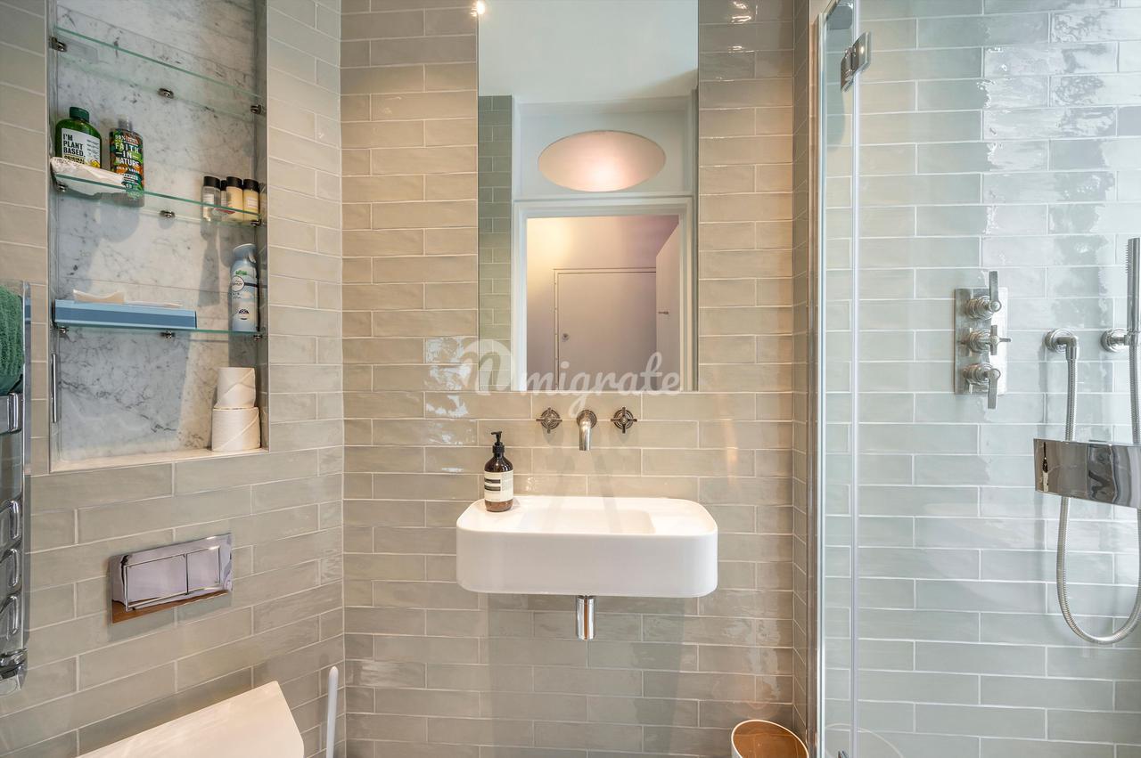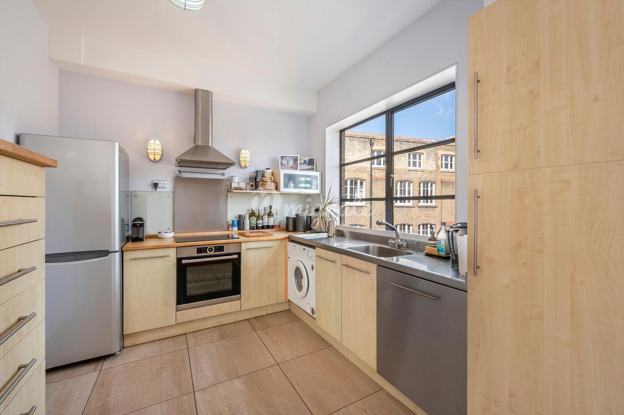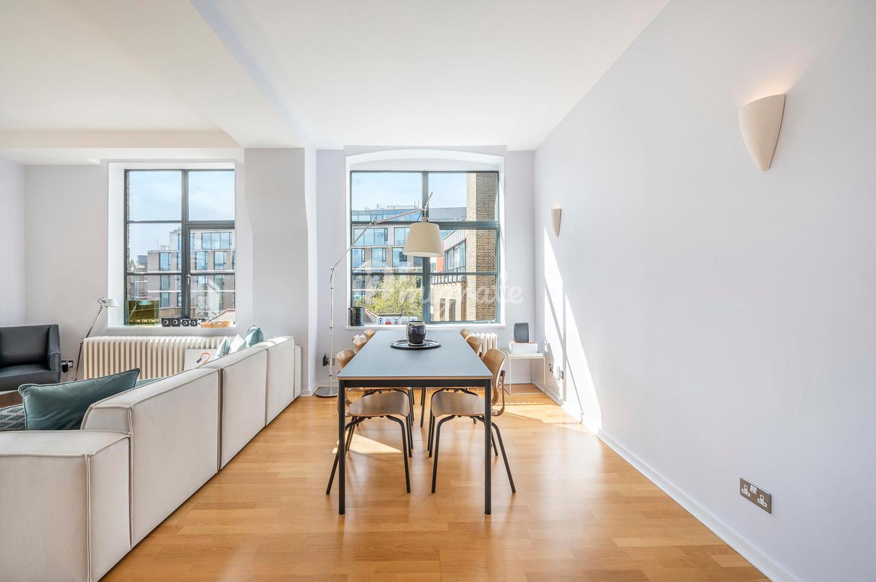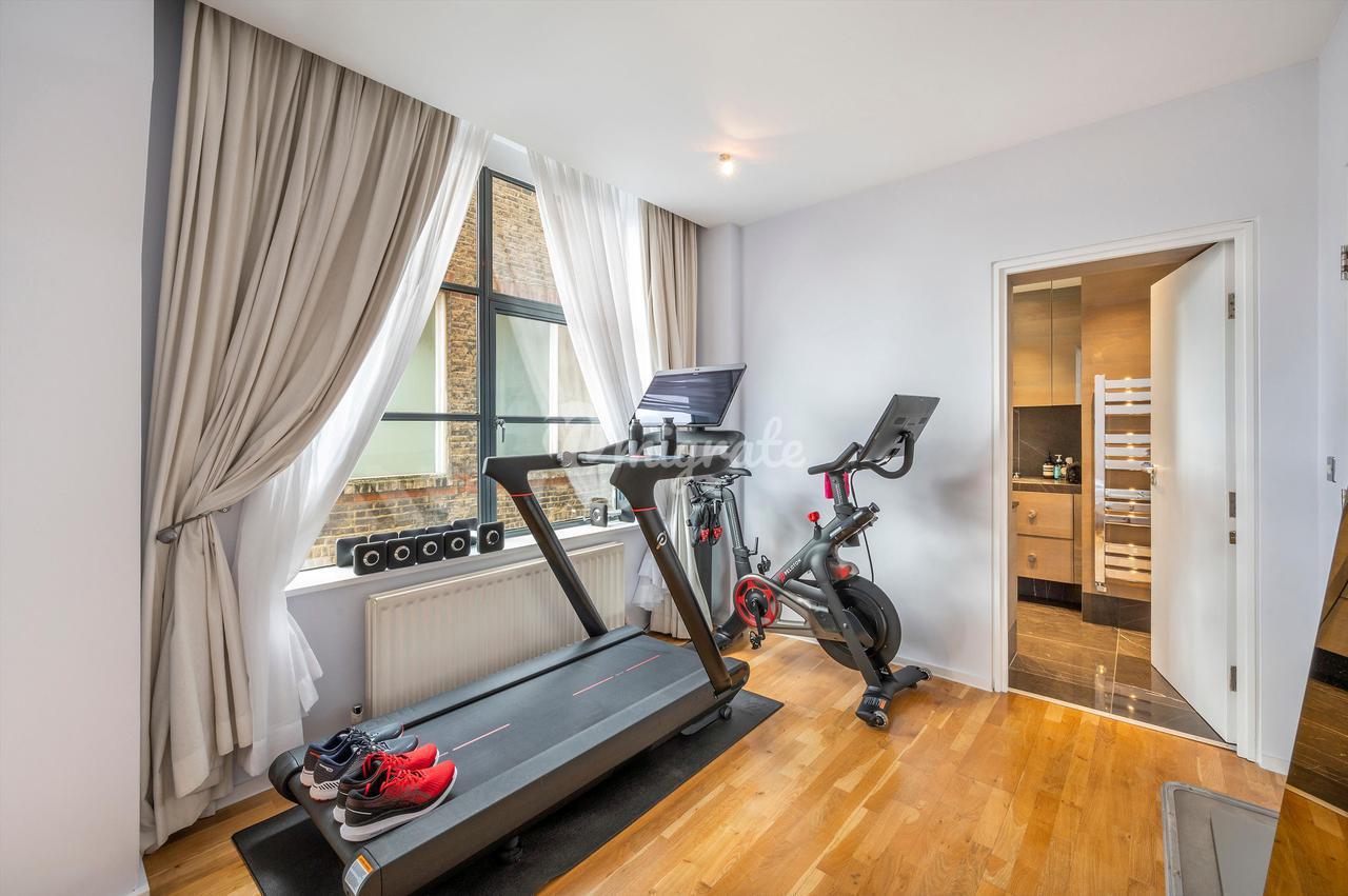 Квартира расположена в тихом месте в задней части здания, с тройным видом на восток, Юг и Запад, и залита светом, а также имеет очаровательный вид на эклектичные крыши Клеркенуэлла.