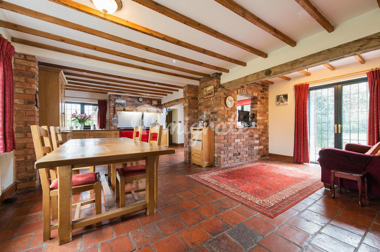 Большая оборудованная кухня/общая комната имеет столешницы Corian, раковину Belfast, четыре духовки AGA, работающие на жидком топливе, в камине Ingleook и встроенную посудомоечную машину. В нем есть кафельный пол, французские двери, ведущие на террасу, и камин.