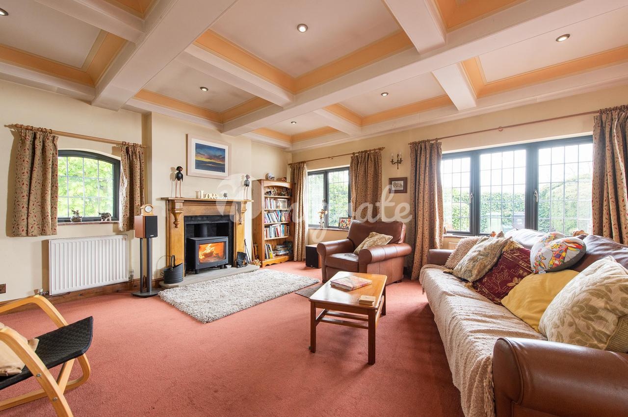 Исключительно большая трехсторонняя гостиная/столовая имеет французские двери, открывающиеся на террасу, и в каждом конце комнаты есть камины, один из которых является открытым действующим камином, а в другом находится скандинавская дровяная печь. Есть также единственная дверь, выходящая на веранду перед двумя пристроенными конюшнями.