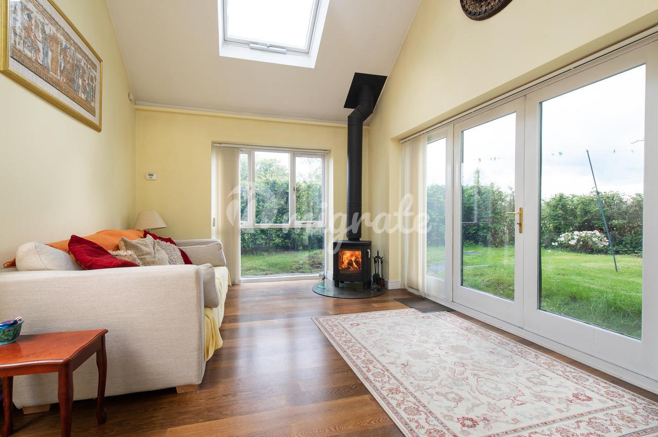 Внутренний холл с деревянным полом из немецкого дуба переходит в светлую и просторную садовую комнату, которую продавцы добавили в 2008 году. В нем есть панорамное окно, сводчатый потолок, два окна Velux с электроприводом, выдающаяся отдельно стоящая скандинавская дровяная печь и две комплекты французских дверей, открывающихся на террасу и в сад.