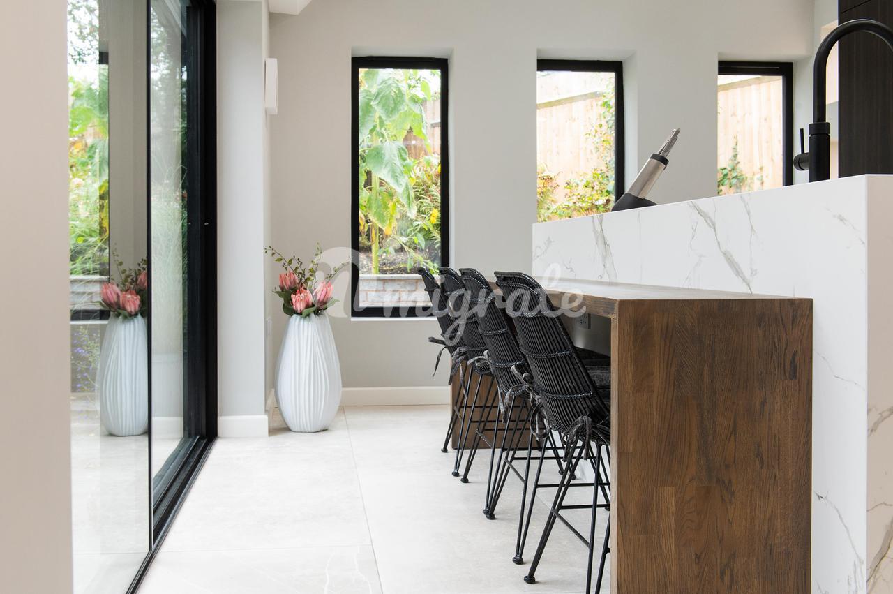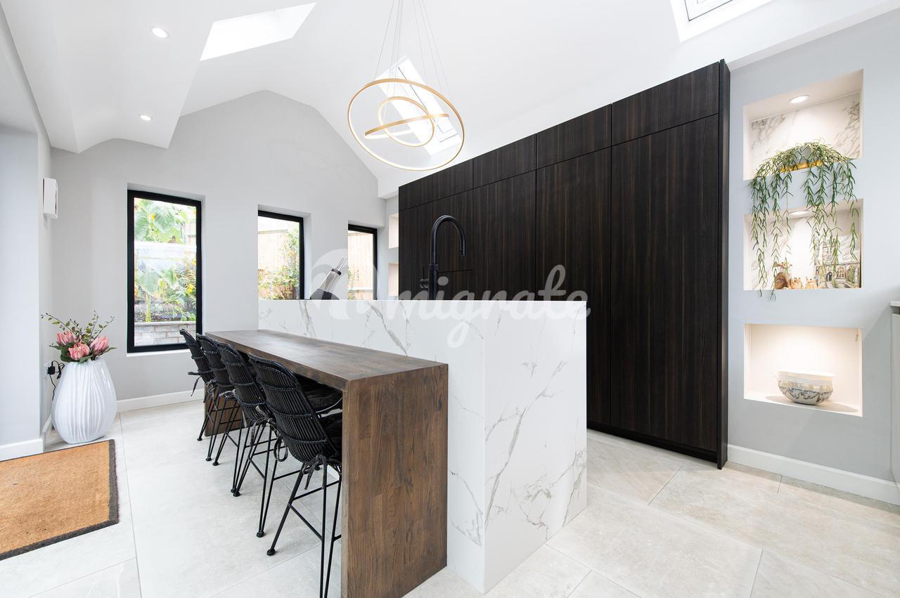 Впечатляющая недавно расширенная кухня оснащена кухней Siemens с рабочими поверхностями Dekton book и островом. На кухне настелен каменный пол Terzetto с подогревом. В дополнение к современной кухне есть кран для кипячения Quooker и бытовая техника Siemens. Большие окна, светильники Velux на крыше и двойные раздвижные двери создают замечательное светлое жилое пространство открытой планировки.