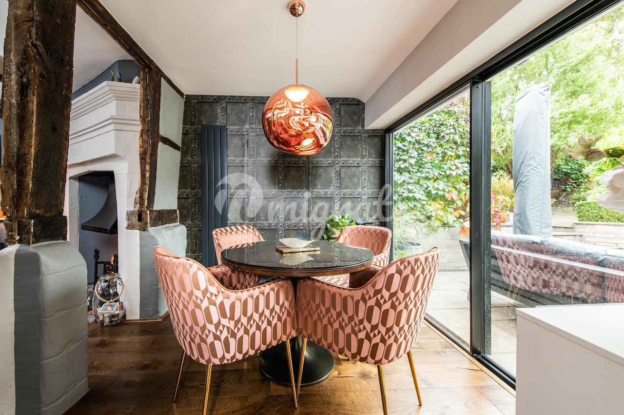 Исключительная элегантная гостиная с открытыми балками, новым дубовым полом и большим открытым камином в стиле Тюдор выходит окнами на фасад дома. Тот же новый дубовый пол продолжается в столовой и недавно установленных двойных раздвижных дверях "минимальных линий", которые также открываются на террасу. Недавно оборудованное подсобное помещение расположено рядом со столовой. Скрытое освещение на террасе создает атмосферу для вечерних развлечений.