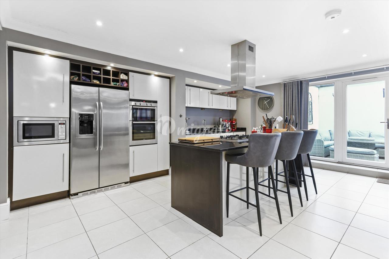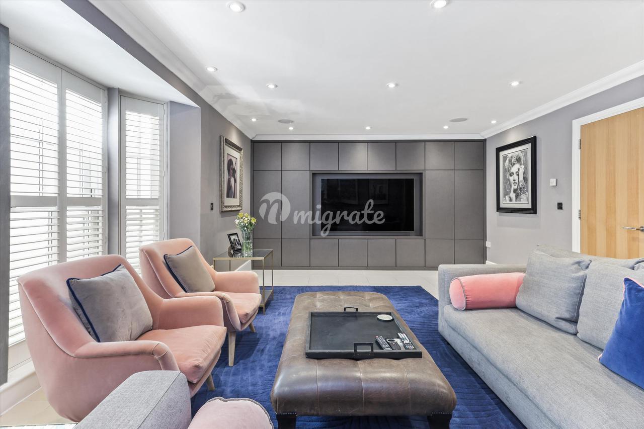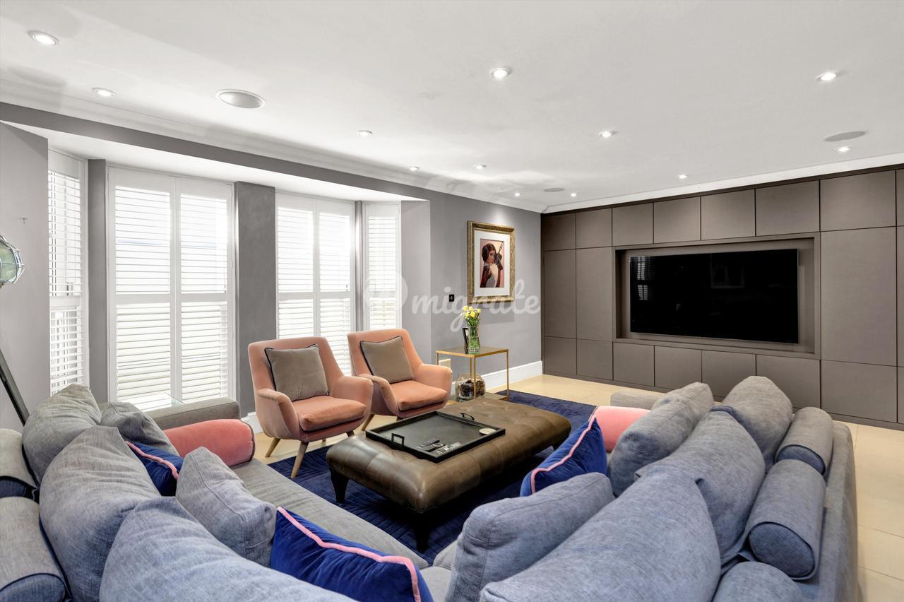 Обманчиво просторный дом, в котором есть четыре комнаты для приемов, расположенные на двух нижних этажах, включая большую кухню-столовую с центральным островом и двустворчатыми дверями, ведущими на красивую террасу во внутреннем дворе. На этом же этаже находится семейный номер, кинотеатр или игровая комната, а также подсобное помещение и туалет. На первом этаже расположены две большие комнаты для приемов; отделанная панелями гостиная размером 21 х 15 футов с видом на сад, окнами от пола до потолка и встроенным баром / медиа-центром на заказ, а также более официальная приемная или столовая в передней части дома. Кроме того, на этом этаже есть туалет и большой шкаф для одежды. В дом можно попасть через широкий коридор между этими комнатами, что создает ощущение простора во всем доме.