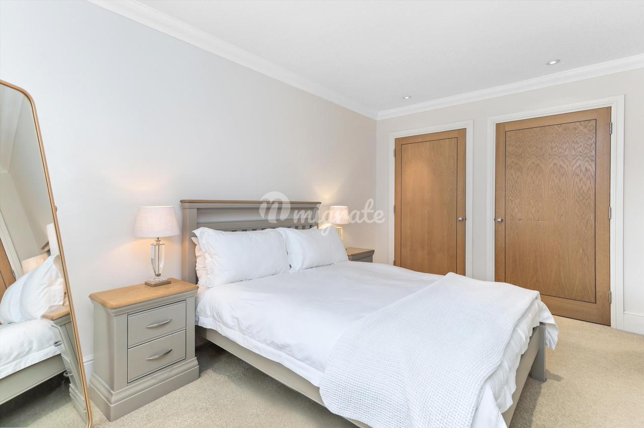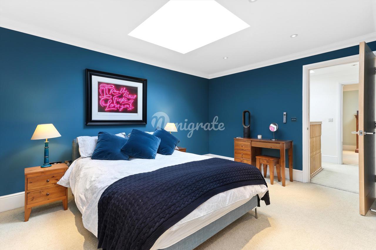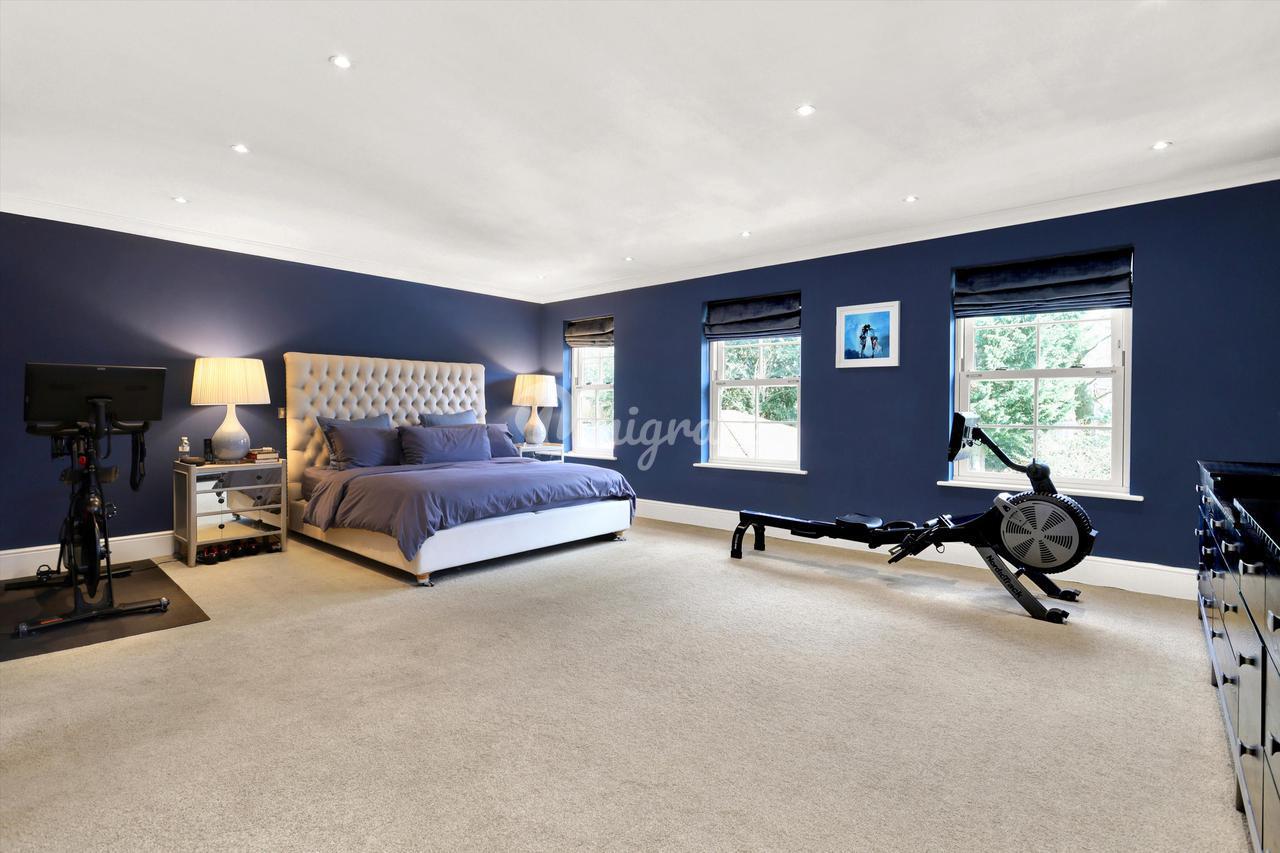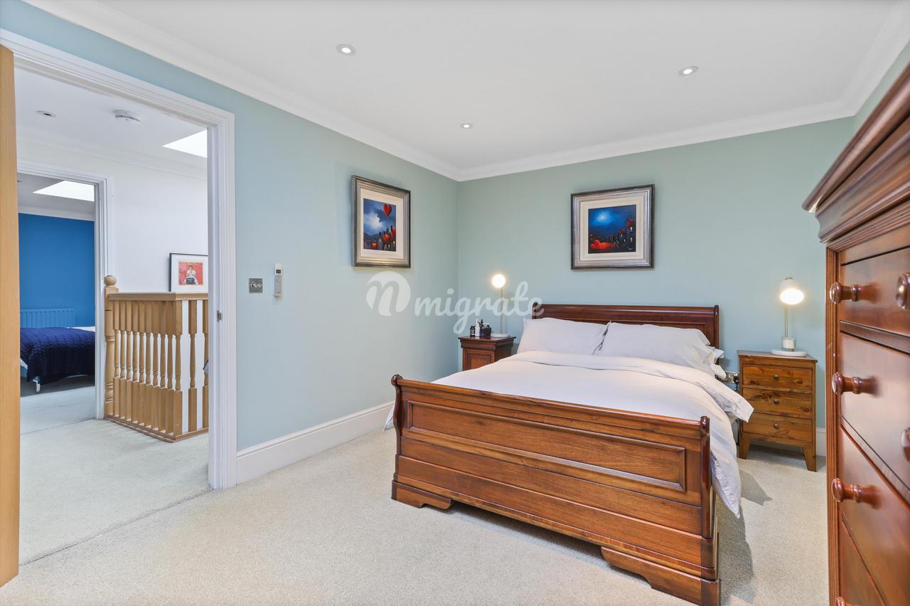 Главная спальня находится в задней части второго этажа, больших размеров (21 х 19 футов), с большой ванной комнатой с ванной и отдельным душем. На этом этаже есть еще две спальни (одна в настоящее время оборудована как кабинет со встроенными столярными изделиями на заказ), они имеют общую семейную ванную комнату с душем над ванной. На верхнем этаже расположены две спальни, каждая с окнами Velux и общей душевой комнатой.