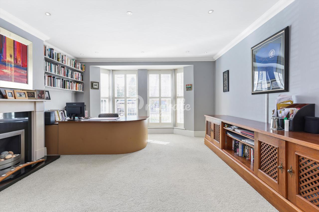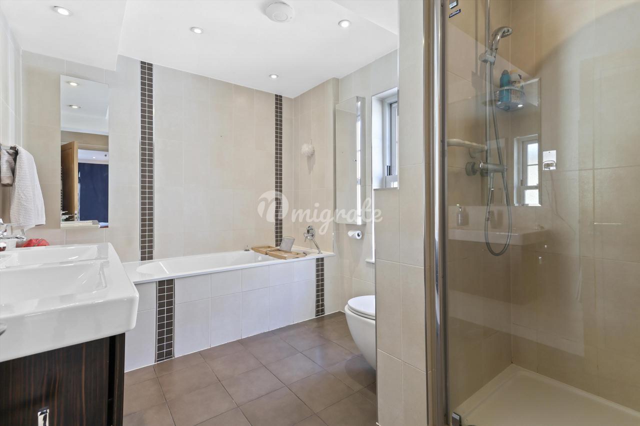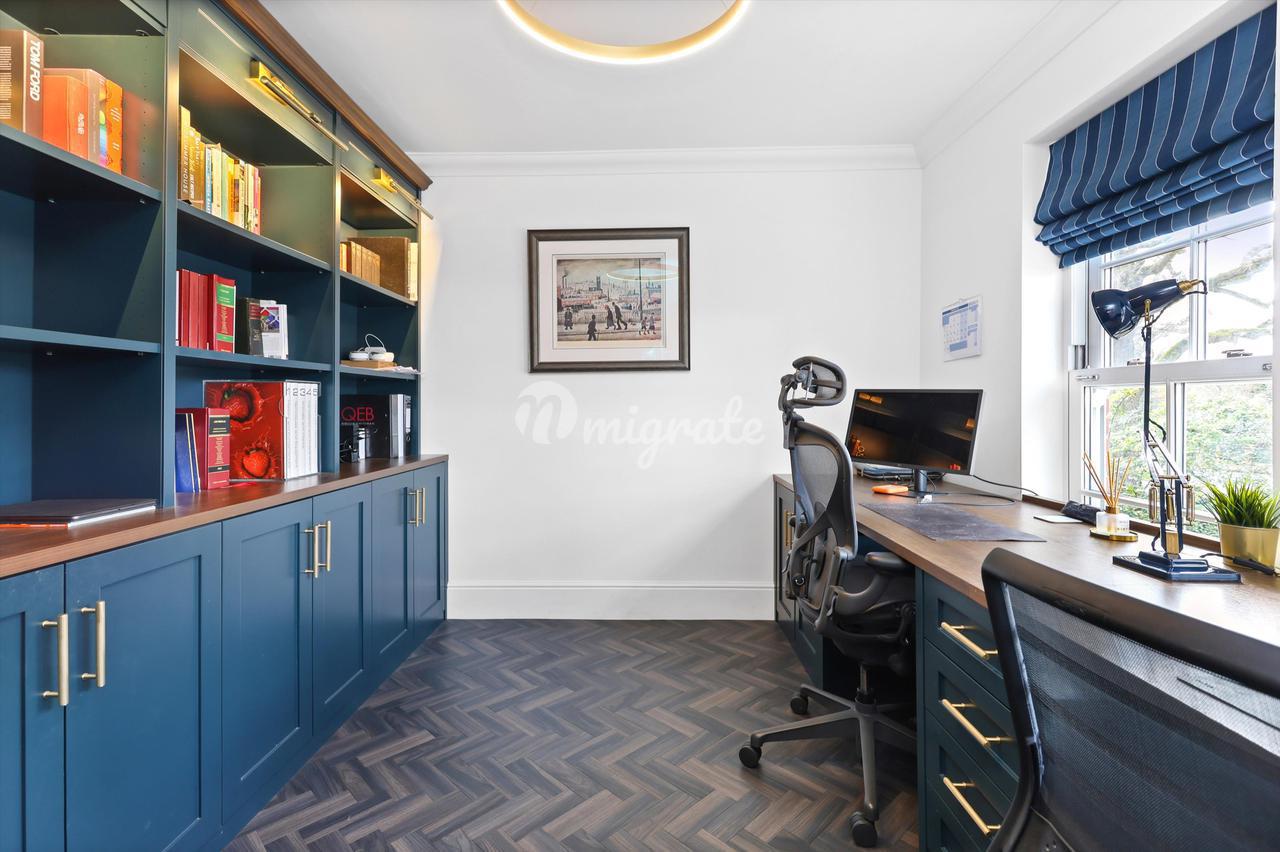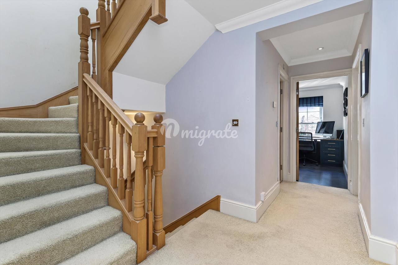 Главная спальня находится в задней части второго этажа, больших размеров (21 х 19 футов), с большой ванной комнатой с ванной и отдельным душем. На этом этаже есть еще две спальни (одна в настоящее время оборудована как кабинет со встроенными столярными изделиями на заказ), они имеют общую семейную ванную комнату с душем над ванной. На верхнем этаже расположены две спальни, каждая с окнами Velux и общей душевой комнатой.