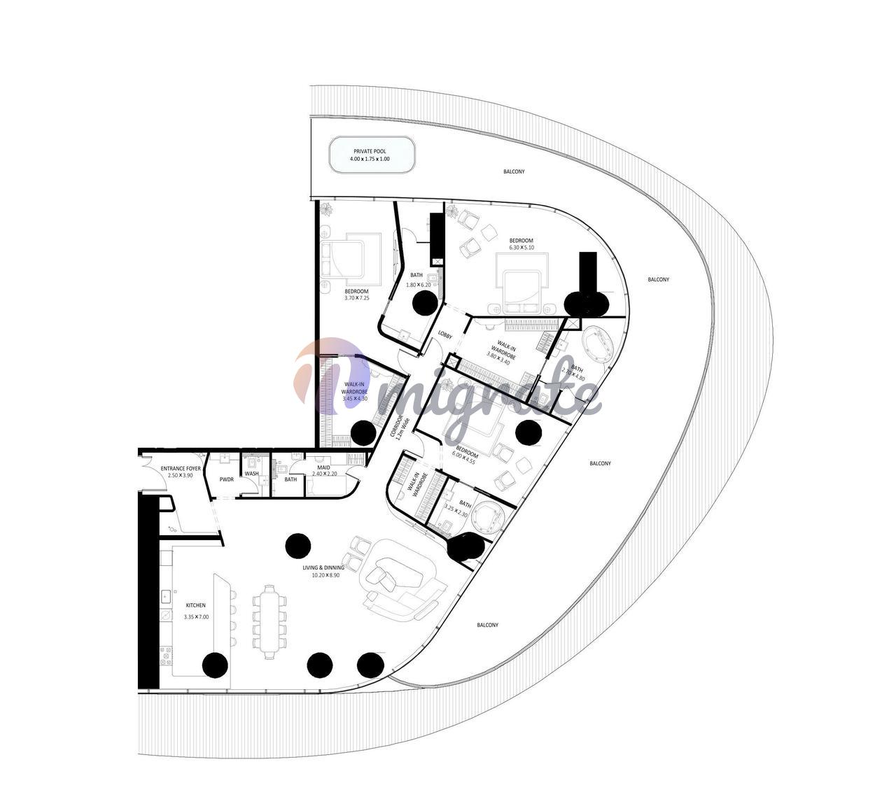 Все резиденции будут выполнены в индивидуальном дизайне. Интерьеры разрабатываются с использованием натуральных материалов: мрамора, калакатты, дерева, матовых сеток и плотного хрома. Высота потолков составляет 4,2 м. Планировки резиденций включают балконы, приватные бассейны, джакузи и комнаты персонала.
