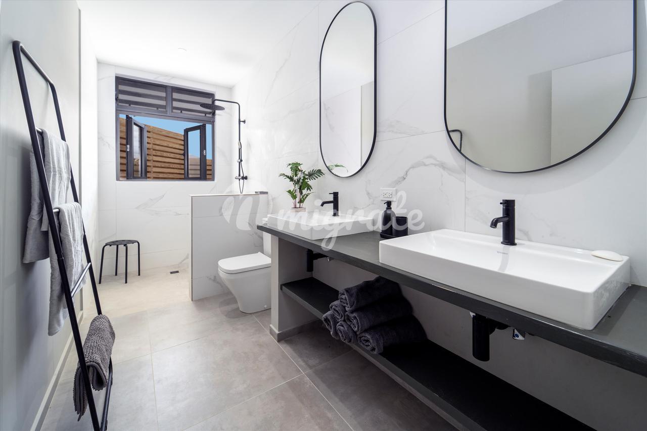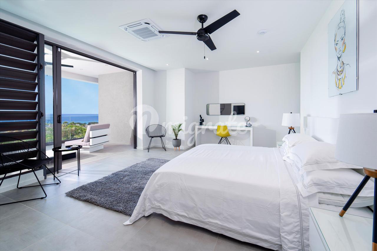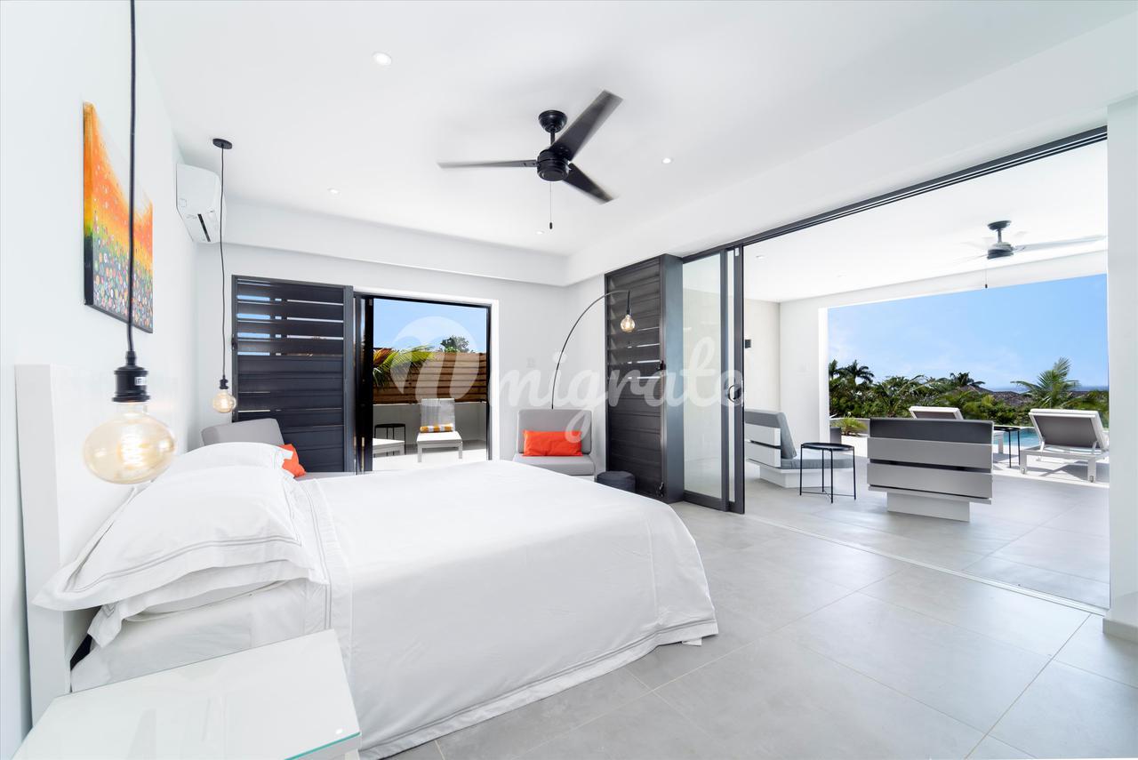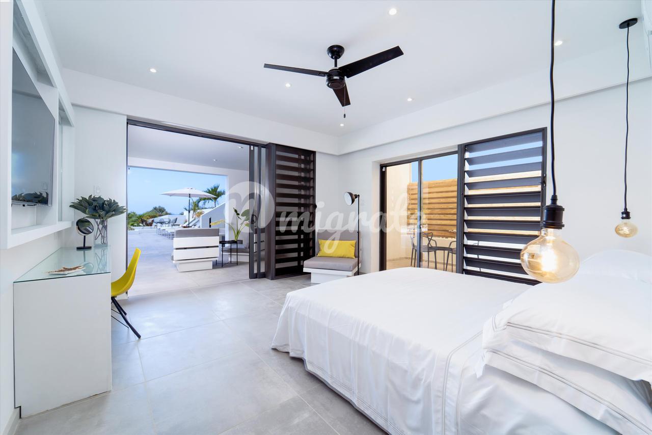 Наряду с главной кухней, здесь также есть кухня шеф-поваров и открытая кухня с принадлежностями для барбекю. На этом этаже находится спальня с собственной террасой, с которой вместе с роскошной ванной комнатой открывается потрясающий вид на море. Существует также медиа-зал, 2 дамские комнаты, офис и подсобное помещение. На нижнем этаже расположены 4 спальни, в каждой из которых есть ванная комната и гардеробная. Каждая комната выходит через раздвижные двери на большую крытую террасу, террасу у бассейна и уединенные сады. Два из этих люксов также имеют собственную террасу, выходящую из спальни и ванной комнаты, что обеспечивает полную конфиденциальность. Все 5 спален могут быть оборудованы как King size (UK Super King), а в 2 комнатах можно установить две односпальные кровати.