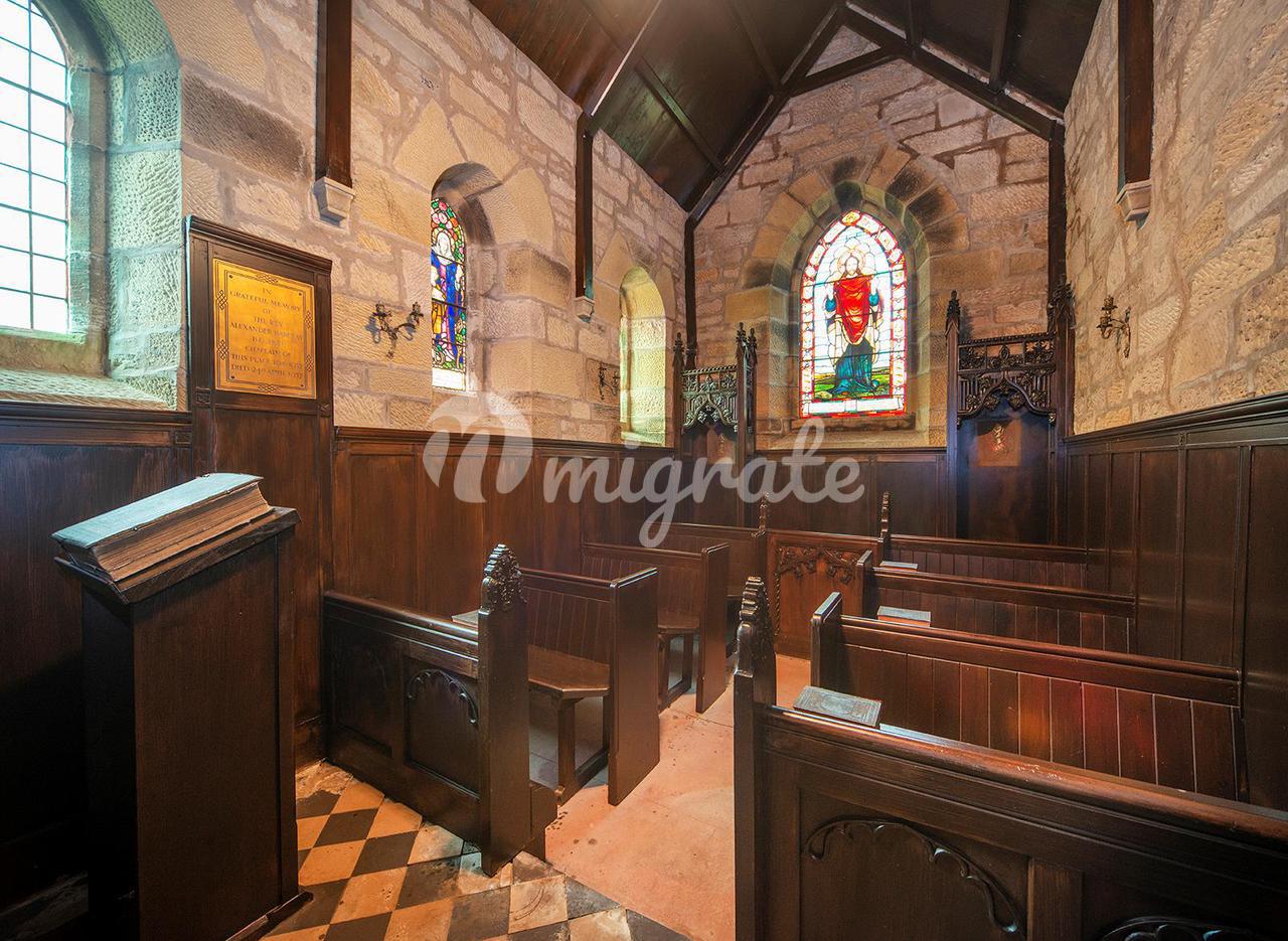 Жилые помещения расположены на трех этажах следующим образом: Первый этаж: прихожая, подсобное помещение, кладовая, столовая (с открытым камином), кабинет (с открытым камином), гардеробная с туалетом, заднее крыльцо, кладовая, кухня-столовая, уютная (с дровяной печью), большая гостиная (с камином). дровяная печь, встроенная в мраморный камин) и пристройка, включая кухню, спальня, гостиная и прихожая. Первый этаж: лестничная площадка, главная спальня с гардеробной и ванной комнатой, еще две спальни и общая ванная комната. Второй этаж: приземление три спальни и семейная ванная комната. К гостиной примыкает очень очаровательная маленькая часовня, сохранившаяся в своем первоначальном виде. Он включает в себя шесть скамеек, алтарь и оригинальные витражи. Круглое окно над дверным проемом представляет собой привлекательную красную розу, которая пропускает много утреннего солнца. Считается, что в маленькой часовне в 1987 году проходила свадебная служба.