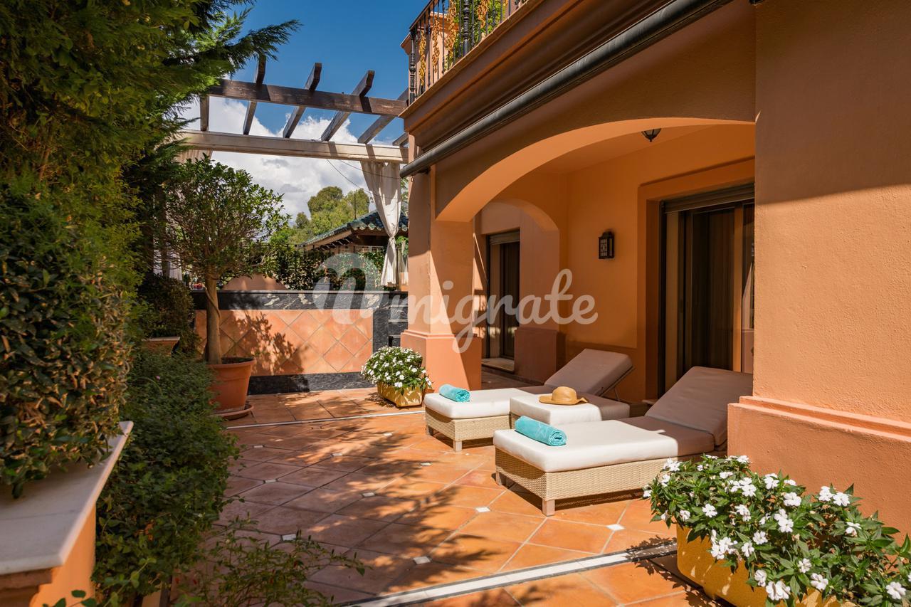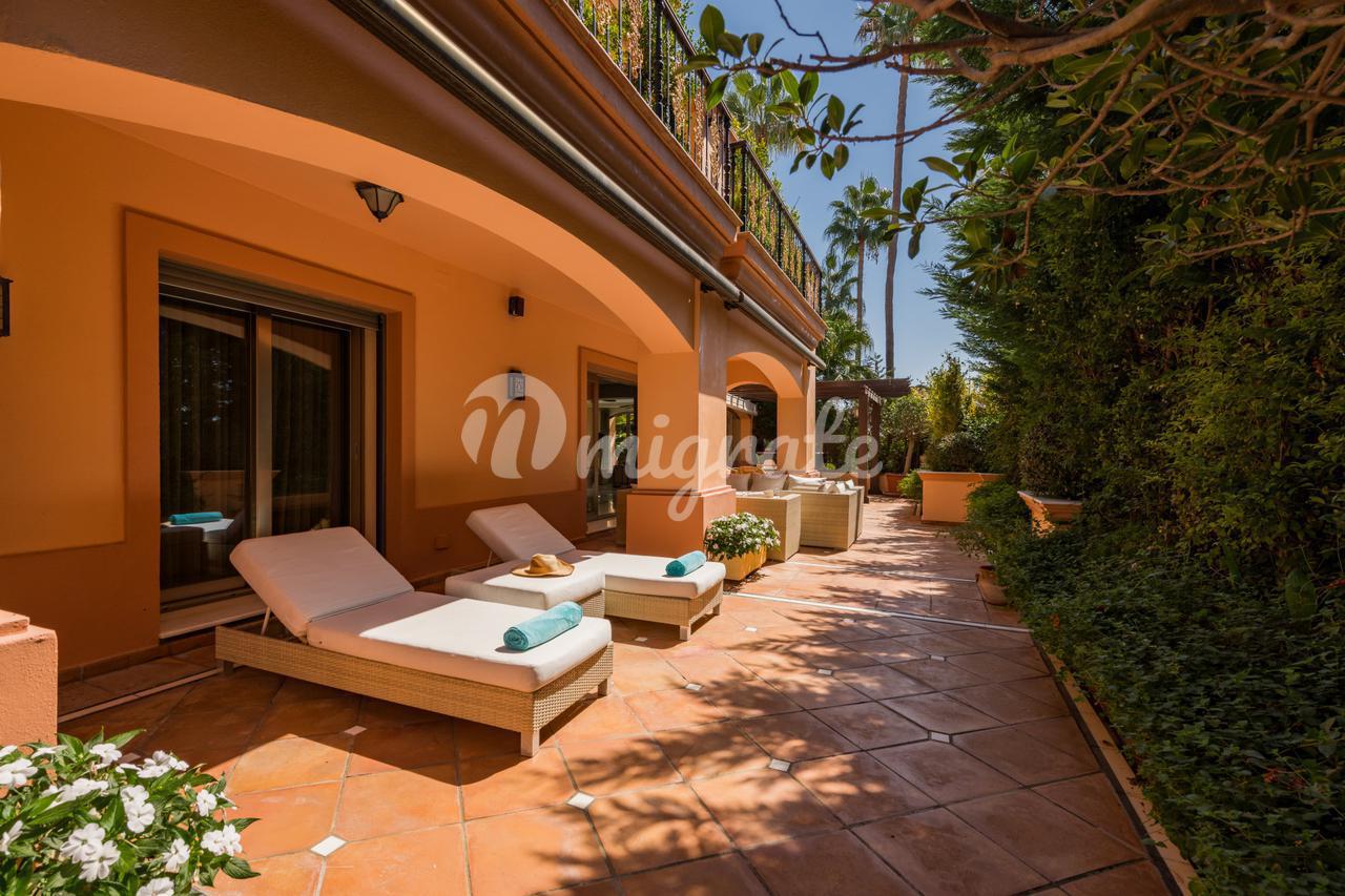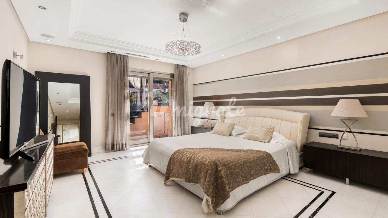 Этот удивительный дом на первом этаже с видом на воду расположен в очень хорошо оборудованном комплексе с круглосуточной охраной, недалеко от 5-звездочного отеля Guadalpin Banus и в нескольких минутах ходьбы от Пуэрто Бануса вдоль недавно построенной набережной. Сообщество пользуется общественным клубом с кафетерием, аккуратными общественными зелеными зонами, нетронутыми садами и бассейном. Роскошная отделка заметна из прихожей и зон общего пользования, украшенных яркими камнями, мрамором и благородными металлами. Эти апартаменты на первой линии пляжа предлагают удобную планировку с прихожей, гардеробной для гостей и кухней с примыкающей прачечной справа. Гостиная с камином и обеденным столом выходит окнами на юго-запад и имеет прямой выход как на западную террасу с джакузи и баром (раковина и льдогенератор), так и в частный сад на юге с прямым выходом в общую зону. В доме две спальни с двумя ванными комнатами. В обоих номерах есть встроенные шкафы.