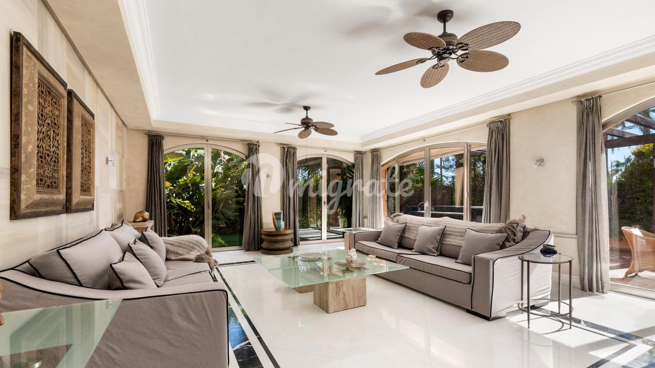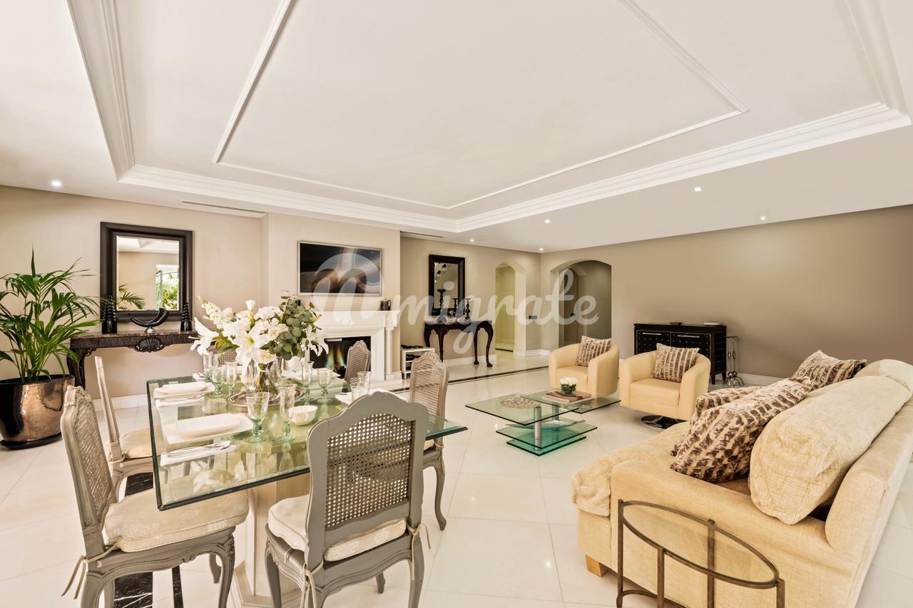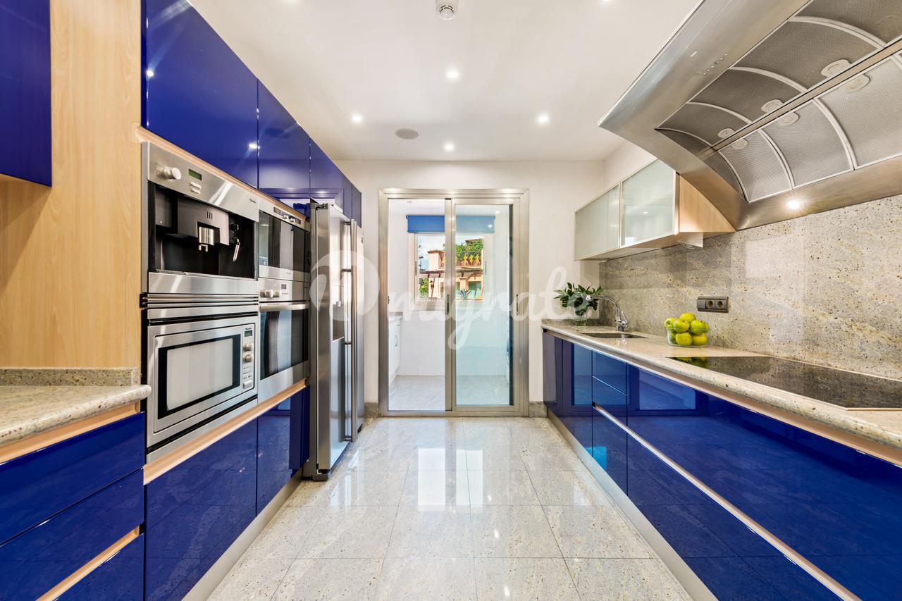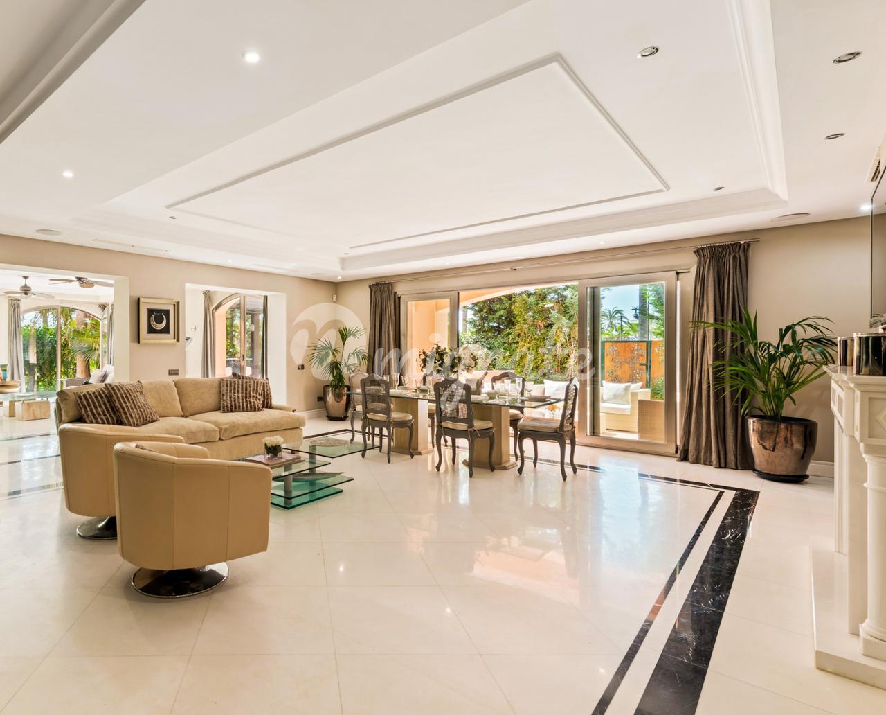 Этот удивительный дом на первом этаже с видом на воду расположен в очень хорошо оборудованном комплексе с круглосуточной охраной, недалеко от 5-звездочного отеля Guadalpin Banus и в нескольких минутах ходьбы от Пуэрто Бануса вдоль недавно построенной набережной. Сообщество пользуется общественным клубом с кафетерием, аккуратными общественными зелеными зонами, нетронутыми садами и бассейном. Роскошная отделка заметна из прихожей и зон общего пользования, украшенных яркими камнями, мрамором и благородными металлами. Эти апартаменты на первой линии пляжа предлагают удобную планировку с прихожей, гардеробной для гостей и кухней с примыкающей прачечной справа. Гостиная с камином и обеденным столом выходит окнами на юго-запад и имеет прямой выход как на западную террасу с джакузи и баром (раковина и льдогенератор), так и в частный сад на юге с прямым выходом в общую зону. В доме две спальни с двумя ванными комнатами. В обоих номерах есть встроенные шкафы.