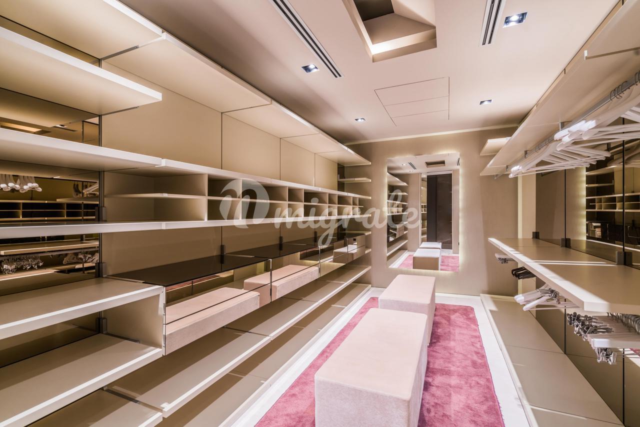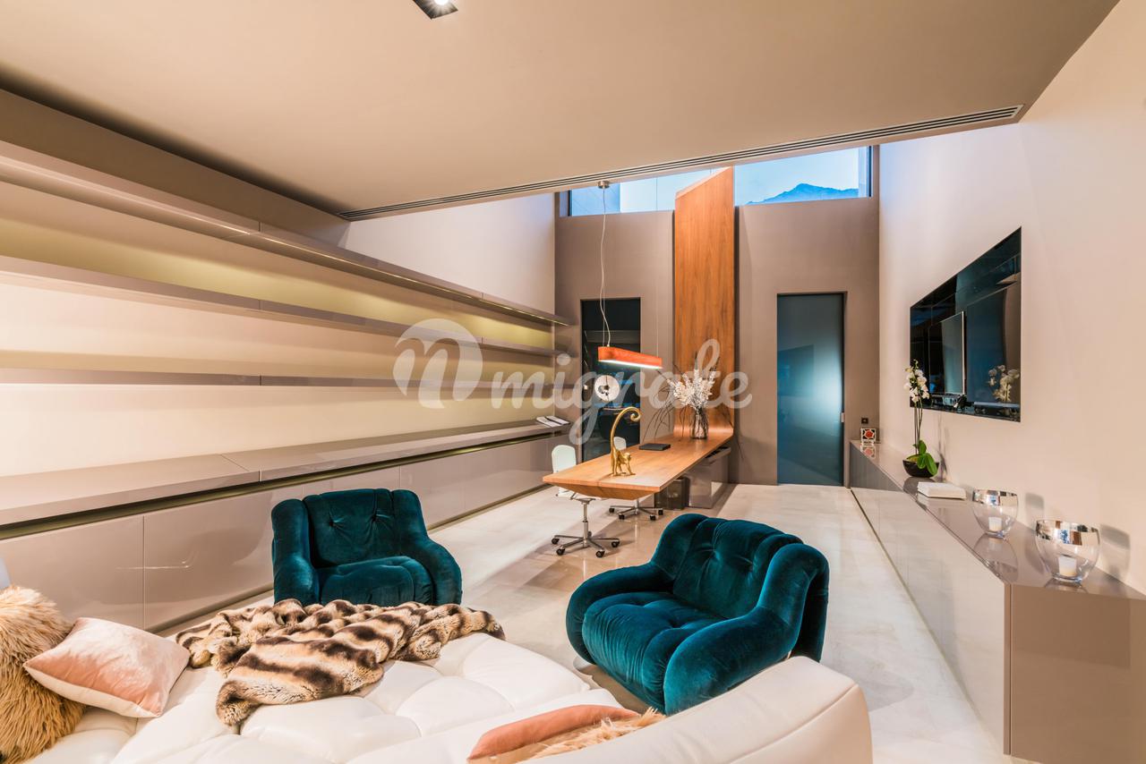 Современные цвета и материалы, такие как кожа или стекло, смешанные с золотыми произведениями искусства и украшениями, придают дому элегантность и изысканность, придавая ему эксклюзивный и неповторимый оттенок. Некоторые осветительные приборы созданы известным дизайнером Томом Диксоном.