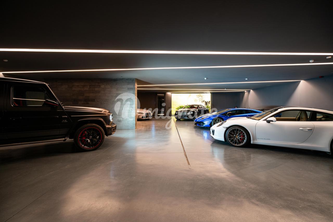 Существует оригинальный стеклянный гараж с местом для нескольких автомобилей для демонстрации коллекционных/специальных автомобилей.