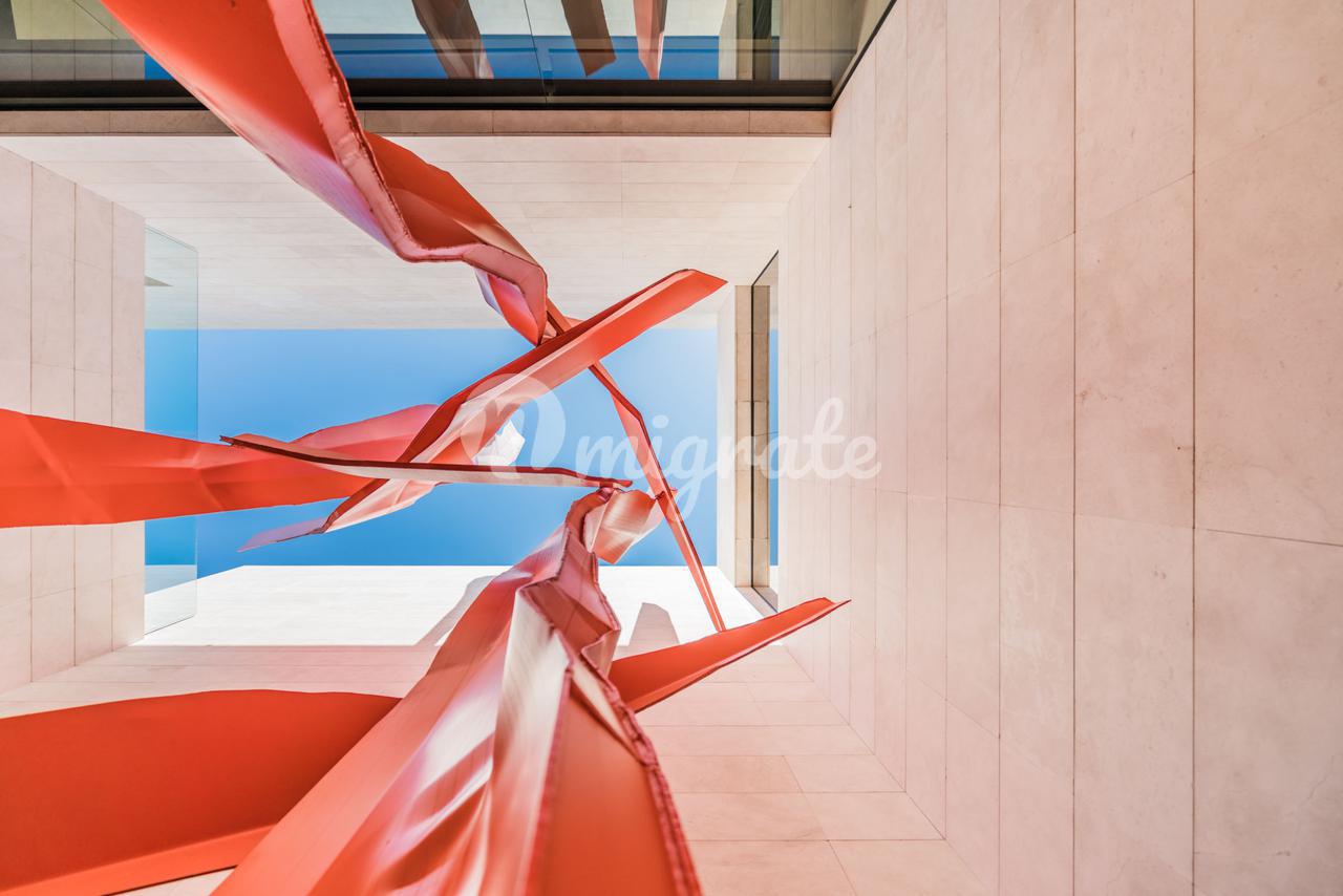 Стоит упомянуть впечатляющее произведение искусства «Эль Пульсо» известного бельгийского художника Арне Куинза. Это 15-метровая красная стальная конструкция, вокруг которой вращается дом. Это центральная точка, которая служит связующим звеном между всеми частями дома.
