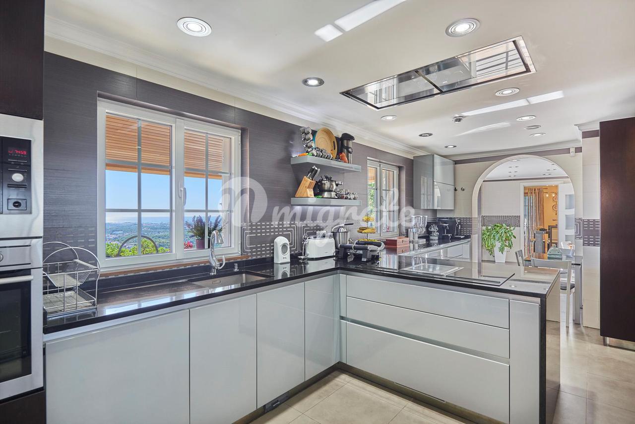 Первый этаж состоит из прихожей и внутреннего сада, трех комнат (жилых помещений) с центральным камином, гостевого санузла, спальни, кухни, кладовой и с прямым выходом на две террасы с площадкой для барбекю и обеденной зоной с видом на горы. и вид на море. На первом этаже находится главная спальня сьют с ванной комнатой, гардеробной и террасой с видом на море, вторая спальня сьют) и две спальни со встроенными шкафами и общей ванной комнатой.