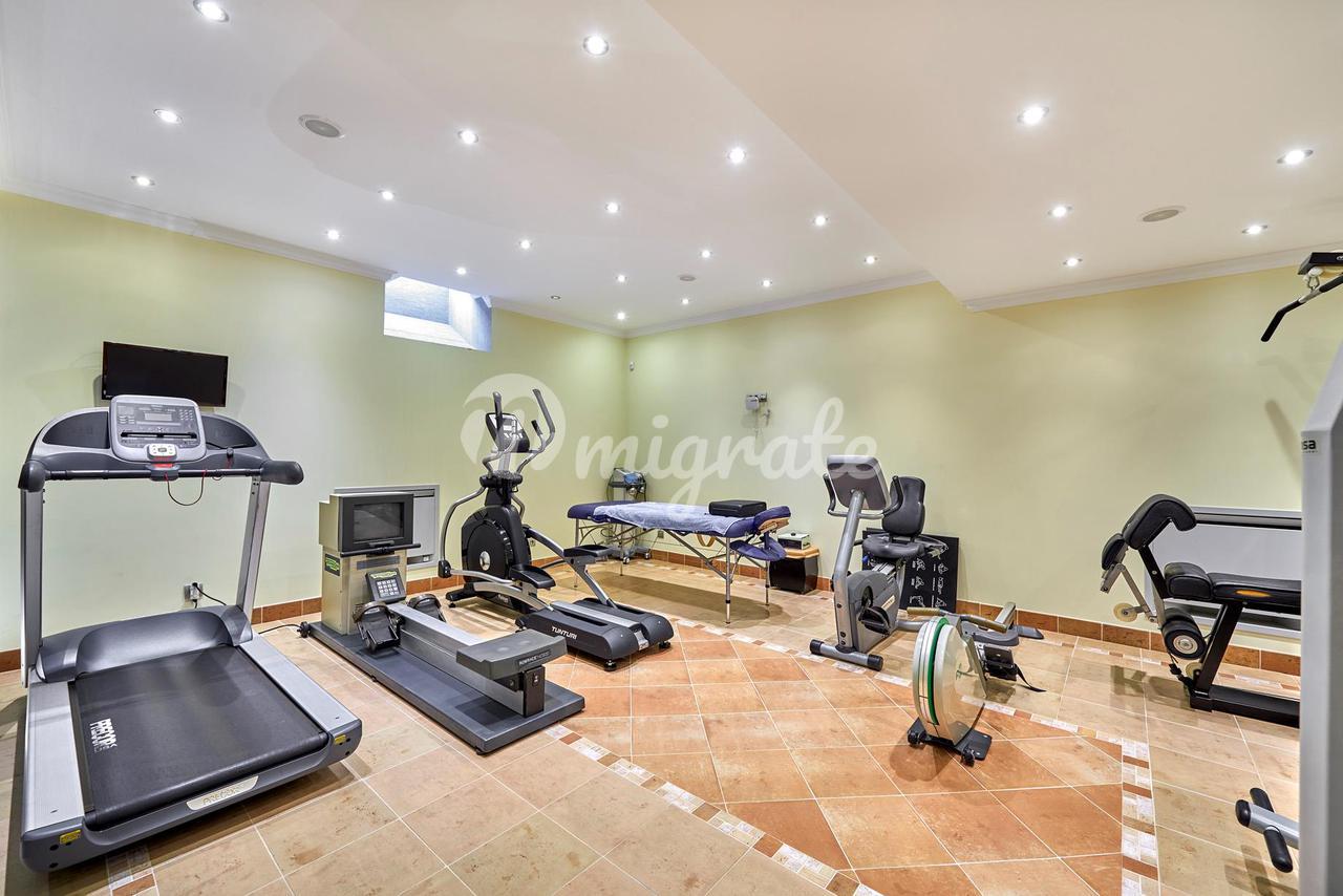 На нижнем этаже есть игровая комната, кабинет, спа-центр с крытым бассейном, джакузи, сауной, турецкой баней, тренажерным залом и раздевалками. Существует также гараж, кладовая, винный погреб и дровяной склад.
