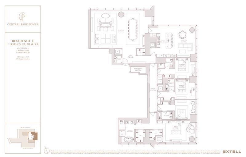Расположенная на высоте 1000 футов над Нью-Йорком, эта потрясающая двухэтажная резиденция с 4 спальнями и 4,5 ванными комнатами в Central Park Tower может похвастаться 4295 квадратными футами ультра роскошной жилой площади И САМЫМ ВЫСОКИМ ПОТОЛКОМ СРЕДИ ВСЕХ КВАРТИР. Высокие потолки 13'6 дюймов в сочетании с современной звукоизоляционной стеклянной навесной стеной, охватывающей всю резиденцию, создают великолепную открытую и воздушную жилую среду. Официальное фойе и галерея ведут в просторный большой зал, откуда открываются потрясающие панорамы северного и западного парков и реки. Открытая кухня для гурманов оснащена столешницами из каменных плит с подмонтированной раковиной, полностью интегрированной бытовой техникой Miele, включая встроенную систему приготовления кофе/ эспрессо, и шкафами на заказ от Smallbone из Devizes. Просыпайтесь каждое утро, любуясь культовым Нью-йоркским пейзажем, а по вечерам любуйтесь ослепительными закатами над Гудзоном из роскошного люкса SW corner с главной спальней, в котором есть огромная гардеробная и мраморная ванна с пятью окнами. Из дополнительных двух просторных спален с мраморными ванными комнатами открывается завораживающий вид на реку Гудзон. Расположенный на Манхэттенском Миллиардер-роу, всего в нескольких шагах от Центрального парка, этот новый архитектурный памятник возвышается на 550 футов над Нью-Йорком, что делает его самым высоким жилым зданием в мире.В этой культовой башне находится самое эксклюзивное частное заведение Нью-Йорка Central Park Club, предлагающее около 50 000 квадратных футов тщательно подобранных роскошных удобств, расположенных на трех полных этажах, каждый из которых обеспечивает уникальный опыт, дополненный пятизвездочным сервисом. Удобства клуба включают: На 100-м этаже - ресторан с полным спектром услуг, большой бальный зал и сигарный лаундж; На 14-м этаже - гостиная для резидентов, кинотеатр, гриль-бар, открытый бассейн с обслуживанием по меню и напитками и трапезой на свежем воздухе; На 16-м этаже - крытый бассейн, баскетбольная площадка на половине корта/корт для игры в сквош и ультрасовременный фитнес-центр и спа-центр с паровой баней и сауной.