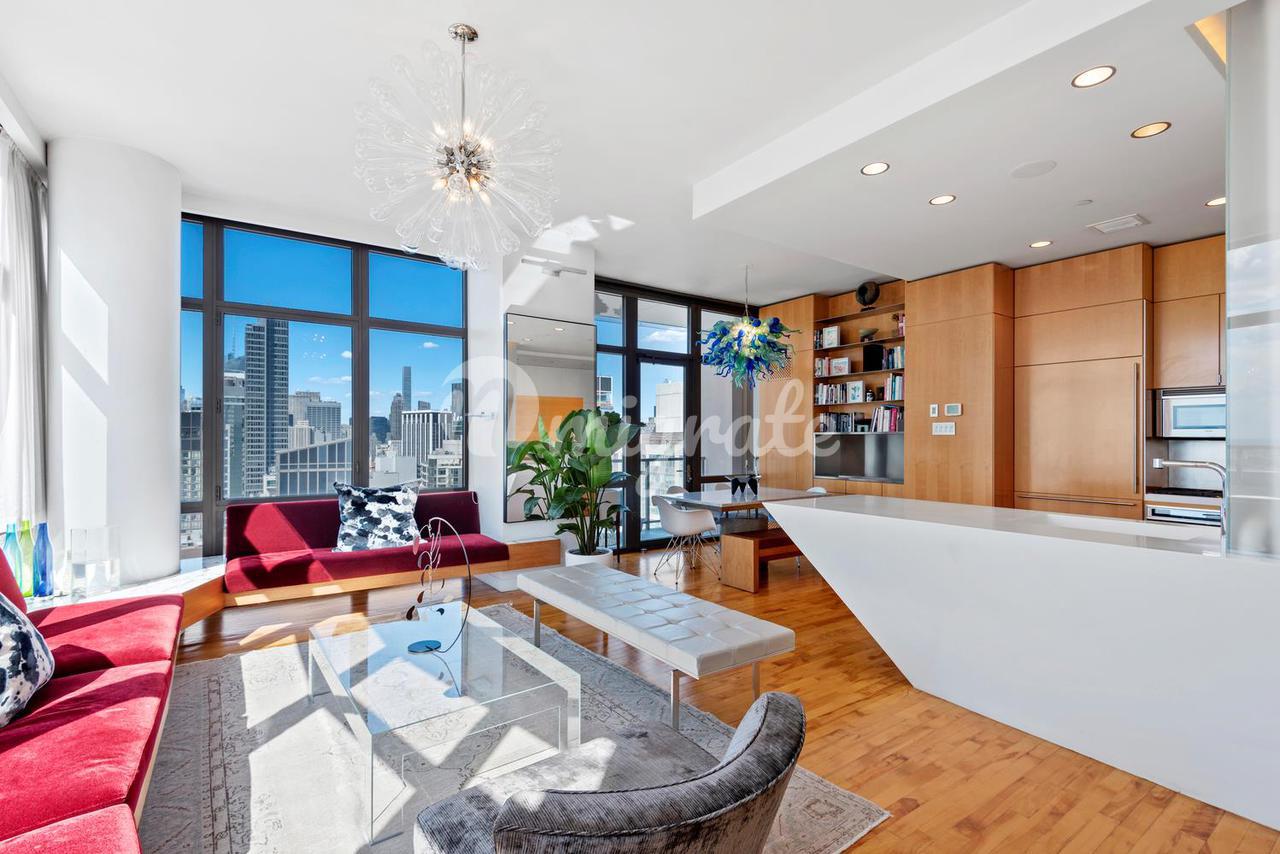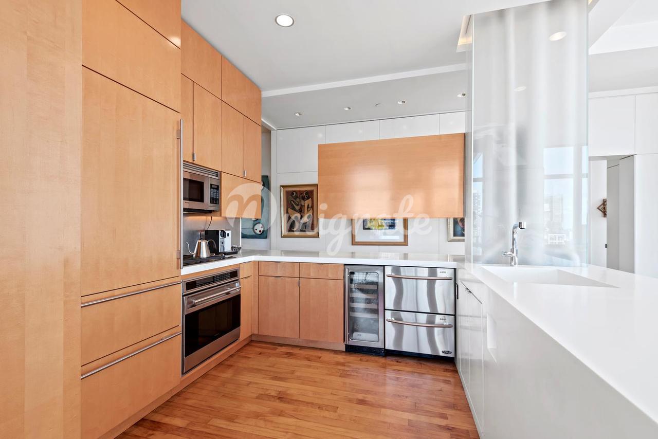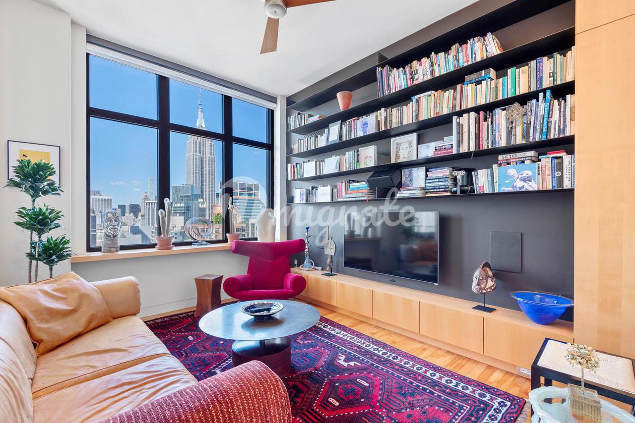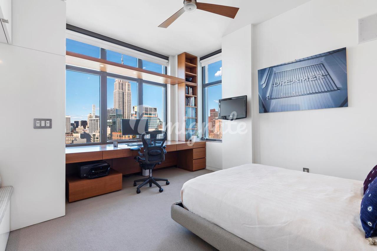 Войдя в этот пентхаус, вы сразу же поразитесь парящим 11-футовым потолкам и потрясающим видам на Мидтаун и реку Гудзон через окна от пола до потолка, от стены до стены, окутывающие всю большую комнату. Из обеденной зоны вы можете выйти на собственный балкон площадью 65 кв. футов с видом к северу от Эмпайр-стейт-билдинг и дальше, а из гостиной у вас есть доступ к ландшафтной террасе площадью 448 кв. футов со встроенным освещением и звуком. Залитая солнцем терраса с видом на парк 432 и Башню Свободы. Кухня — мечта шеф-повара, с современным открытым дизайном, угловыми столешницами и островом Corian, большой раковиной, холодильником Sub Zero, микроволновой печью Viking, плитой Wolf и посудомоечной машиной Fischer Paykal с двумя ящиками, а также винным холодильником на 18 бутылок. Вся кухня и столовая обшиты панелями из тигрового клена и изготовленной на заказ мебелью, в том числе плавающий шкаф, прикрепленный к стеклянным стоякам, и безвентиляционный камин.