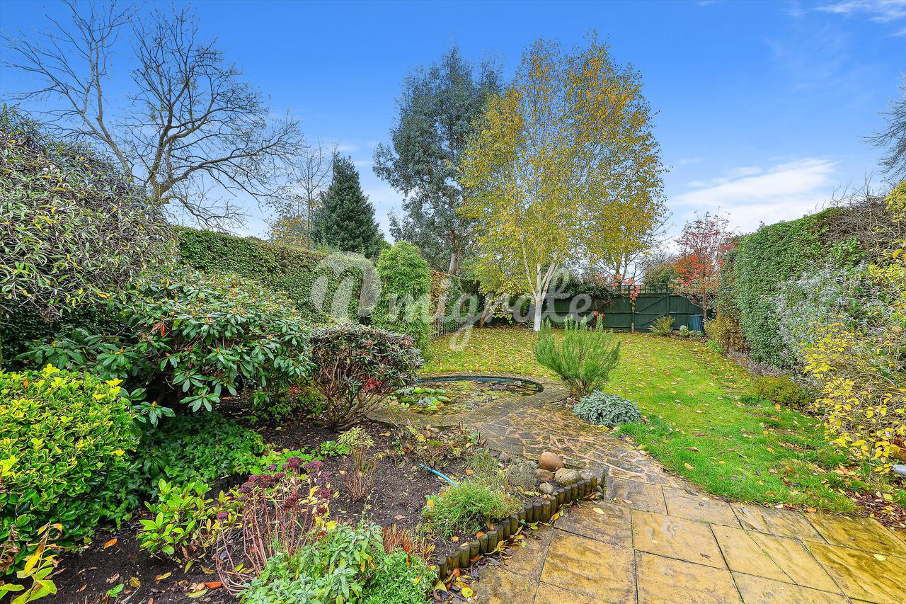Частично огороженный и очень уединенный боковой дворик был бы отличным местом для огорода с травами в кухонном контейнере. Дорожка ведет к ровному газону с красивыми зрелыми бордюрами, придающими ему колорит и интерес. В глубине сада высится прекрасная серебристая береза, а небольшой декоративный пруд добавляет еще больше интереса.