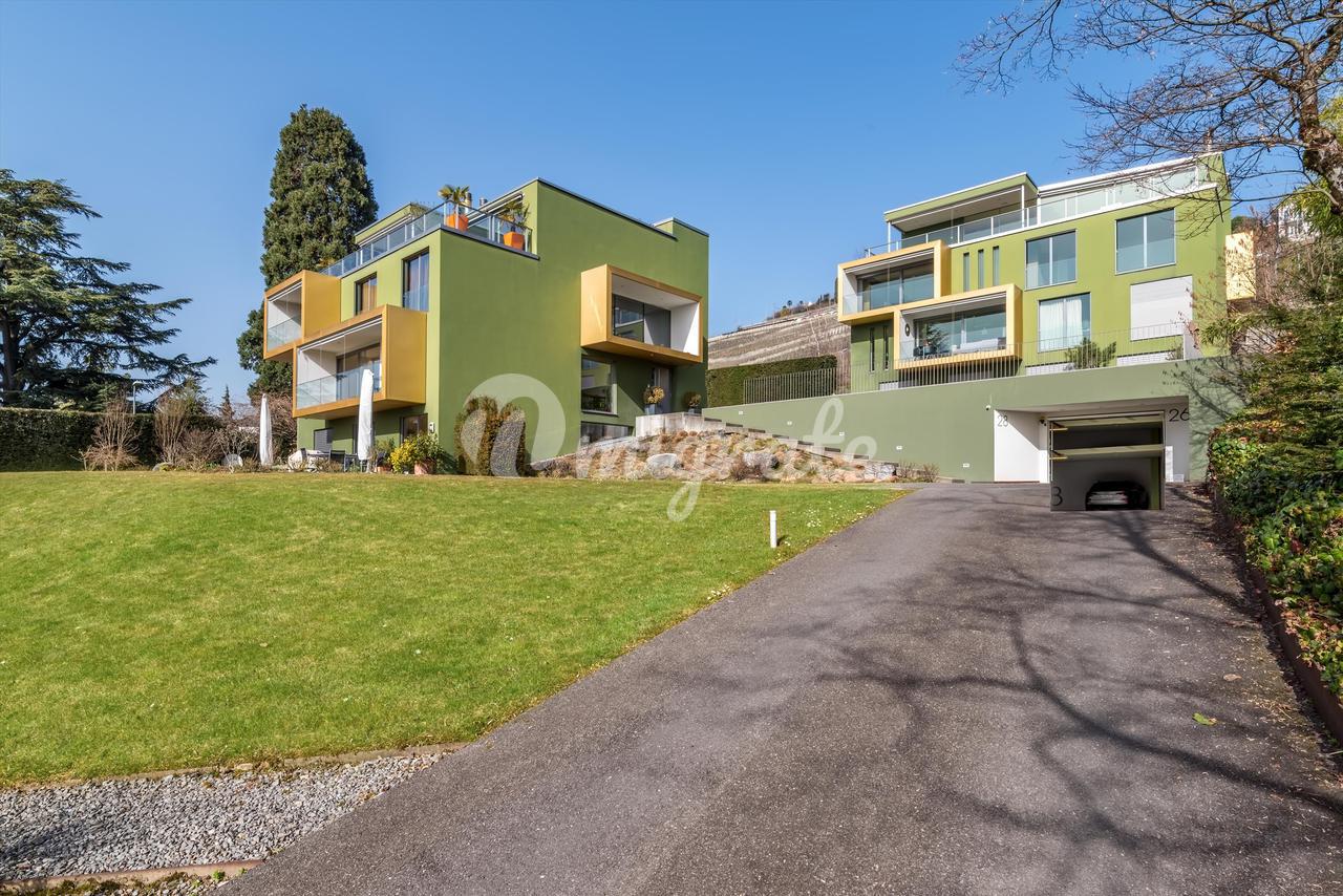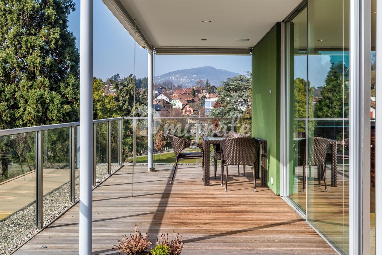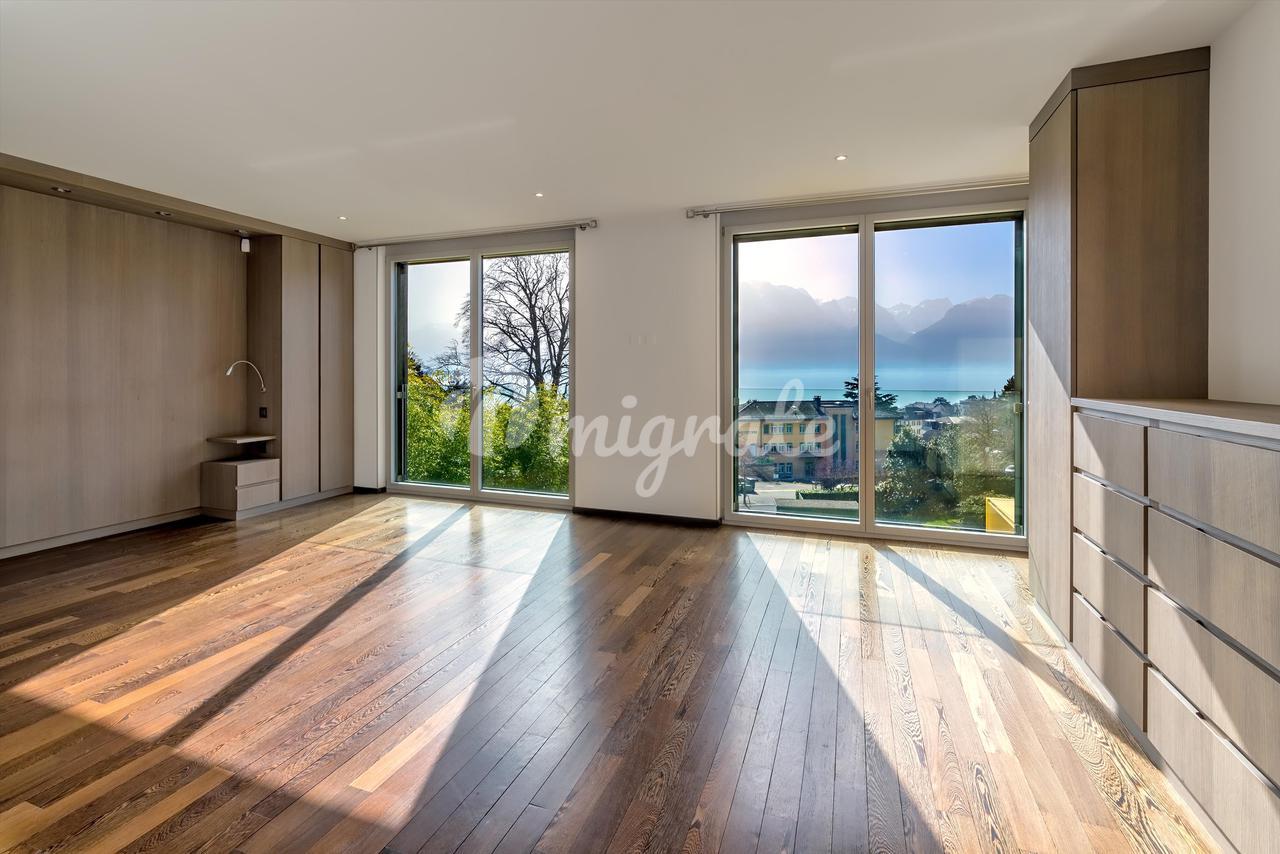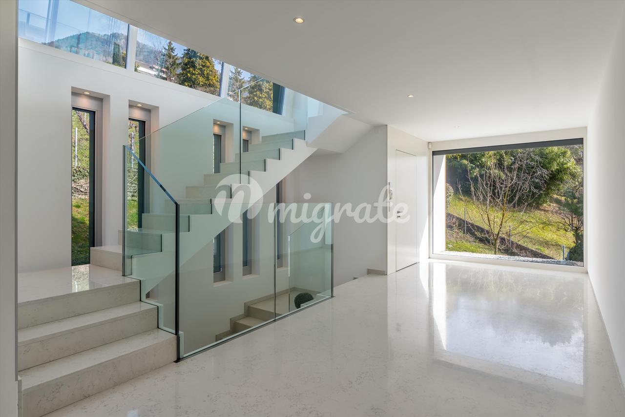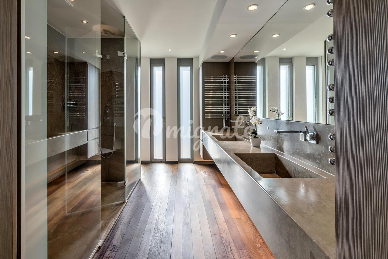 Дизайн интерьера был продуман до мелочей с большим количеством встроенных мест для хранения, сделанной на заказ мебелью в современном стиле. Просторные номера предлагают вам максимальный комфорт в идиллической обстановке, а южная ориентация обеспечивает оптимальное освещение в течение дня. С террасы открывается 360-градусный вид на озеро и горы. Вход в квартиру находится на втором этаже, куда можно подняться на частном лифте. На первом этаже есть спальная зона с первой спальней, с гардеробной и выходом на балкон с возможностью добавить душевую комнату, вторая спальня с гардеробной и ванной комнатой, а также подсобное помещение. На верхнем этаже находится просторная гостиная с выходом на террасу, открытая кухня с винным погребом и большая частично крытая терраса.