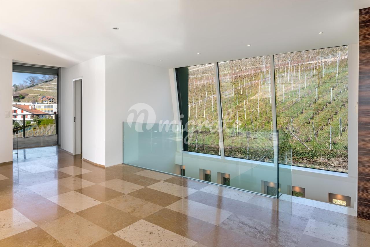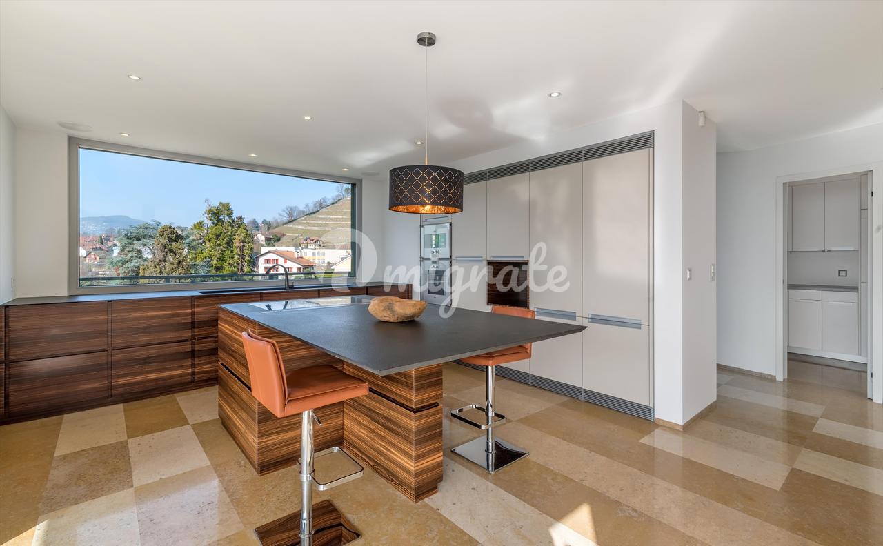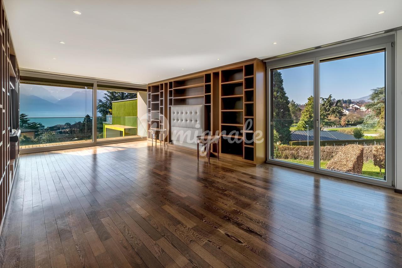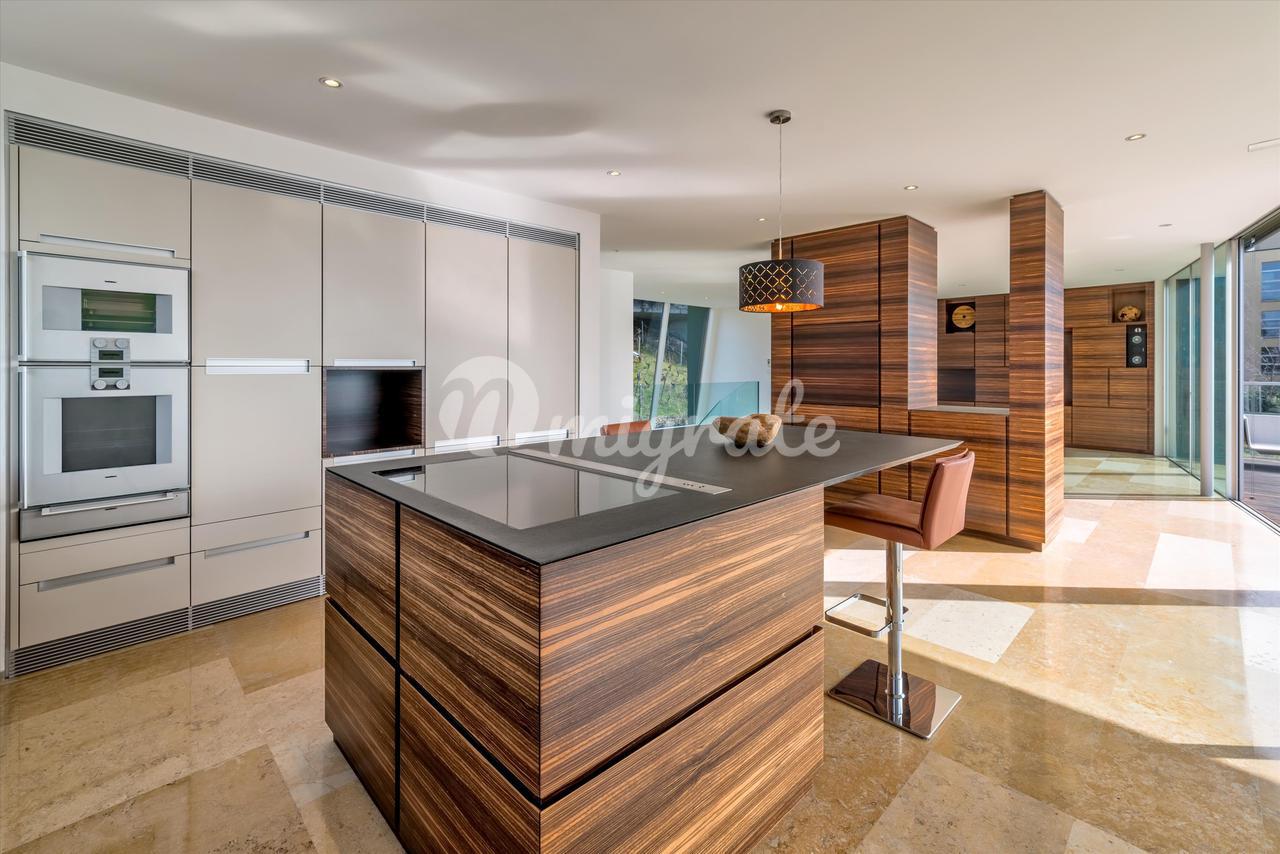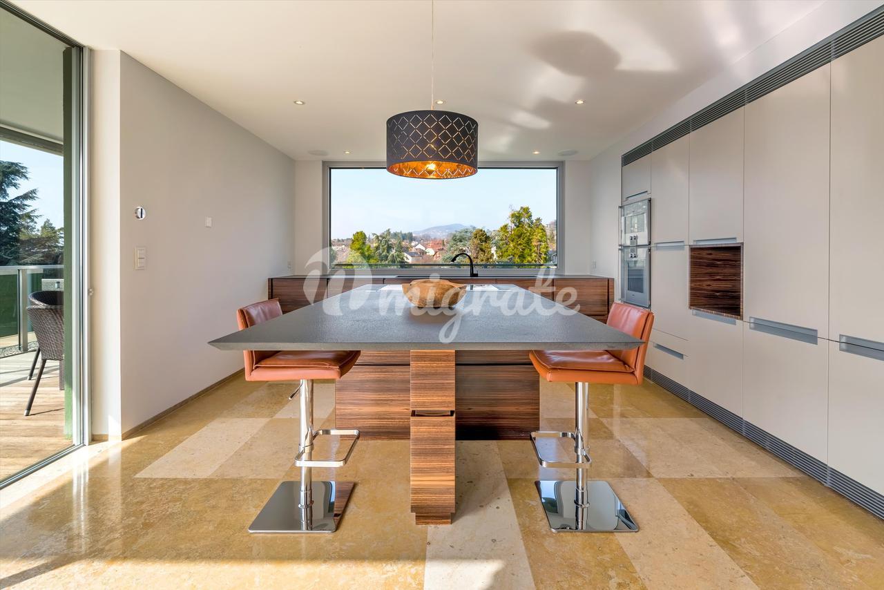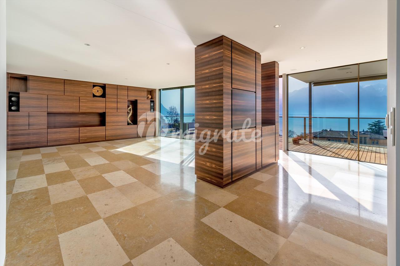 Дизайн интерьера был продуман до мелочей с большим количеством встроенных мест для хранения, сделанной на заказ мебелью в современном стиле. Просторные номера предлагают вам максимальный комфорт в идиллической обстановке, а южная ориентация обеспечивает оптимальное освещение в течение дня. С террасы открывается 360-градусный вид на озеро и горы. Вход в квартиру находится на втором этаже, куда можно подняться на частном лифте. На первом этаже есть спальная зона с первой спальней, с гардеробной и выходом на балкон с возможностью добавить душевую комнату, вторая спальня с гардеробной и ванной комнатой, а также подсобное помещение. На верхнем этаже находится просторная гостиная с выходом на террасу, открытая кухня с винным погребом и большая частично крытая терраса.