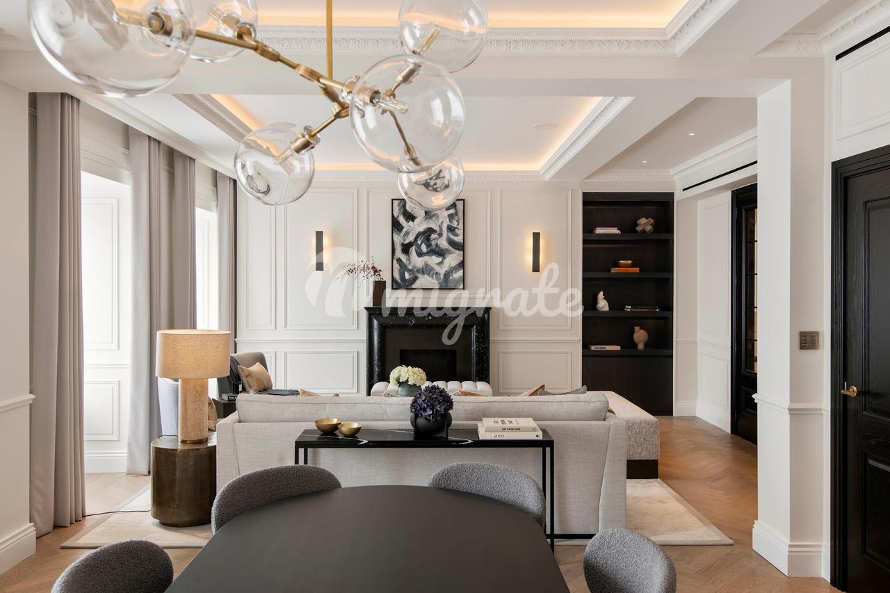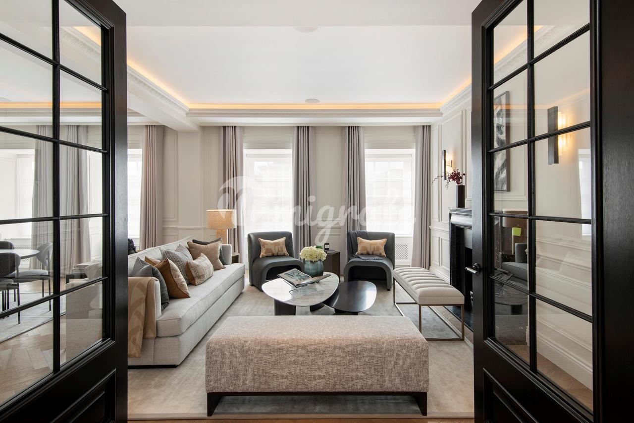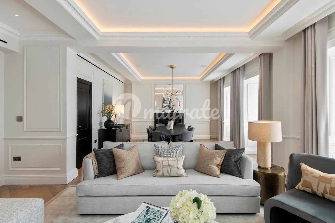 Эта впечатляющая квартира залита естественным светом, а безупречно отделанные детали создают ощущение роскоши. До него можно добраться на лифте из большого вестибюля Claridge House, отель расположен на шестом этаже. При входе в дом вас встречает потрясающе просторная прихожая, ведущая в жилое и развлекательное пространство. Двустворчатые двери из темного дерева способствуют плавному переходу жилого пространства. Большая приемная/столовая отличается впечатляющей высотой потолков и двумя сделанными на заказ каминами из черного мрамора.