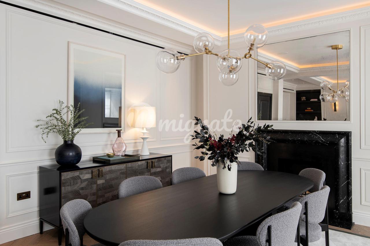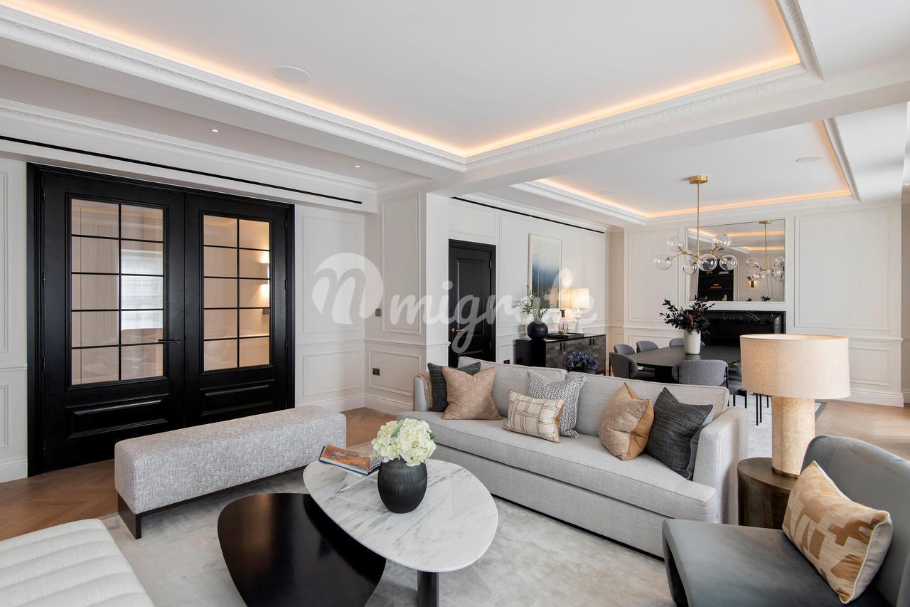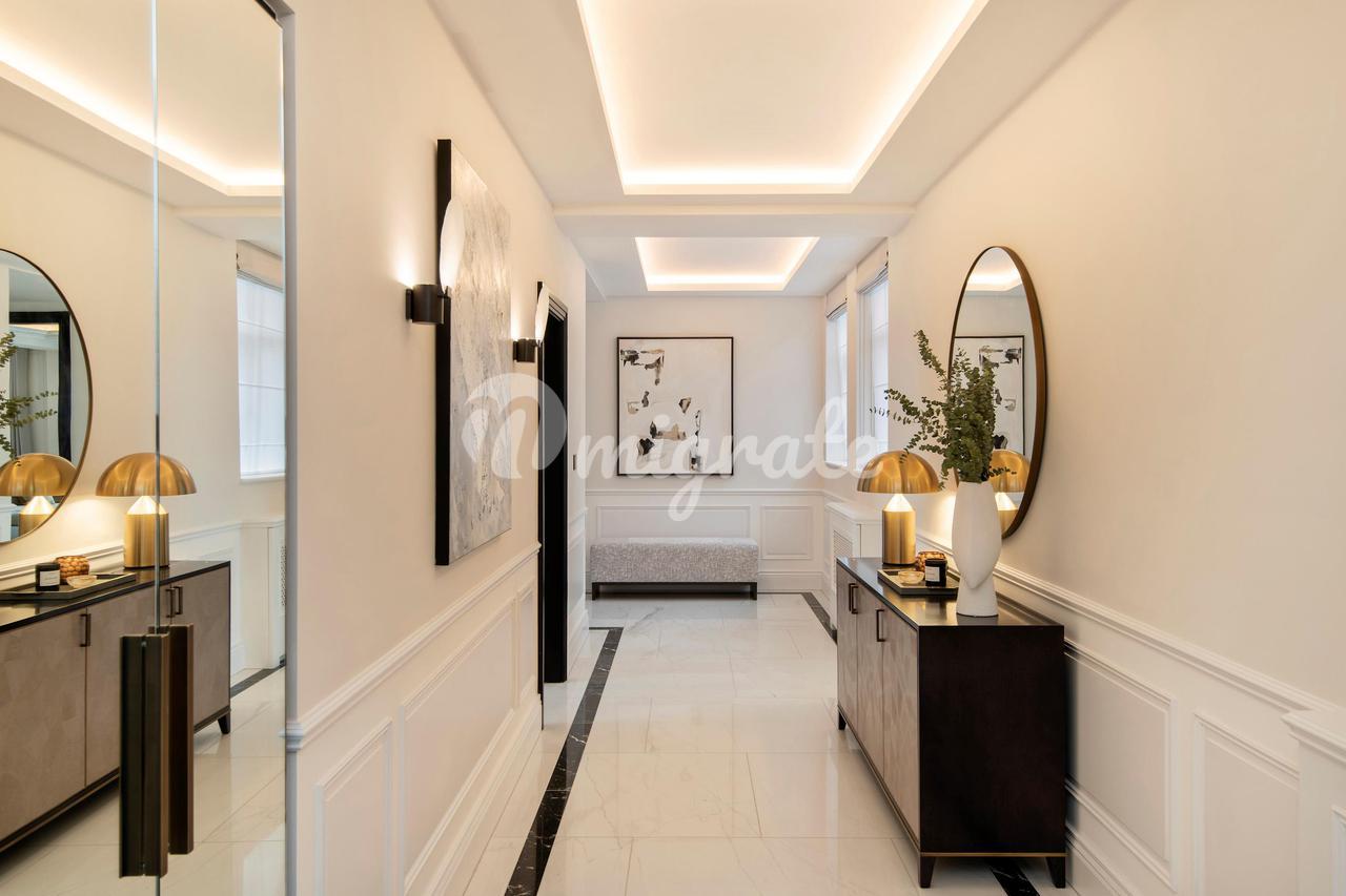 Эта впечатляющая квартира залита естественным светом, а безупречно отделанные детали создают ощущение роскоши. До него можно добраться на лифте из большого вестибюля Claridge House, отель расположен на шестом этаже. При входе в дом вас встречает потрясающе просторная прихожая, ведущая в жилое и развлекательное пространство. Двустворчатые двери из темного дерева способствуют плавному переходу жилого пространства. Большая приемная/столовая отличается впечатляющей высотой потолков и двумя сделанными на заказ каминами из черного мрамора.