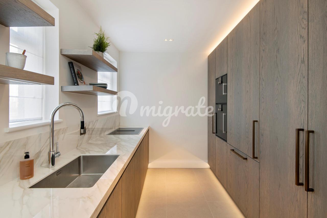 Потрясающий дизайн кухни высочайшего качества со встроенной бытовой техникой Gaggenau, мраморными рабочими поверхностями и декоративным освещением.