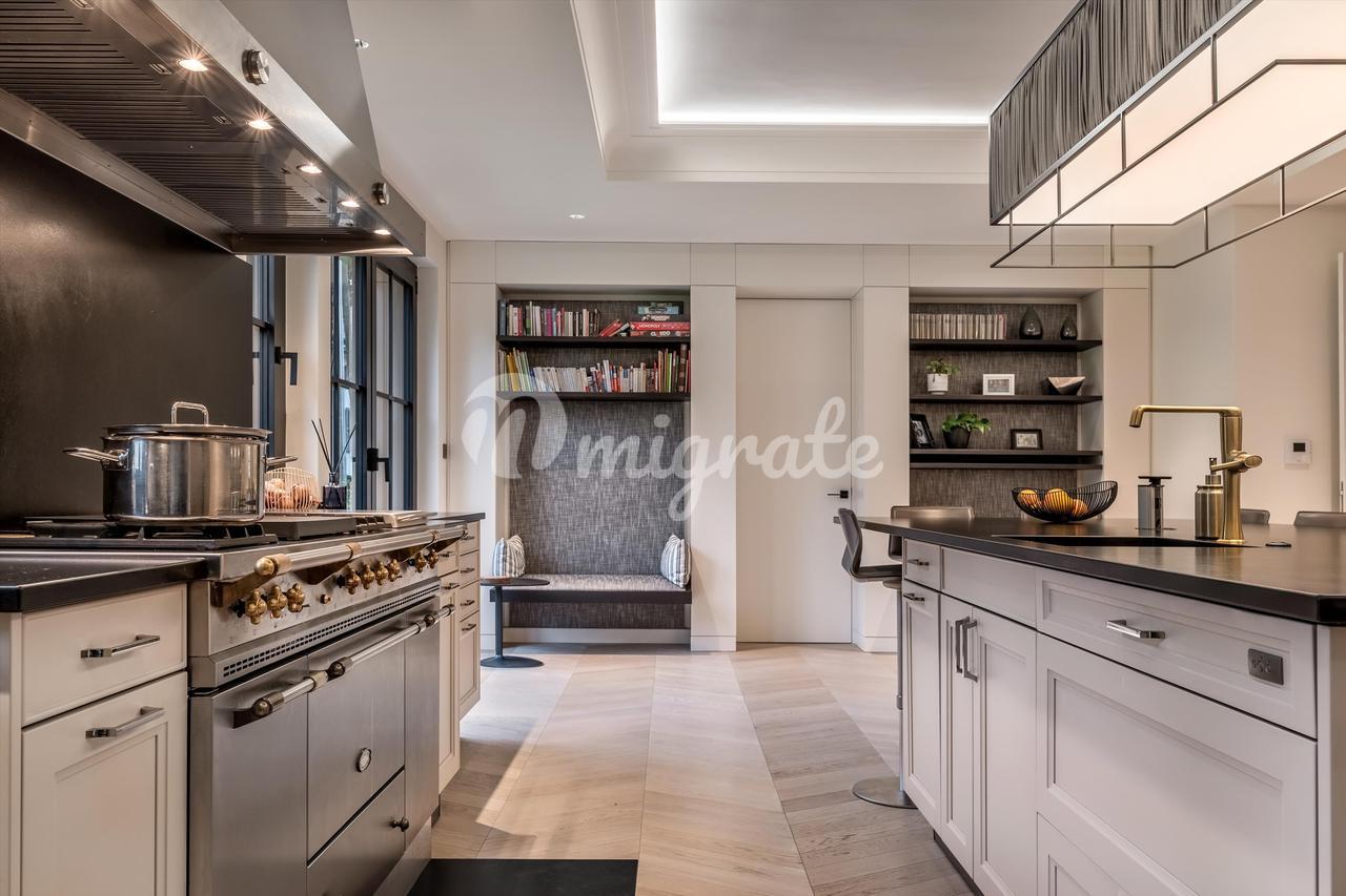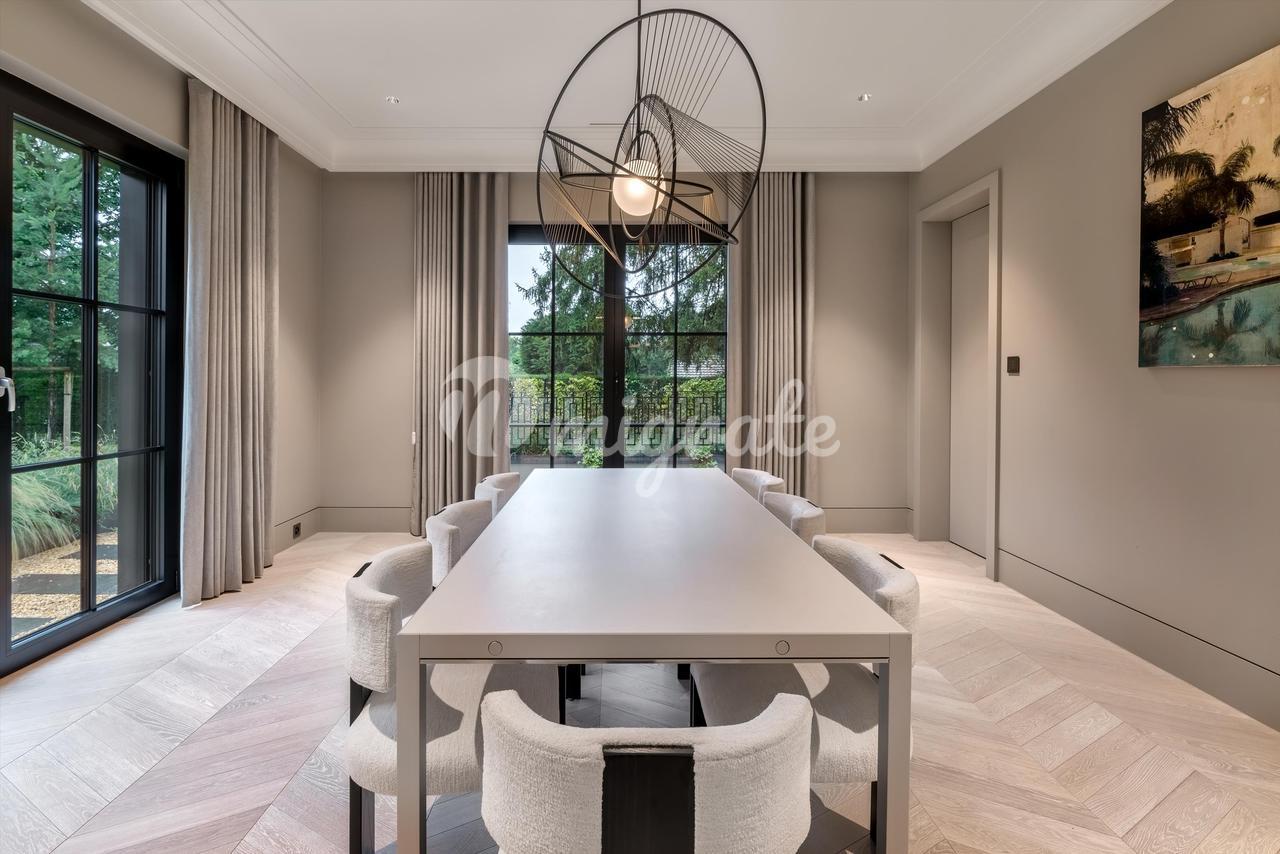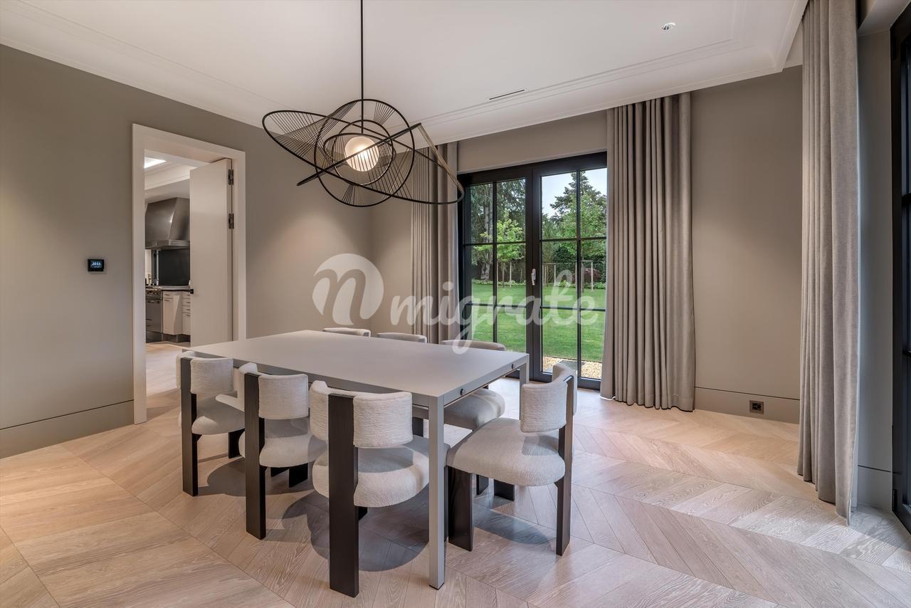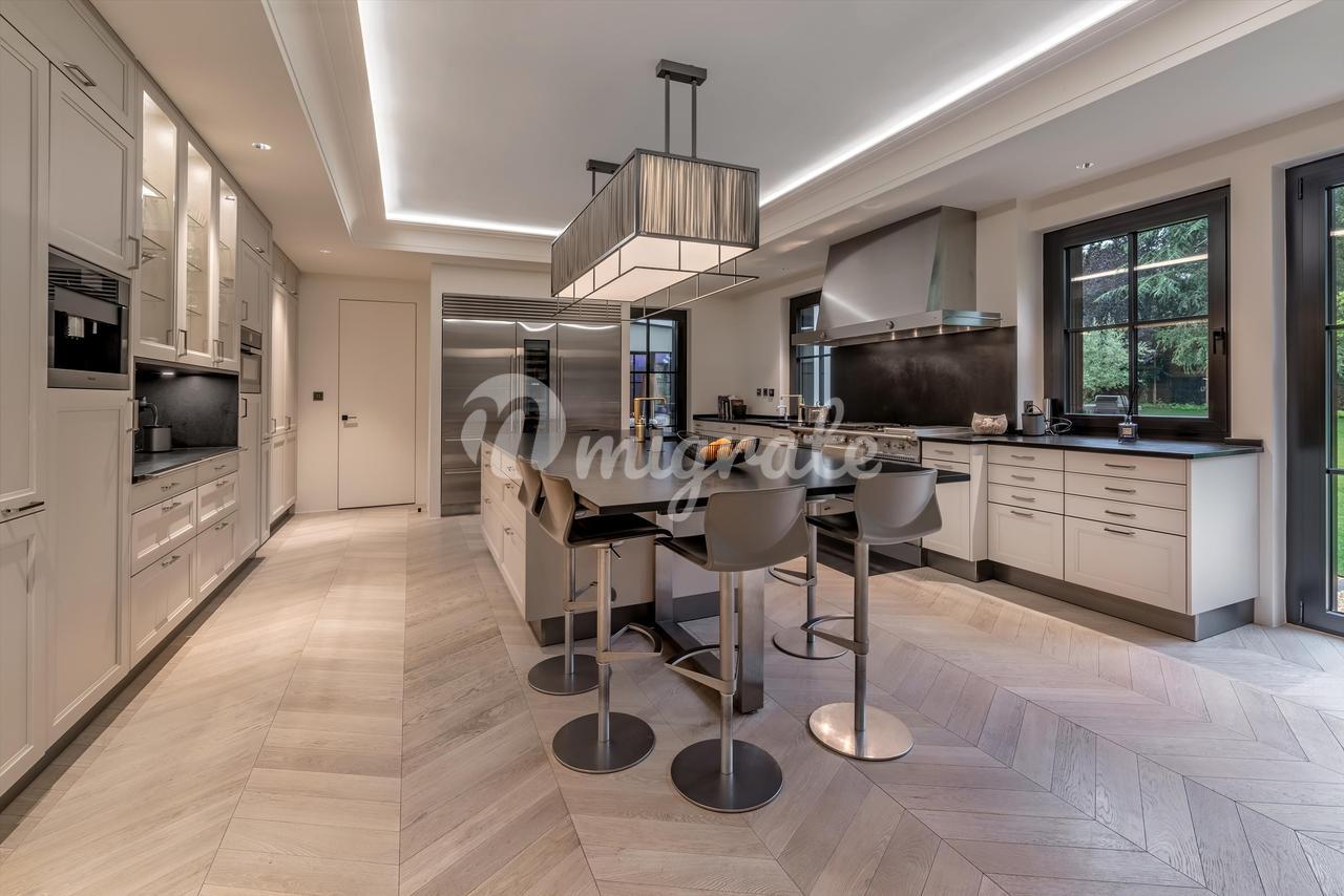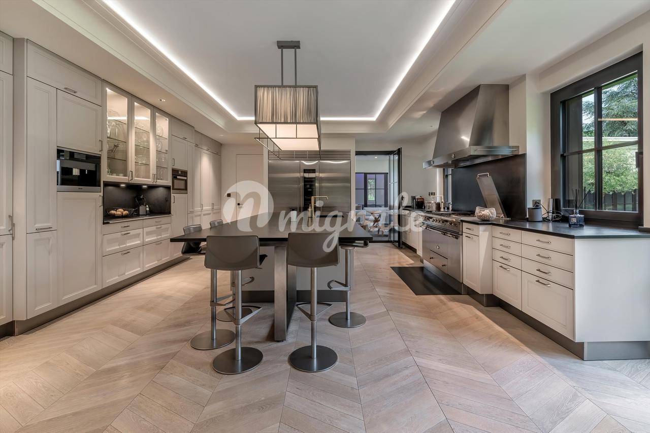 Недвижимость расположена на участке площадью более 2 200 кв. м. Жилая площадь дома составляет около 200 кв. м. На первом этаже находится прихожая, гардеробная, полностью оборудованная кухня, столовая, гостиная, прачечная и гостевой туалет.