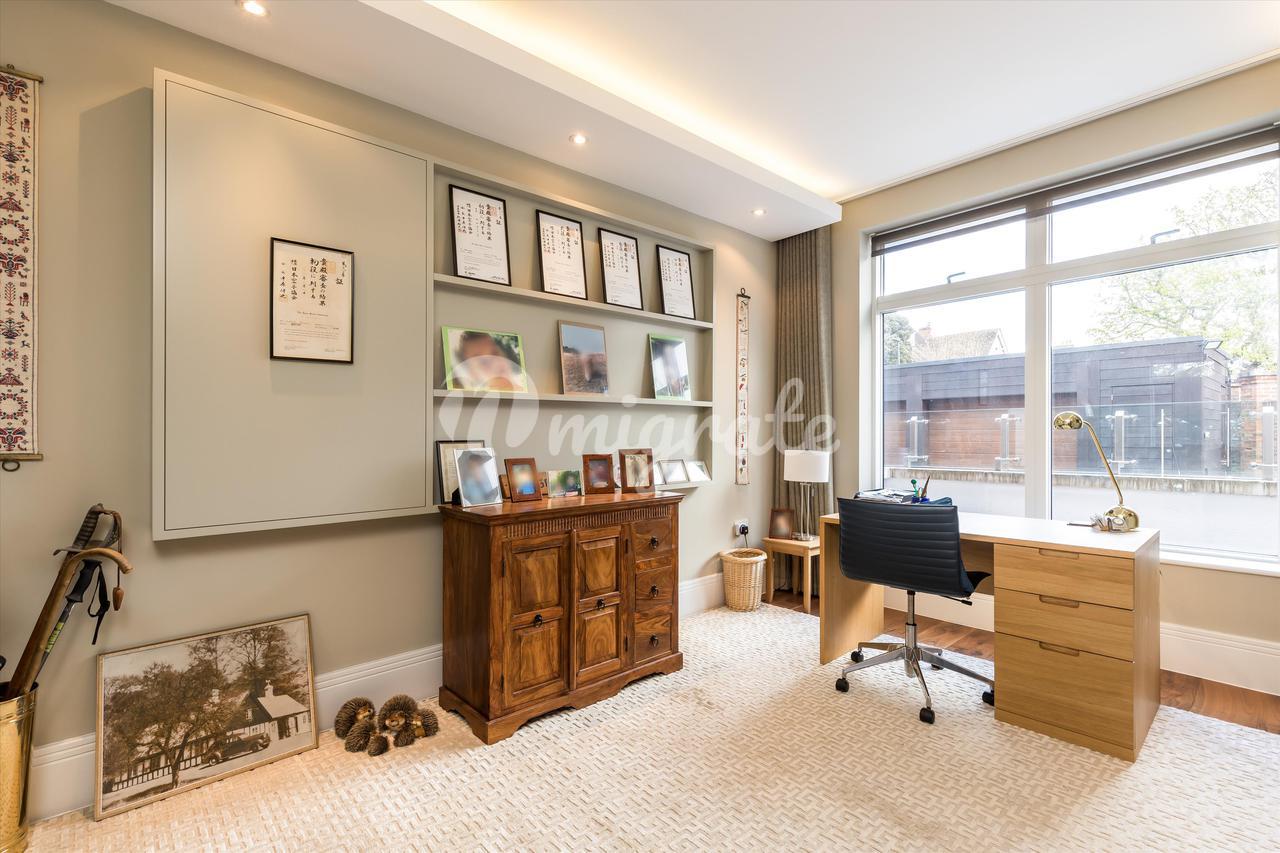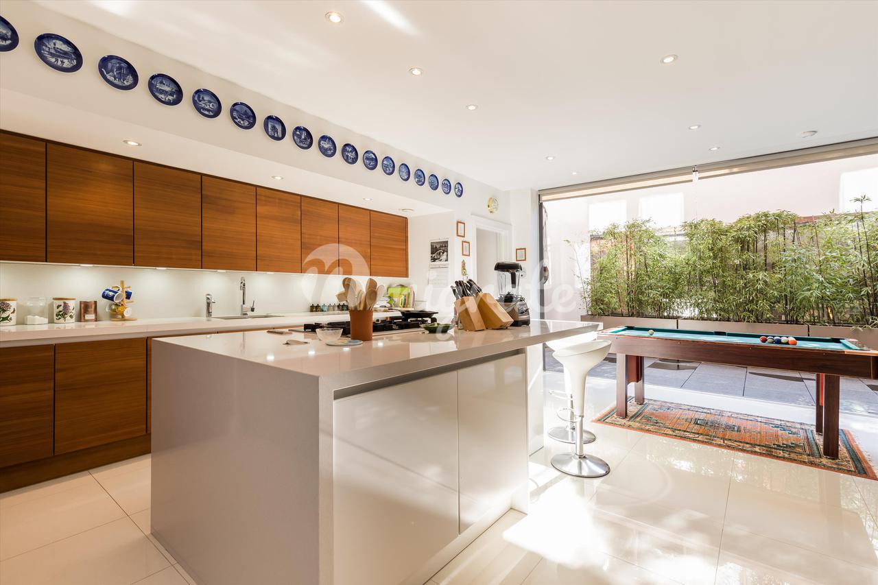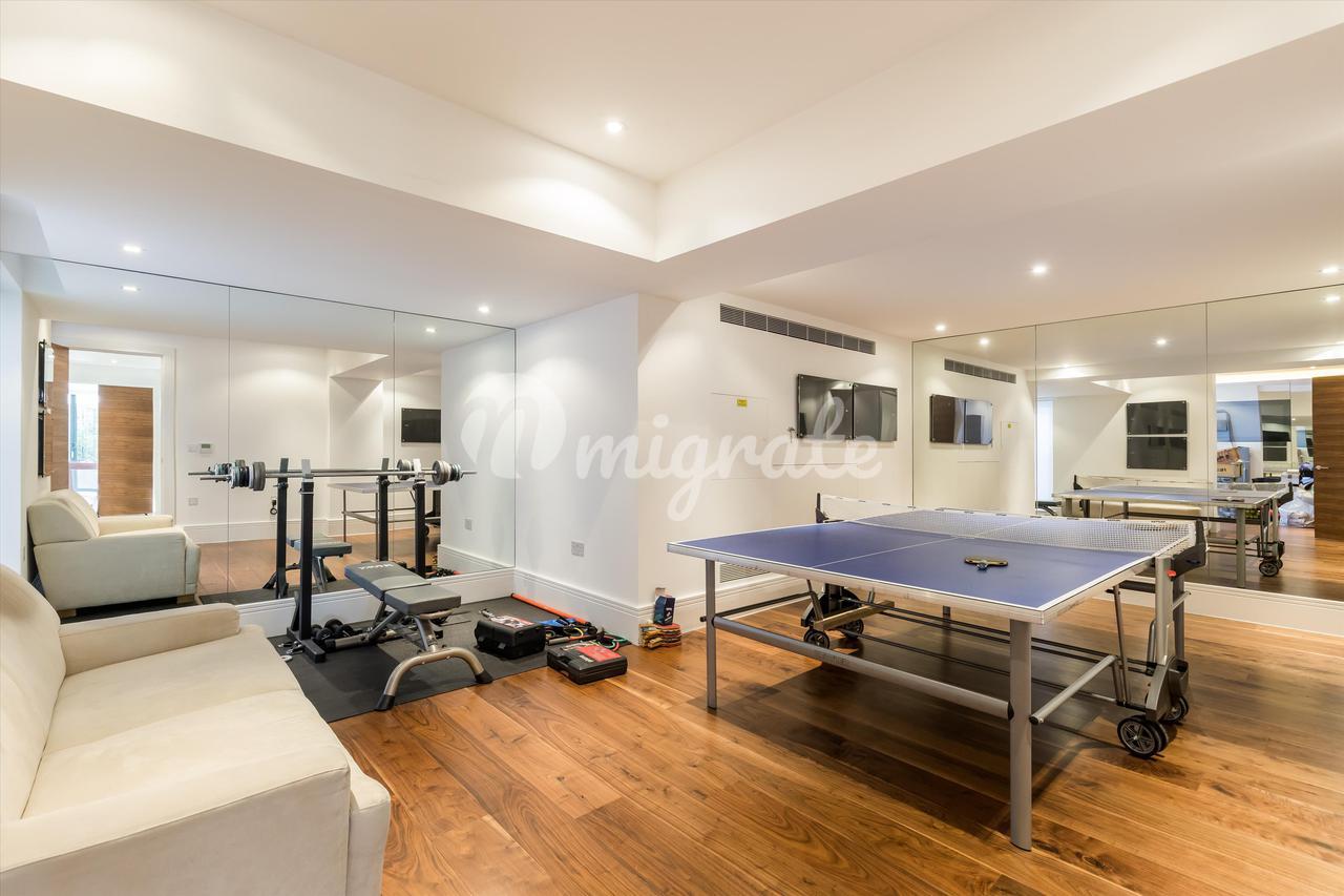 Расположенный в частном охраняемом конюшне, на первом этаже этого дома есть прихожая; формальная гостиная с видом на сад и выходом в сад; столовая с лифтом «тупого официанта» из кухни внизу; и гардероб. На цокольном этаже находится исключительно светлая и просторная кухня/комната для завтрака/общая комната с двустворчатыми дверями, ведущими на террасу. Кроме того, на этом этаже есть полностью оборудованный кинозал, тренажерный зал, сауна, игровая и душевая.