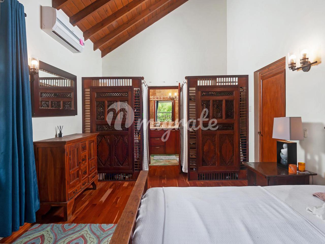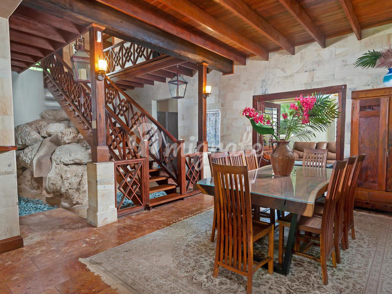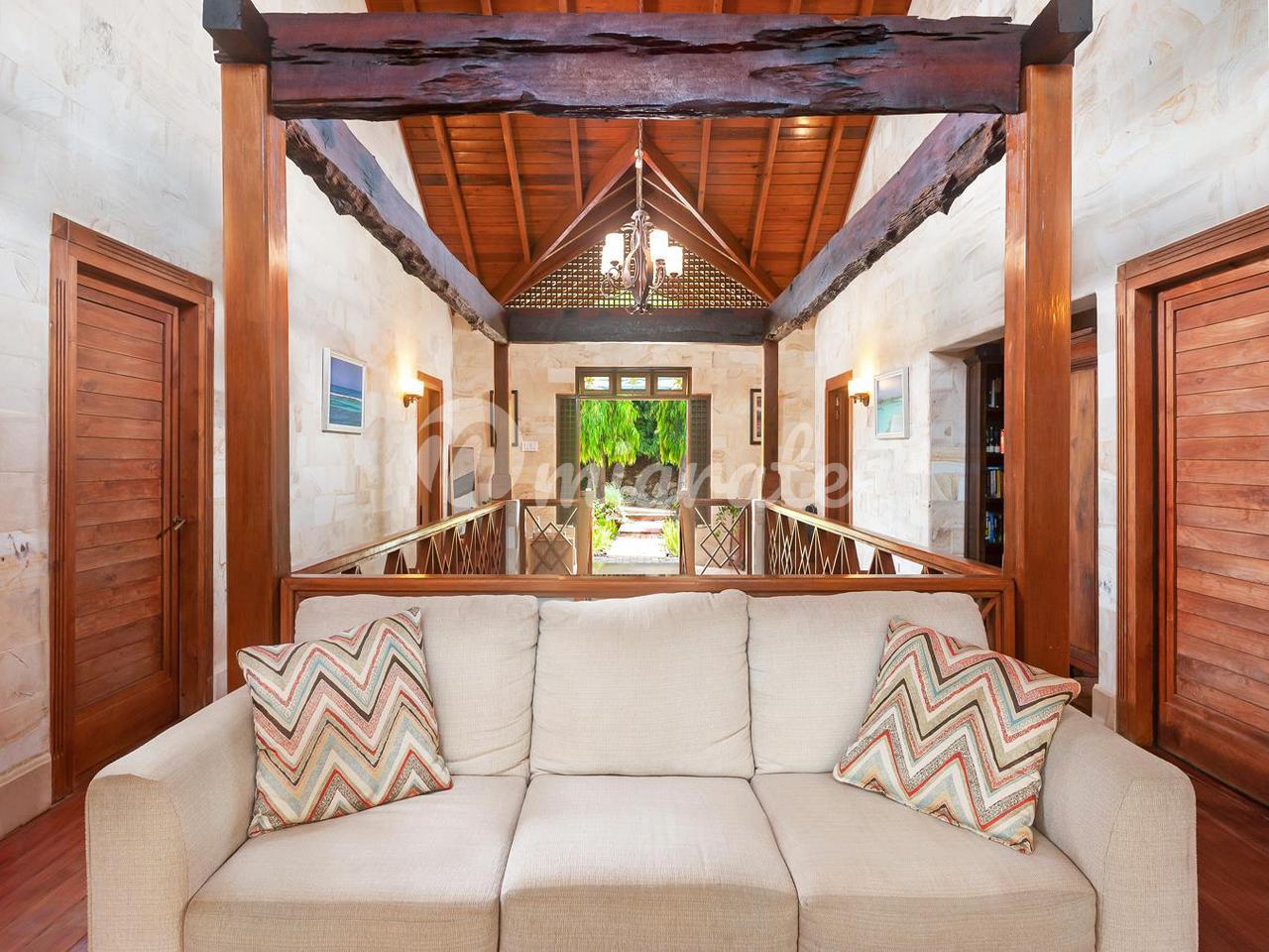 Что касается экстерьера, то инновационное использование старинных и восстановленных материалов производит впечатляющее впечатление. Кирпичи, использованные для строительства дорожки, ведущей к входной двери, и внутреннего дворика на нижнем этаже, были спасены с кораблей, где они использовались в качестве балластов с 18 века, а круглый стол, установленный на нем, является антиквариатом из Индонезии. У входной двери опорные столбы изготовлены из материалов, добытых на заводах по производству сахарного тростника на Барбадосе. Внутри помещения на первом этаже находится главная спальня, в которой есть комод, антикварные двери и кровать, привезенные из Индонезии, а на всех окнах в доме кованое железо, добытое на фабриках по производству сахарного тростника. 3 гостевые спальни и 1 гостевая ванная комната также занимают этот уровень. Гостиная наверху ведет на верхнюю палубу, в то время как центральная лестница с перилами в викторианском стиле ведет вниз на нижний уровень. Под лестницей находится водопад, в котором ранее располагался пруд с кои.