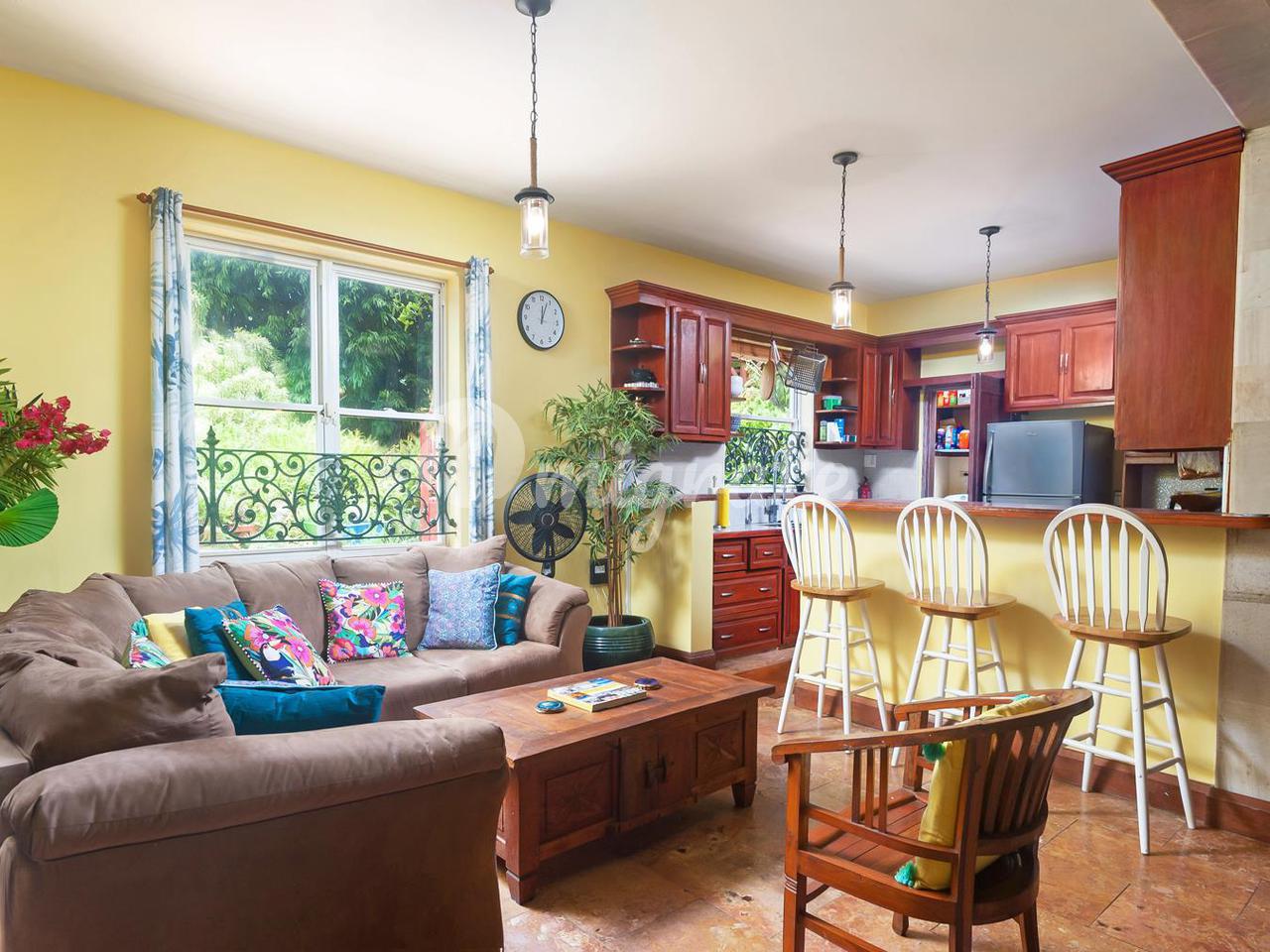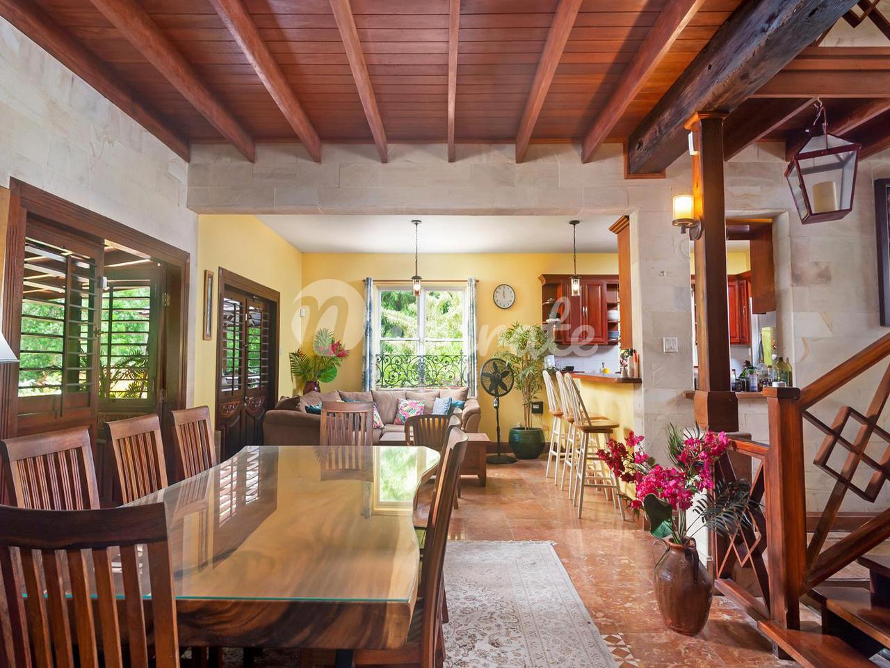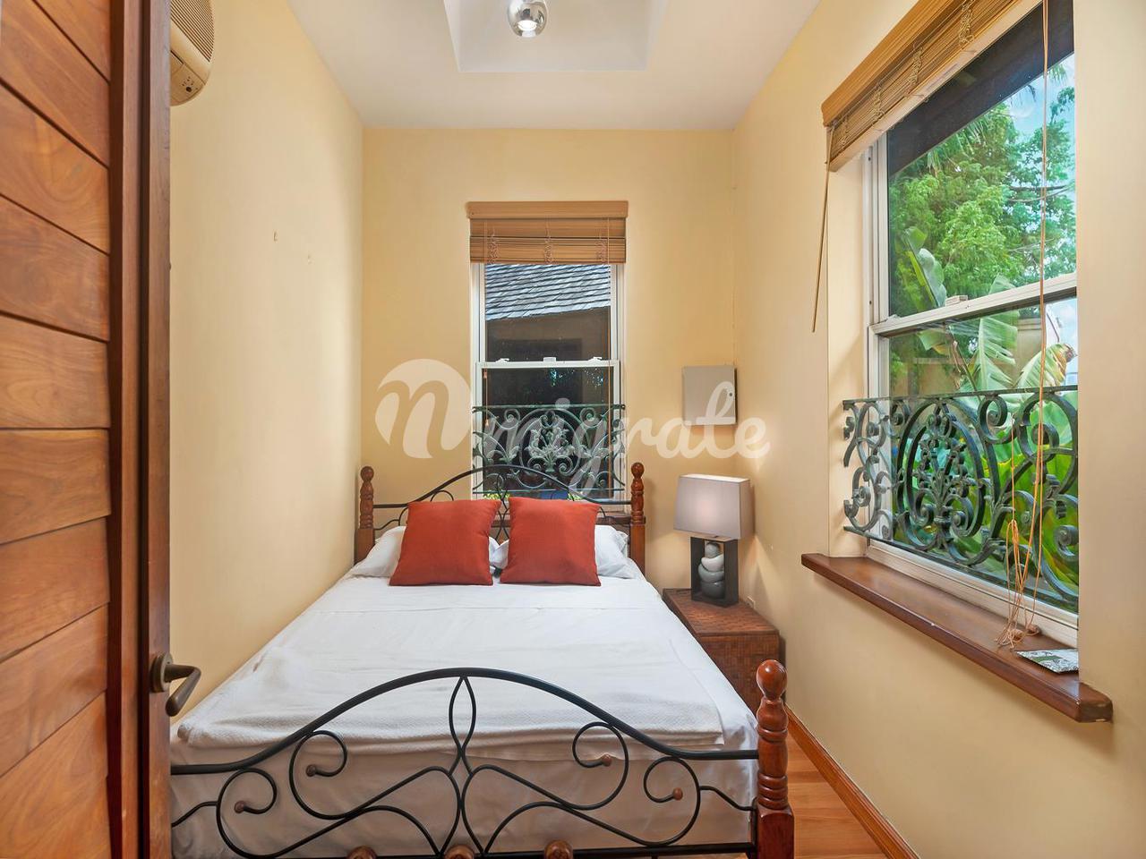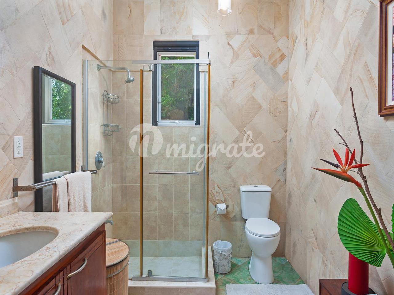 Что касается экстерьера, то инновационное использование старинных и восстановленных материалов производит впечатляющее впечатление. Кирпичи, использованные для строительства дорожки, ведущей к входной двери, и внутреннего дворика на нижнем этаже, были спасены с кораблей, где они использовались в качестве балластов с 18 века, а круглый стол, установленный на нем, является антиквариатом из Индонезии. У входной двери опорные столбы изготовлены из материалов, добытых на заводах по производству сахарного тростника на Барбадосе. Внутри помещения на первом этаже находится главная спальня, в которой есть комод, антикварные двери и кровать, привезенные из Индонезии, а на всех окнах в доме кованое железо, добытое на фабриках по производству сахарного тростника. 3 гостевые спальни и 1 гостевая ванная комната также занимают этот уровень. Гостиная наверху ведет на верхнюю палубу, в то время как центральная лестница с перилами в викторианском стиле ведет вниз на нижний уровень. Под лестницей находится водопад, в котором ранее располагался пруд с кои.
