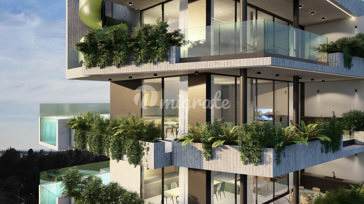 Внешние помещения спроектированы таким образом, чтобы улучшить самочувствие. Периферийные плантаторы с богатой листвой окружают жилые помещения зеленью, очищают воздух и охлаждают здание.
