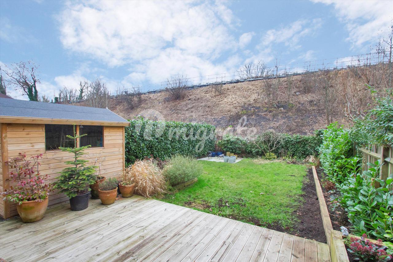 Снаружи есть одно парковочное место во дворе и кладовая перед встроенным переоборудованным гаражом. Сад в основном состоит из лужайки с настилом, идеально подходящим для трапезы на свежем воздухе.
