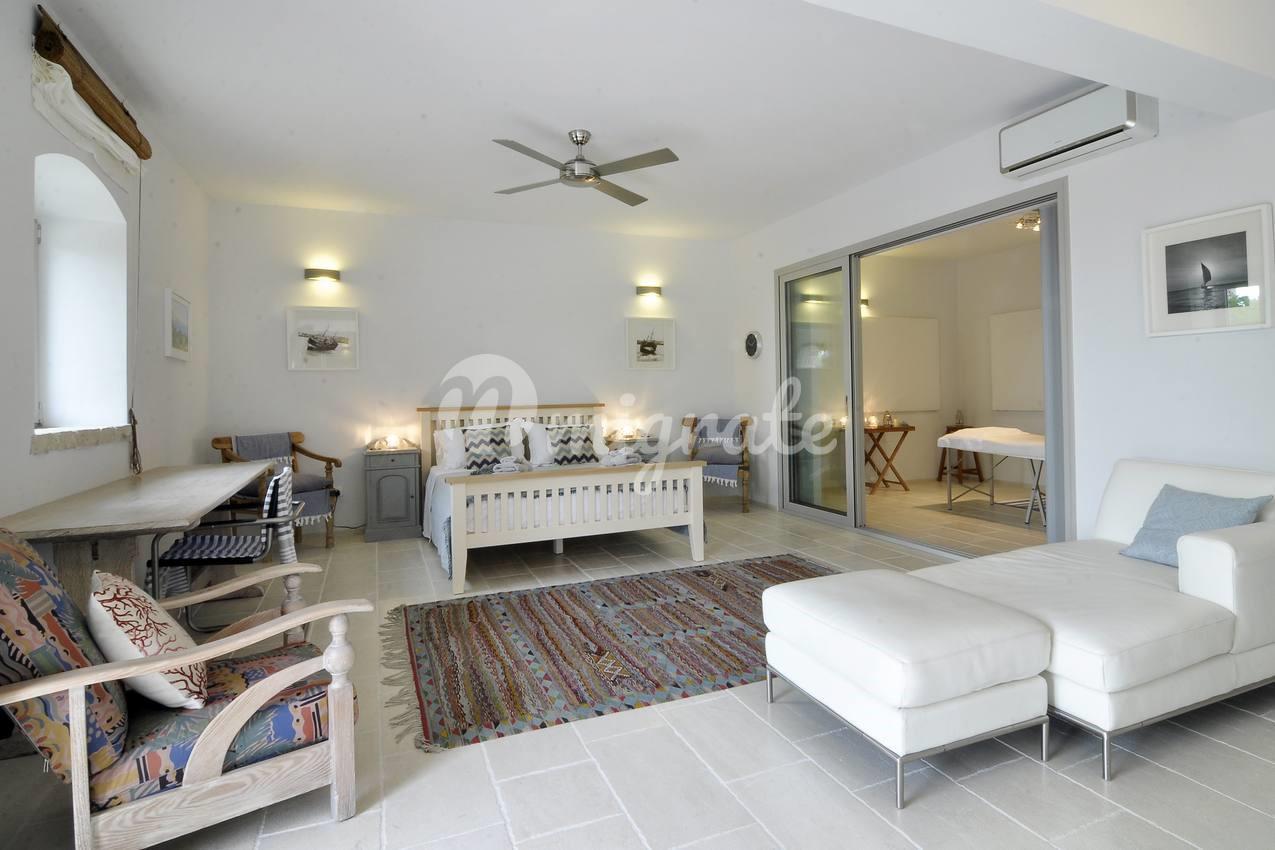 Вилла построена из белого камня и деревянных балок ручной обработки. Бережное сочетание современной и антикварной мебели создает творческую, удобную и вдохновляющую атмосферу.