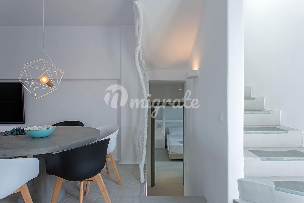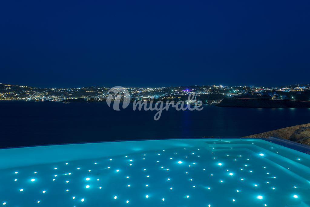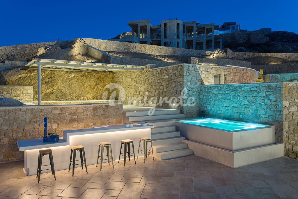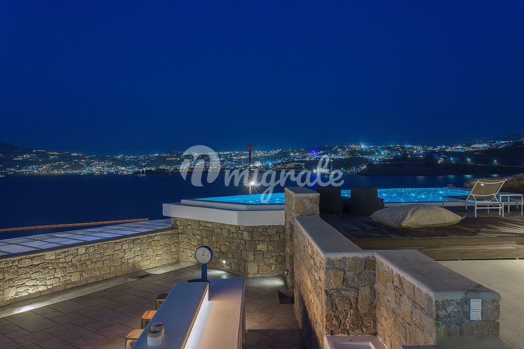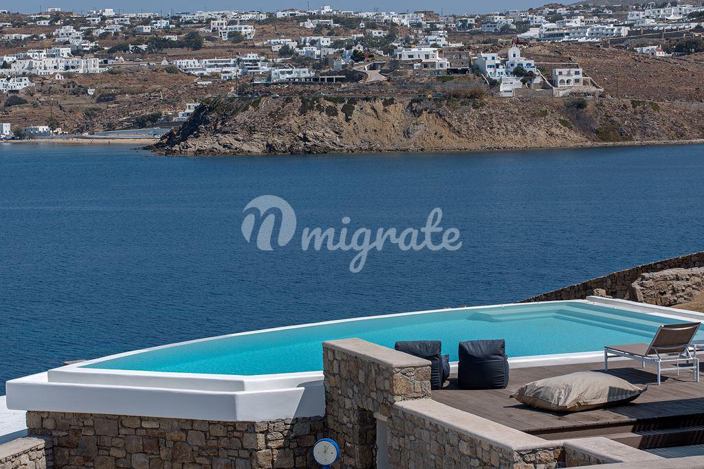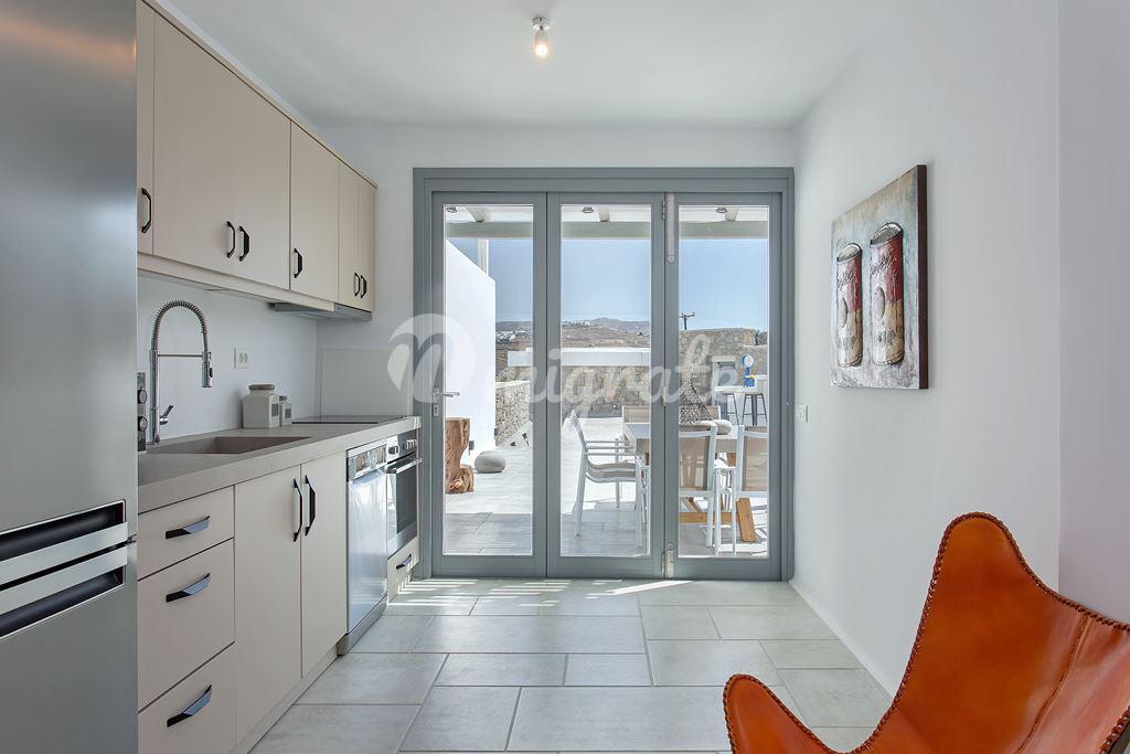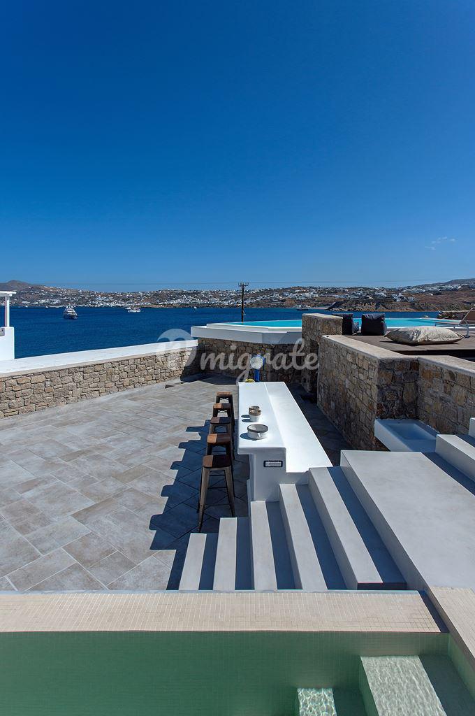 Новая вилла расположена на берегу моря, в 5 минутах езды до центра Миконоса. Вилла входит в жилой комплекс, состоящий из трех вилл, из которых она расположена на самом возвышенном участке. С виллы открывается вид на море и город. Вилла включает 4 спальни с ванными комнатами, гостиную, полностью оснащенную кухню открытого плана и столовую.