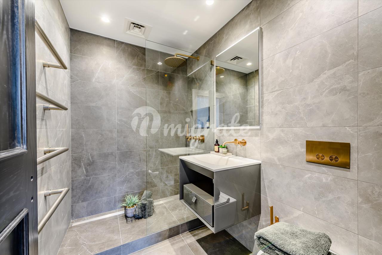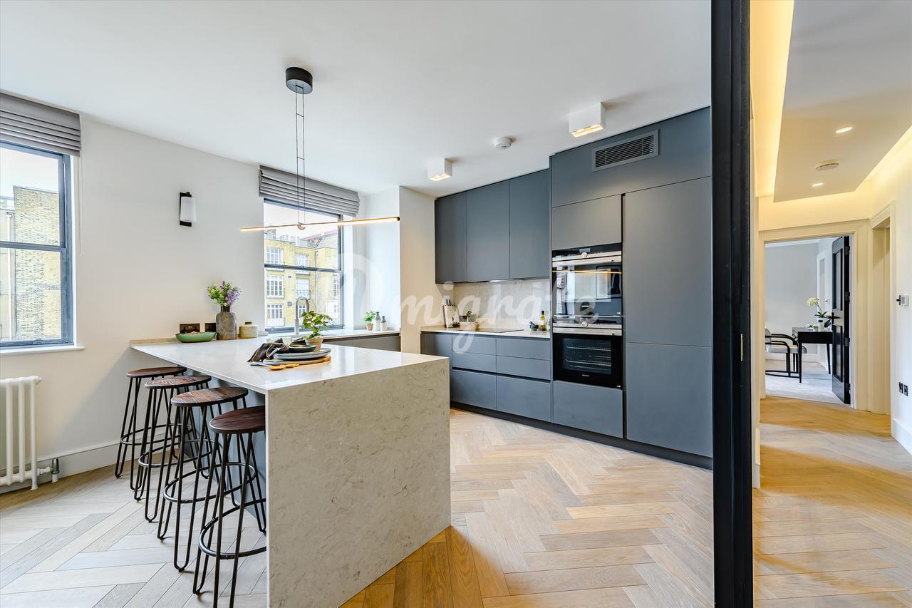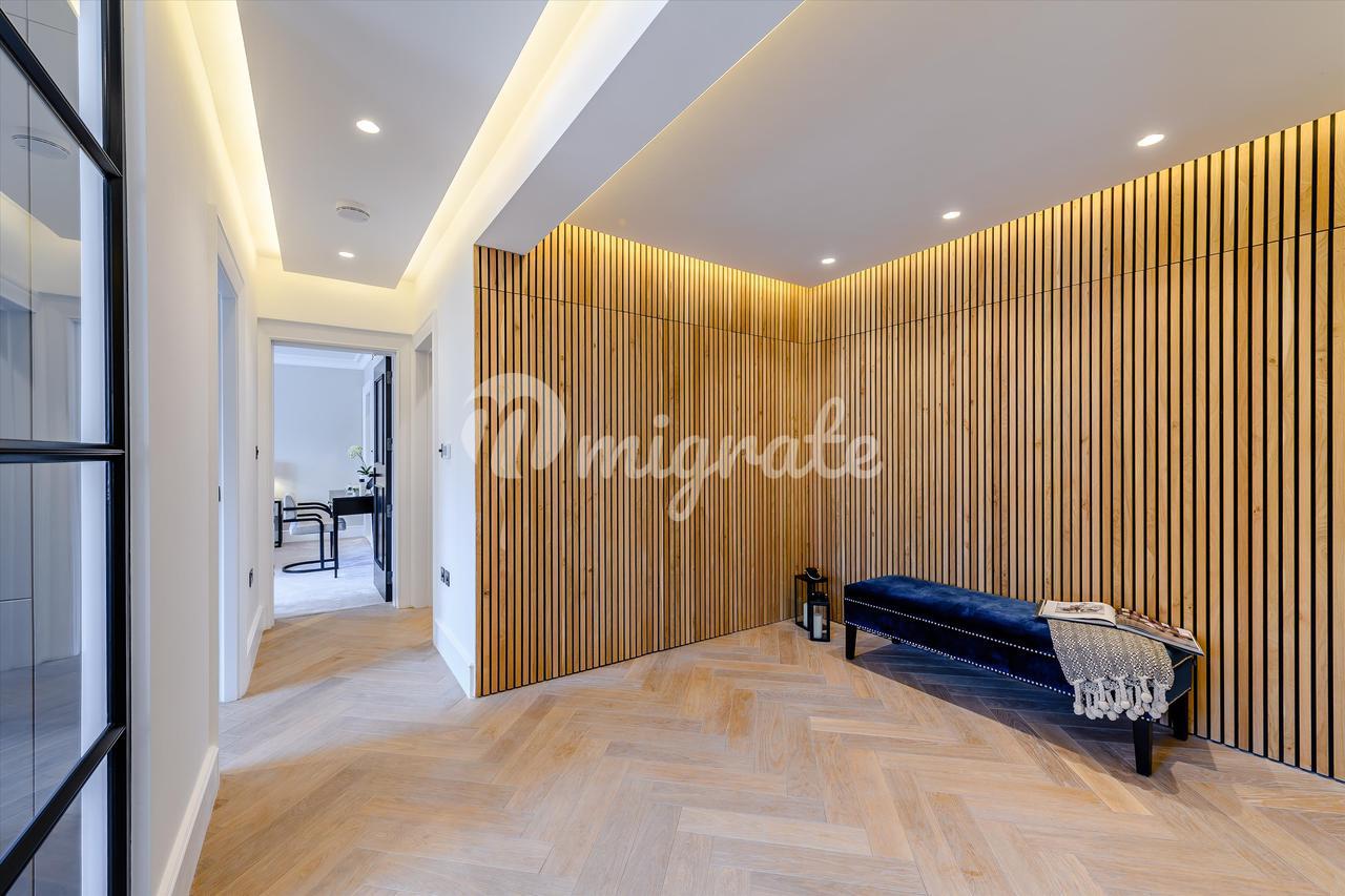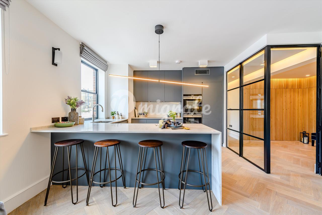 В квартиру можно попасть через большой коридор, который ведет к кухне и гостиной открытого плана через стеклянные двери, большую главную спальню с ванной комнатой и еще одну спальню и ванную комнату. В здании есть собственная консьержка и лифт.