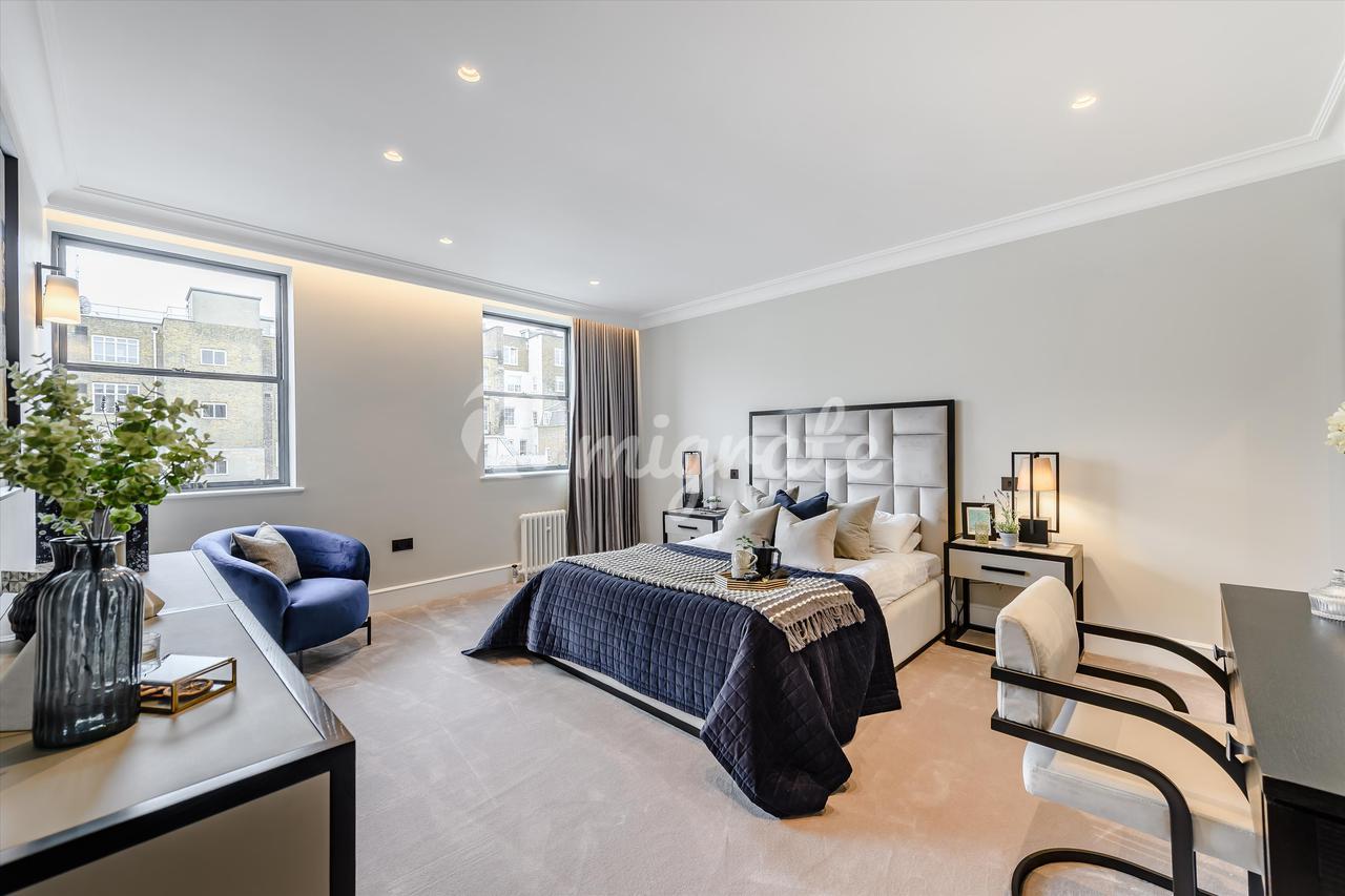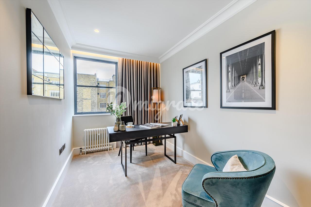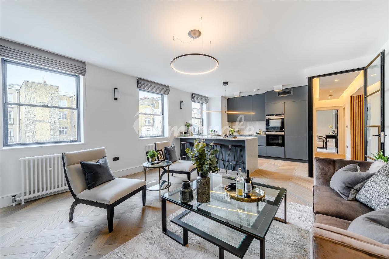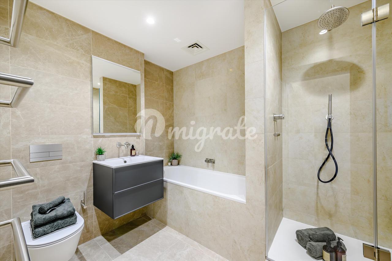 В квартиру можно попасть через большой коридор, который ведет к кухне и гостиной открытого плана через стеклянные двери, большую главную спальню с ванной комнатой и еще одну спальню и ванную комнату. В здании есть собственная консьержка и лифт.