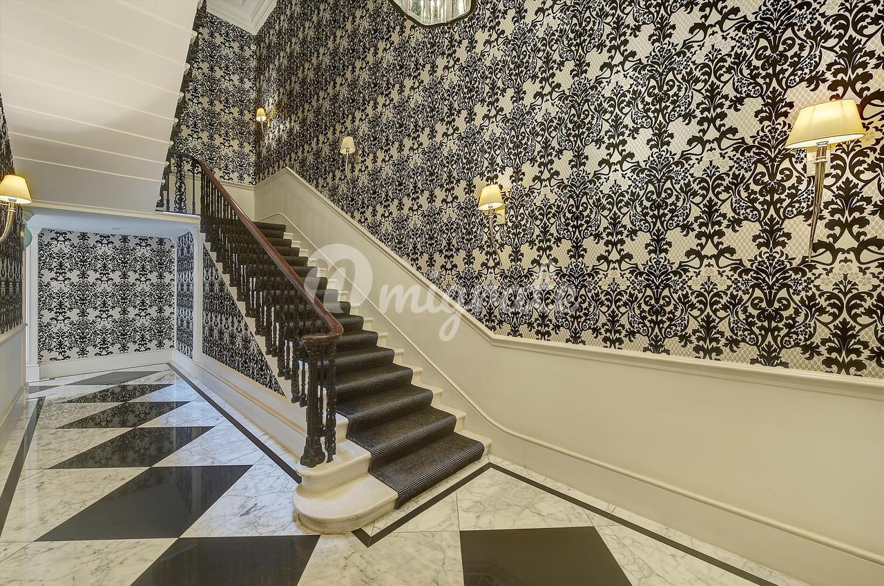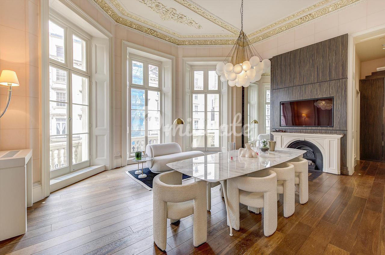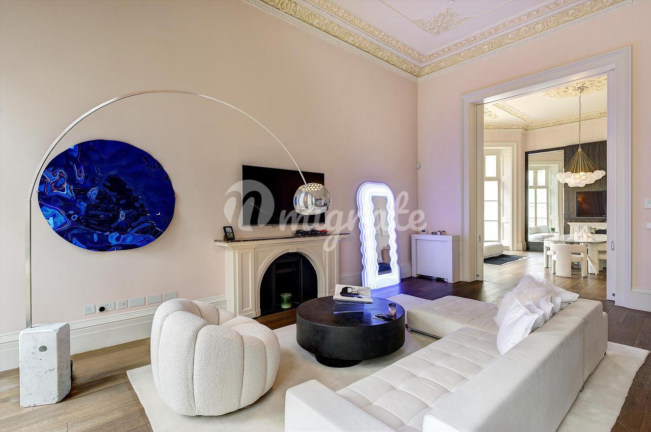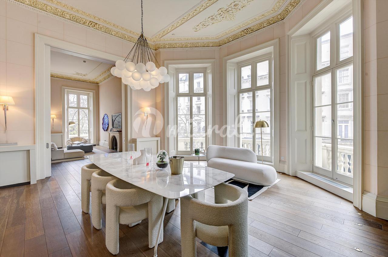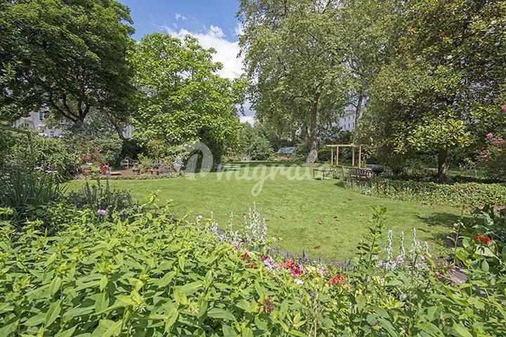 Квартира предлагает хороший баланс традиционного и современного декора, с преимуществом кондиционера. В каждом номере есть французские окна, выходящие на балконы, выходящие на южную и западную стороны. Из гостиной и кухни открытой планировки открывается вид на садовую площадь. Пожалуйста, обратите внимание, что вторая спальня является автономной, а выставочный зал расположен на половине лестничной площадки. В здании также есть лифт.