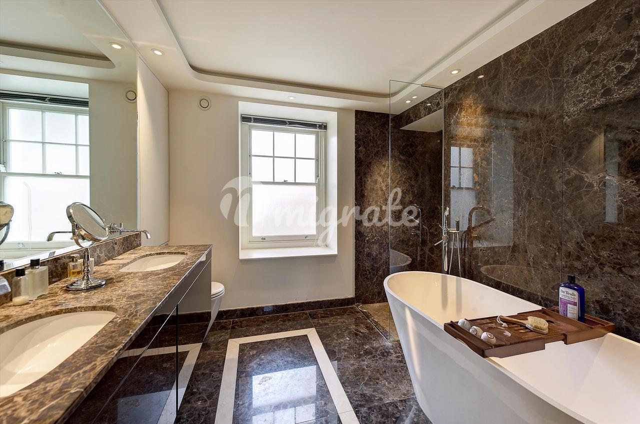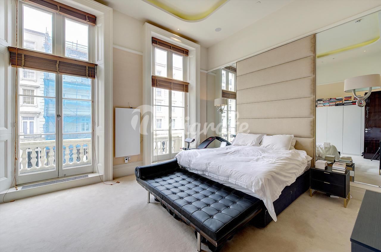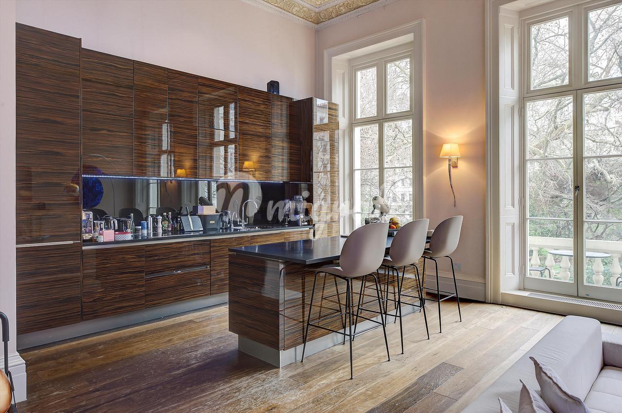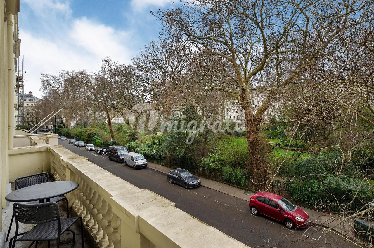 Квартира предлагает хороший баланс традиционного и современного декора, с преимуществом кондиционера. В каждом номере есть французские окна, выходящие на балконы, выходящие на южную и западную стороны. Из гостиной и кухни открытой планировки открывается вид на садовую площадь. Пожалуйста, обратите внимание, что вторая спальня является автономной, а выставочный зал расположен на половине лестничной площадки. В здании также есть лифт.