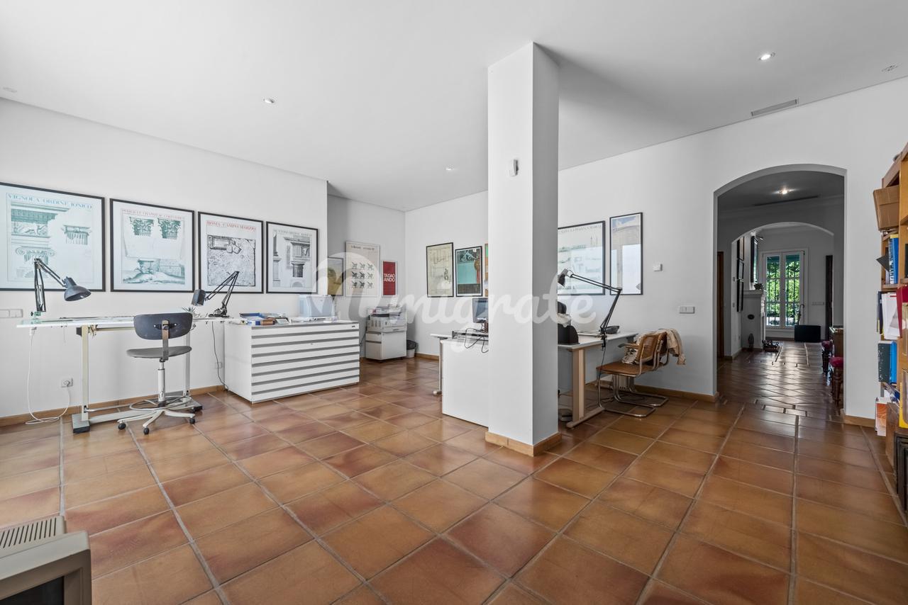 Он распределен по трем этажам. На первом этаже есть две независимые зоны; в одном из них мы находим три комнаты хорошего размера, в настоящее время оборудованные как офисы, гостевой туалет и небольшую кухню. В другой части есть гараж на две или три машины, кладовая, подвал, кладовая и мастерская. Потолки очень высокие, придающие простор и свет всему этажу.
