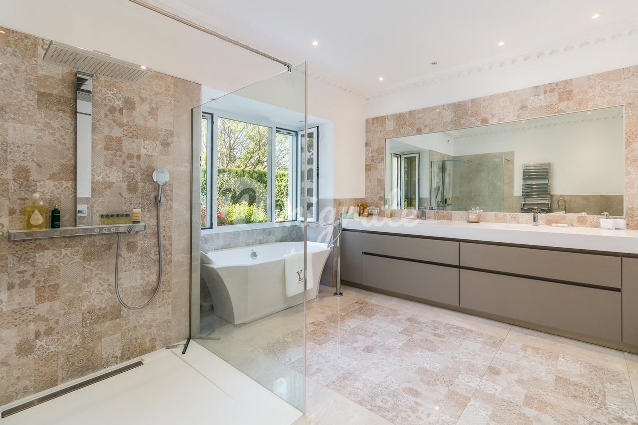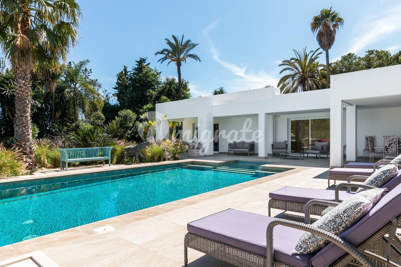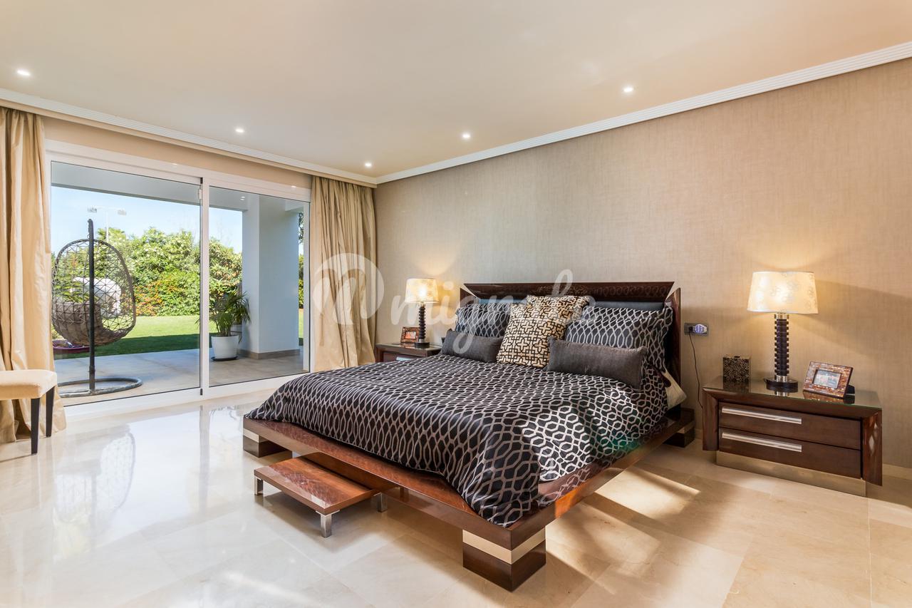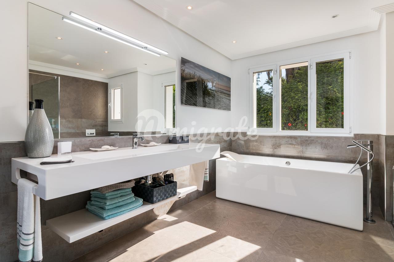 Эта одноуровневая, недавно отремонтированная вилла расположена на очень частном участке в районе Эль-Параисо-Медио, примерно в 3 км от пляжа и примерно в 100 м от ближайшего коммерческого центра на полпути между Сан-Педро-де-Алькантарой и Эстепоной. Его территория включает в себя главный дом в современном стиле, отдельный гостевой дом с гостиной, спальней, ванной комнатой и кухней, бассейн, частный теннисный корт и просторный ухоженный зрелый сад. В главном доме есть 5 спален с 5 ванными комнатами, 3 гостиные, обеденная зона, полностью оборудованная кухня, кабинет, библиотека и отдельные апартаменты для гостей с патио. Зоны отдыха, которые ведут на открытые террасы, можно было бы отгородить стеклянными занавесками Lumon.