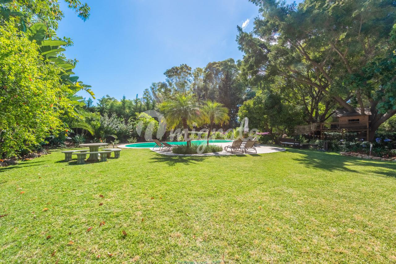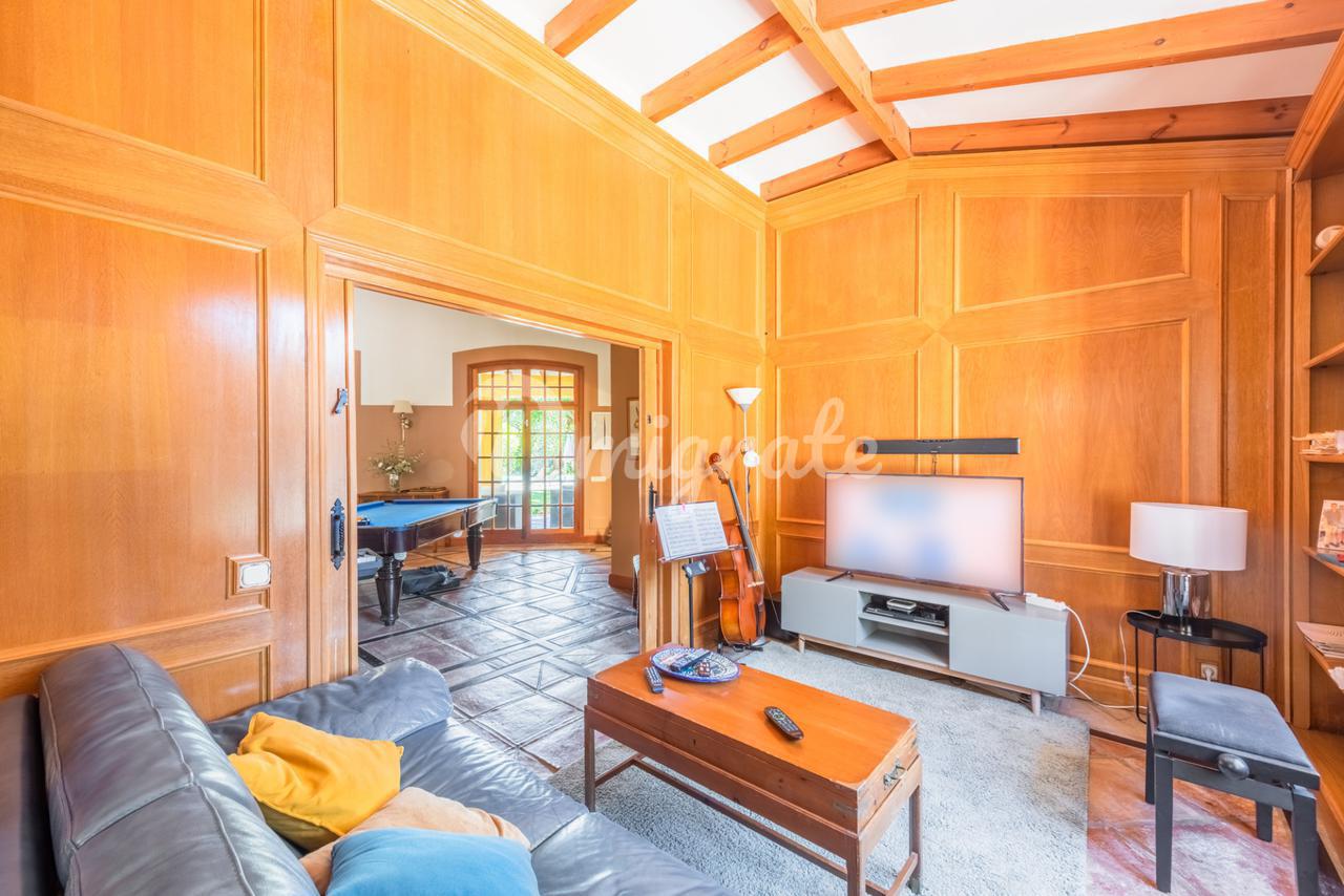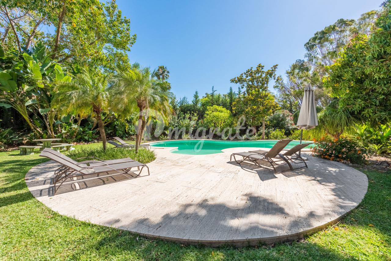 Вилла окружена зрелым и полностью орошаемым садом с растениями, кустарниками, деревьями и освещением, включающим бассейн неправильной формы площадью около 80 м2. Построен с классическим традиционным экстерьером. Столярные изделия были сделаны из древесины орегонской сосны.
