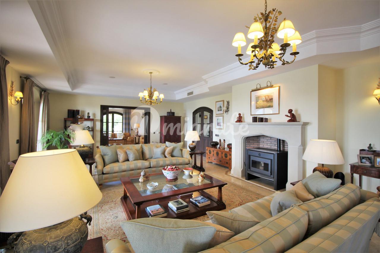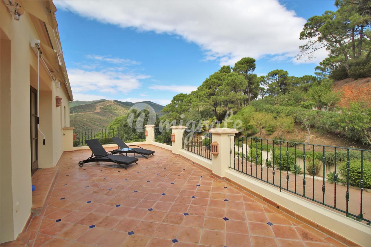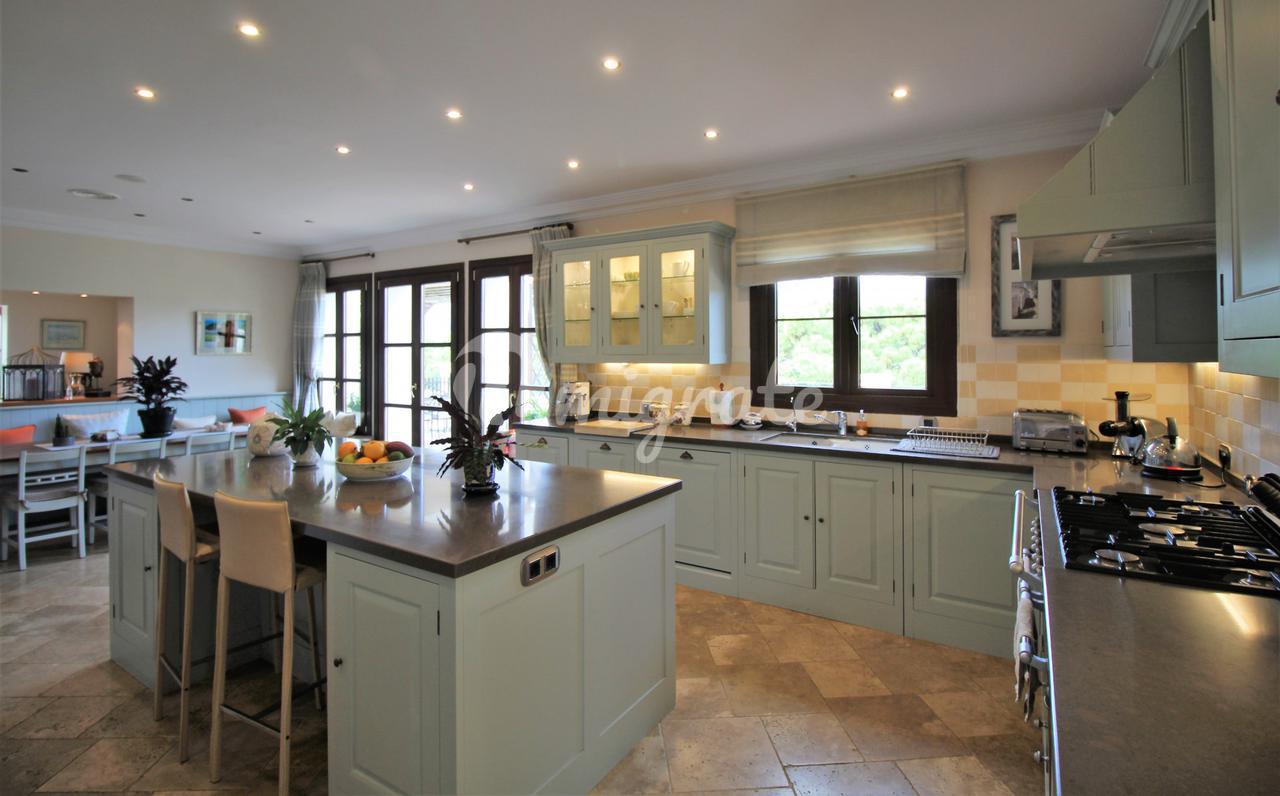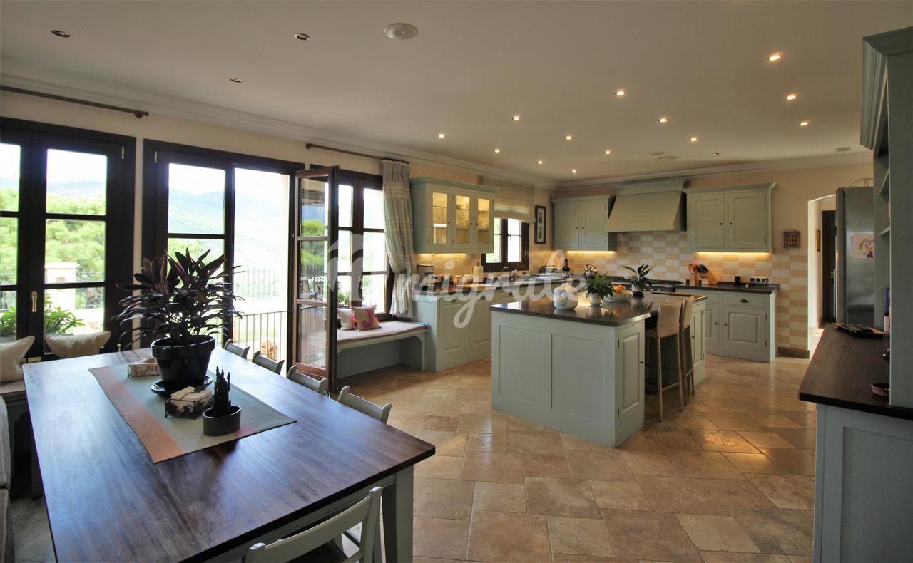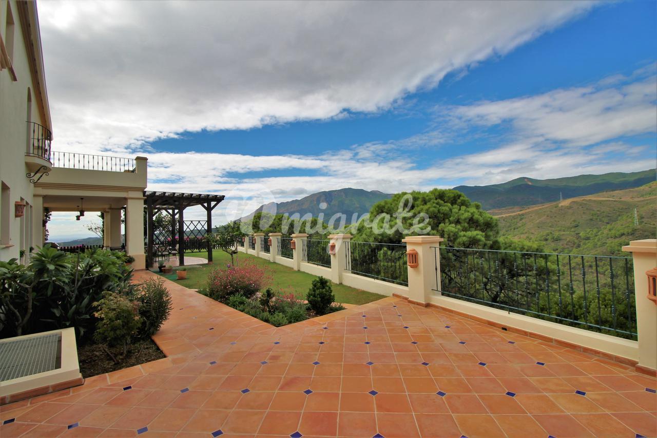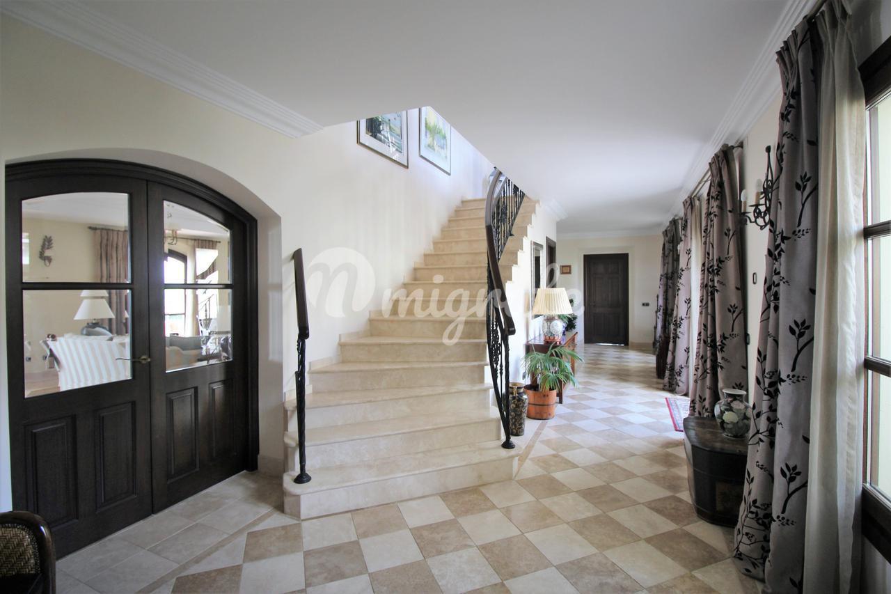 Этот впечатляющий загородный дом, спроектированный известным архитектором Сезаром де Лейвой, расположен на самой вершине Эль-Велерин-Альто, в глубине страны, недалеко от прибрежной дороги перед городом Эстепона, в окружении лесистых холмов природного парка Сьерра-Бермеха, наполняющих свежую горную местность запахом сосны, лаванды и дикорастущих растений. К собственности, состоящей из главного дома и примыкающих к нему автономных апартаментов в современном стиле, ведет широкая подъездная дорога с кольцевой развязкой, доступ к которой осуществляется через прихожую с гостевым туалетом и техническим помещением, далее есть зона приема с выходом в центральный двор и изящная лестница на верхний уровень, которая дает вход в официальную гостиную с камином на пеллетах. Слева находится семейная комната с газовым камином, которая в настоящее время используется как офис, а справа от гостиной находится столовая, которая фактически используется как семейная комната. Эта комната соединена с большой, полностью оборудованной по индивидуальному заказу английской кухней с газовой плитой, электрической духовкой, посудомоечной машиной и холодильником для вина. Здесь также есть центральный остров и уголок для завтрака со столом очень большого размера. Кладовая и прачечная соединены с кухней, а также имеют выход во внутренний двор.