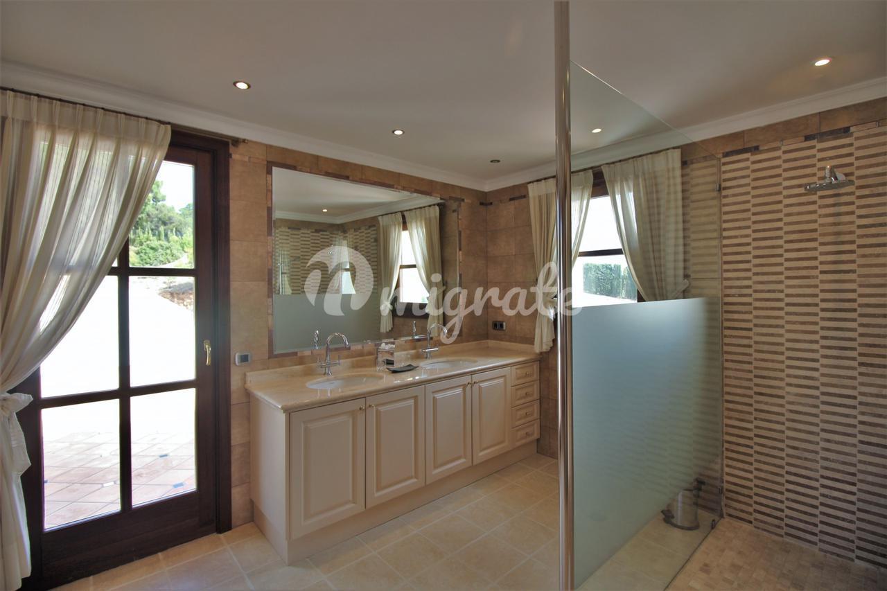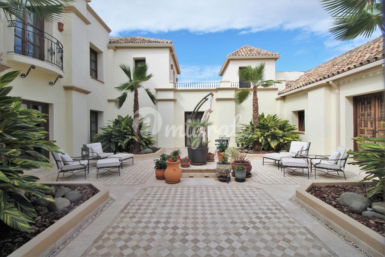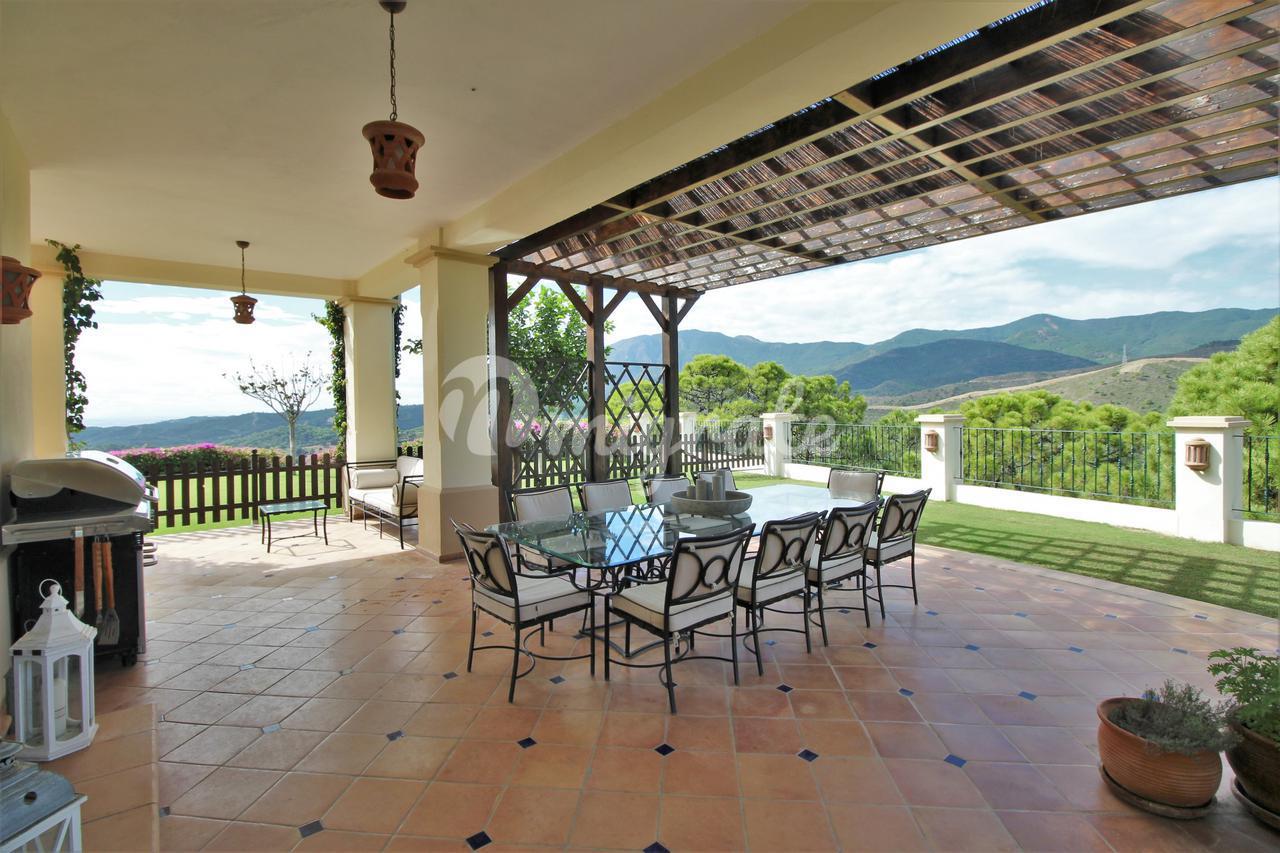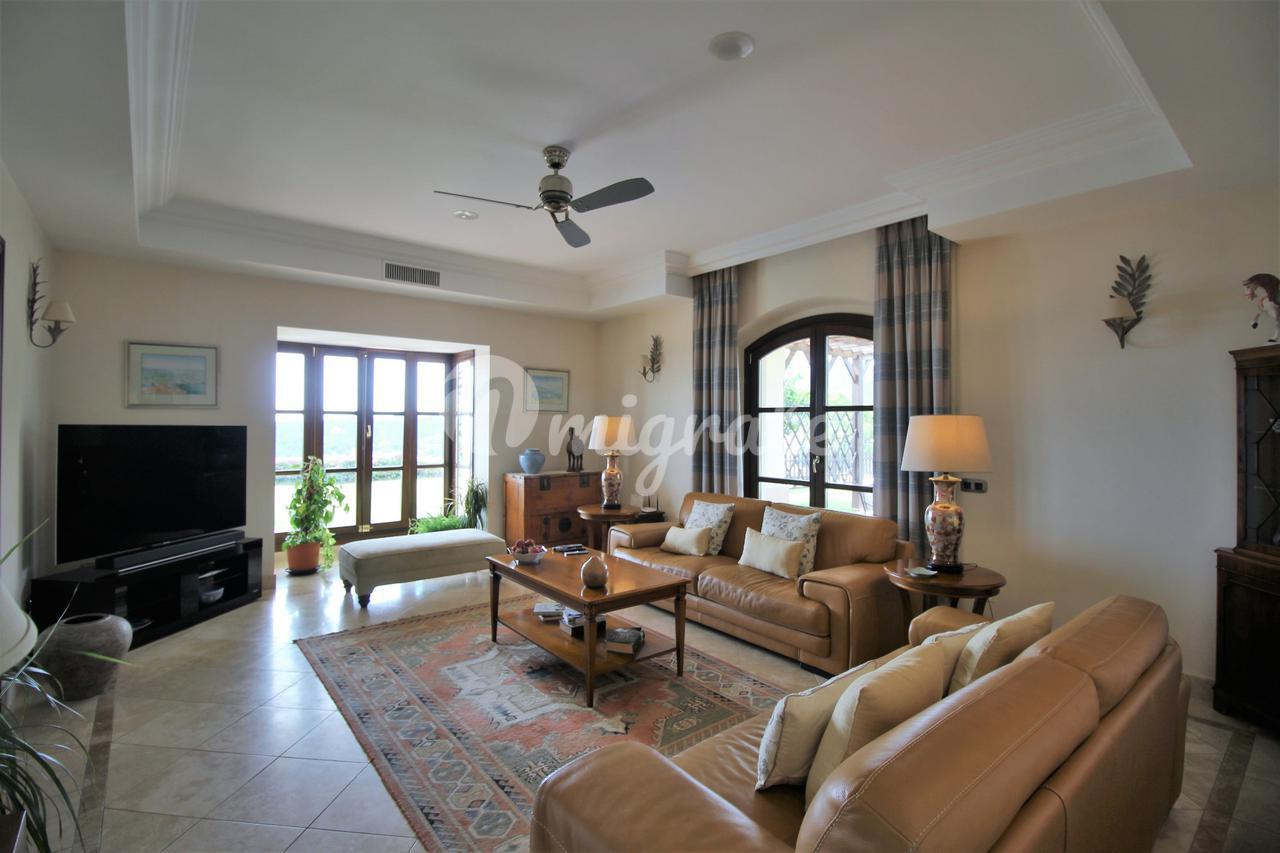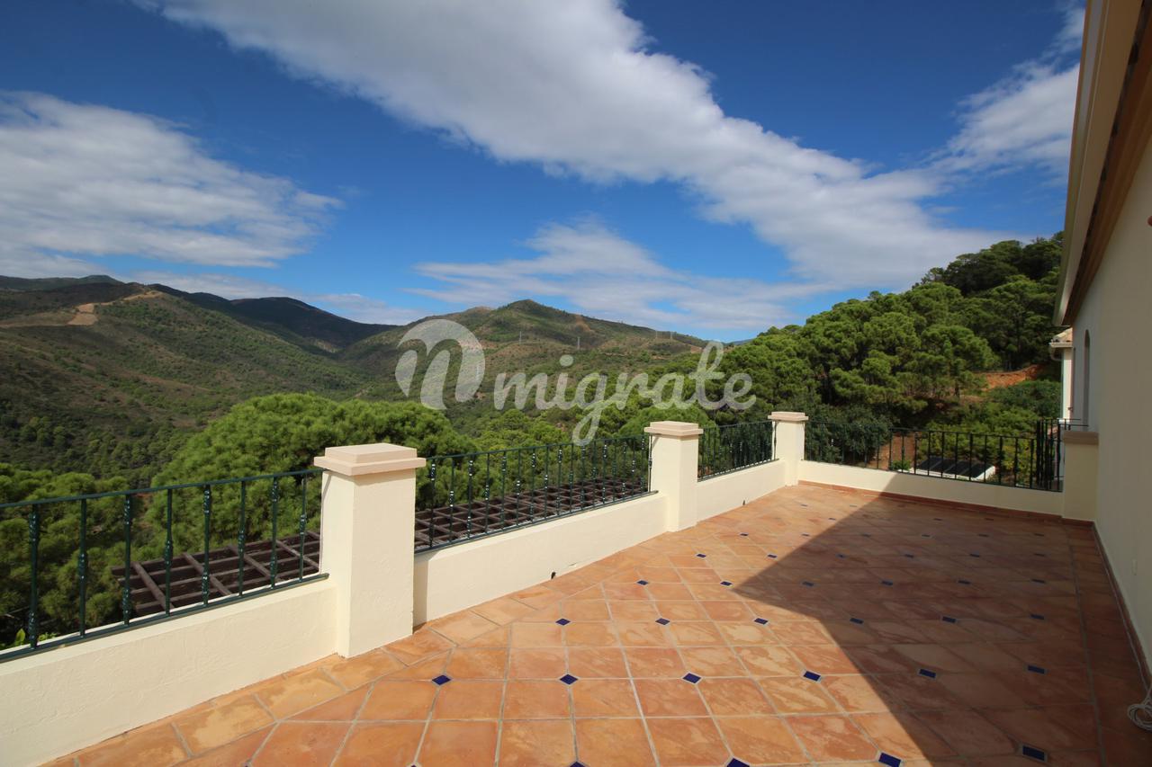 Этот впечатляющий загородный дом, спроектированный известным архитектором Сезаром де Лейвой, расположен на самой вершине Эль-Велерин-Альто, в глубине страны, недалеко от прибрежной дороги перед городом Эстепона, в окружении лесистых холмов природного парка Сьерра-Бермеха, наполняющих свежую горную местность запахом сосны, лаванды и дикорастущих растений. К собственности, состоящей из главного дома и примыкающих к нему автономных апартаментов в современном стиле, ведет широкая подъездная дорога с кольцевой развязкой, доступ к которой осуществляется через прихожую с гостевым туалетом и техническим помещением, далее есть зона приема с выходом в центральный двор и изящная лестница на верхний уровень, которая дает вход в официальную гостиную с камином на пеллетах. Слева находится семейная комната с газовым камином, которая в настоящее время используется как офис, а справа от гостиной находится столовая, которая фактически используется как семейная комната. Эта комната соединена с большой, полностью оборудованной по индивидуальному заказу английской кухней с газовой плитой, электрической духовкой, посудомоечной машиной и холодильником для вина. Здесь также есть центральный остров и уголок для завтрака со столом очень большого размера. Кладовая и прачечная соединены с кухней, а также имеют выход во внутренний двор.