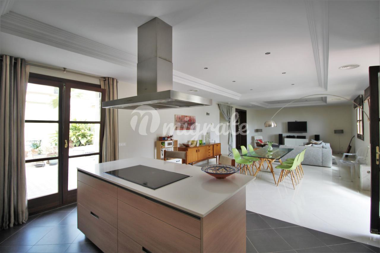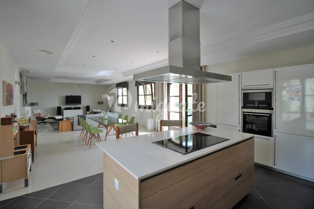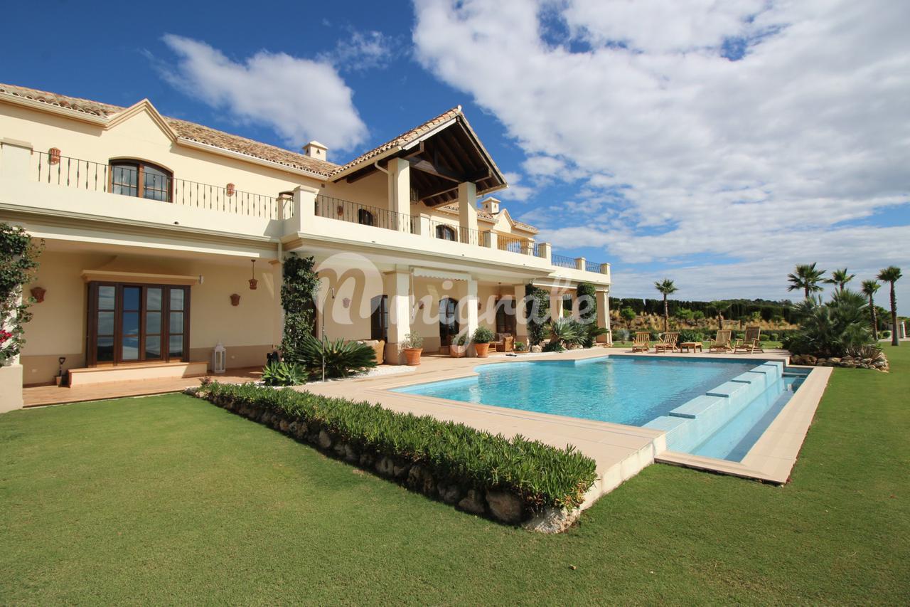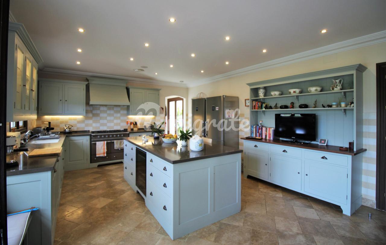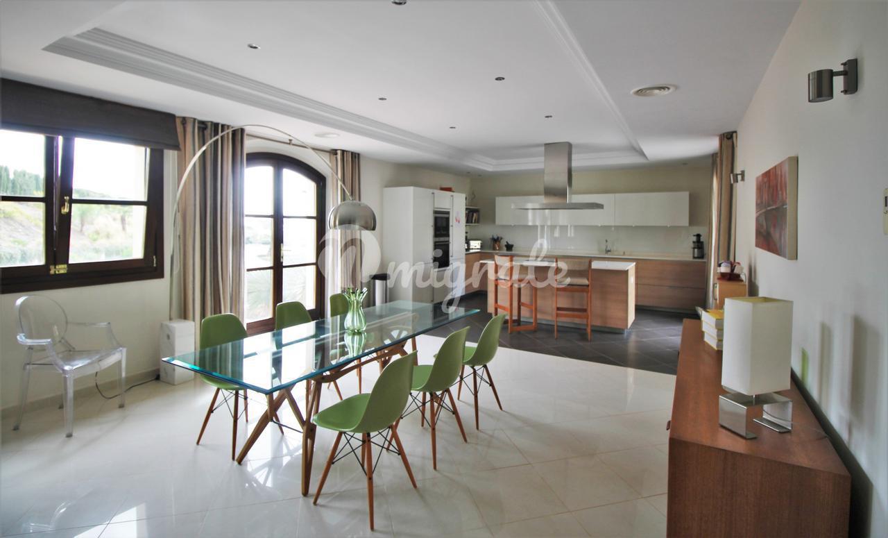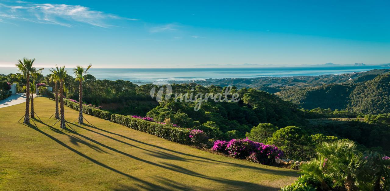 Этот впечатляющий загородный дом, спроектированный известным архитектором Сезаром де Лейвой, расположен на самой вершине Эль-Велерин-Альто, в глубине страны, недалеко от прибрежной дороги перед городом Эстепона, в окружении лесистых холмов природного парка Сьерра-Бермеха, наполняющих свежую горную местность запахом сосны, лаванды и дикорастущих растений. К собственности, состоящей из главного дома и примыкающих к нему автономных апартаментов в современном стиле, ведет широкая подъездная дорога с кольцевой развязкой, доступ к которой осуществляется через прихожую с гостевым туалетом и техническим помещением, далее есть зона приема с выходом в центральный двор и изящная лестница на верхний уровень, которая дает вход в официальную гостиную с камином на пеллетах. Слева находится семейная комната с газовым камином, которая в настоящее время используется как офис, а справа от гостиной находится столовая, которая фактически используется как семейная комната. Эта комната соединена с большой, полностью оборудованной по индивидуальному заказу английской кухней с газовой плитой, электрической духовкой, посудомоечной машиной и холодильником для вина. Здесь также есть центральный остров и уголок для завтрака со столом очень большого размера. Кладовая и прачечная соединены с кухней, а также имеют выход во внутренний двор.