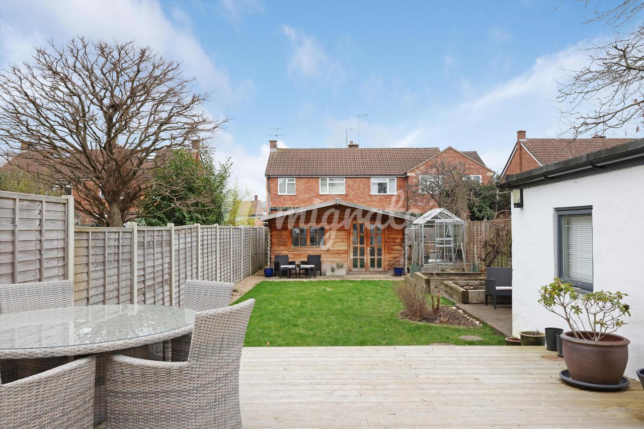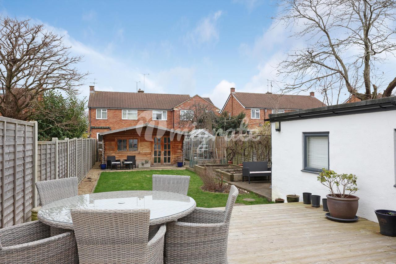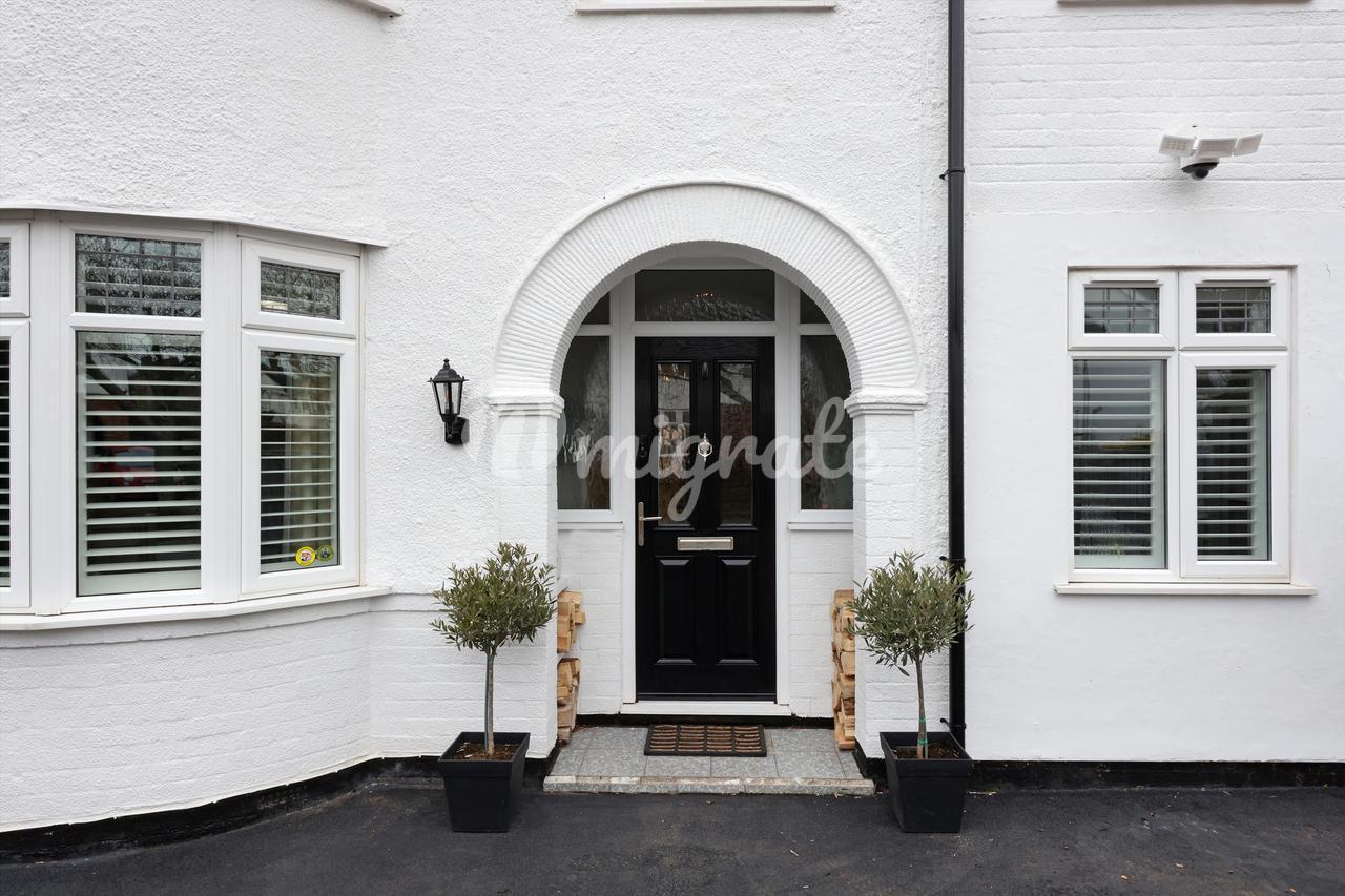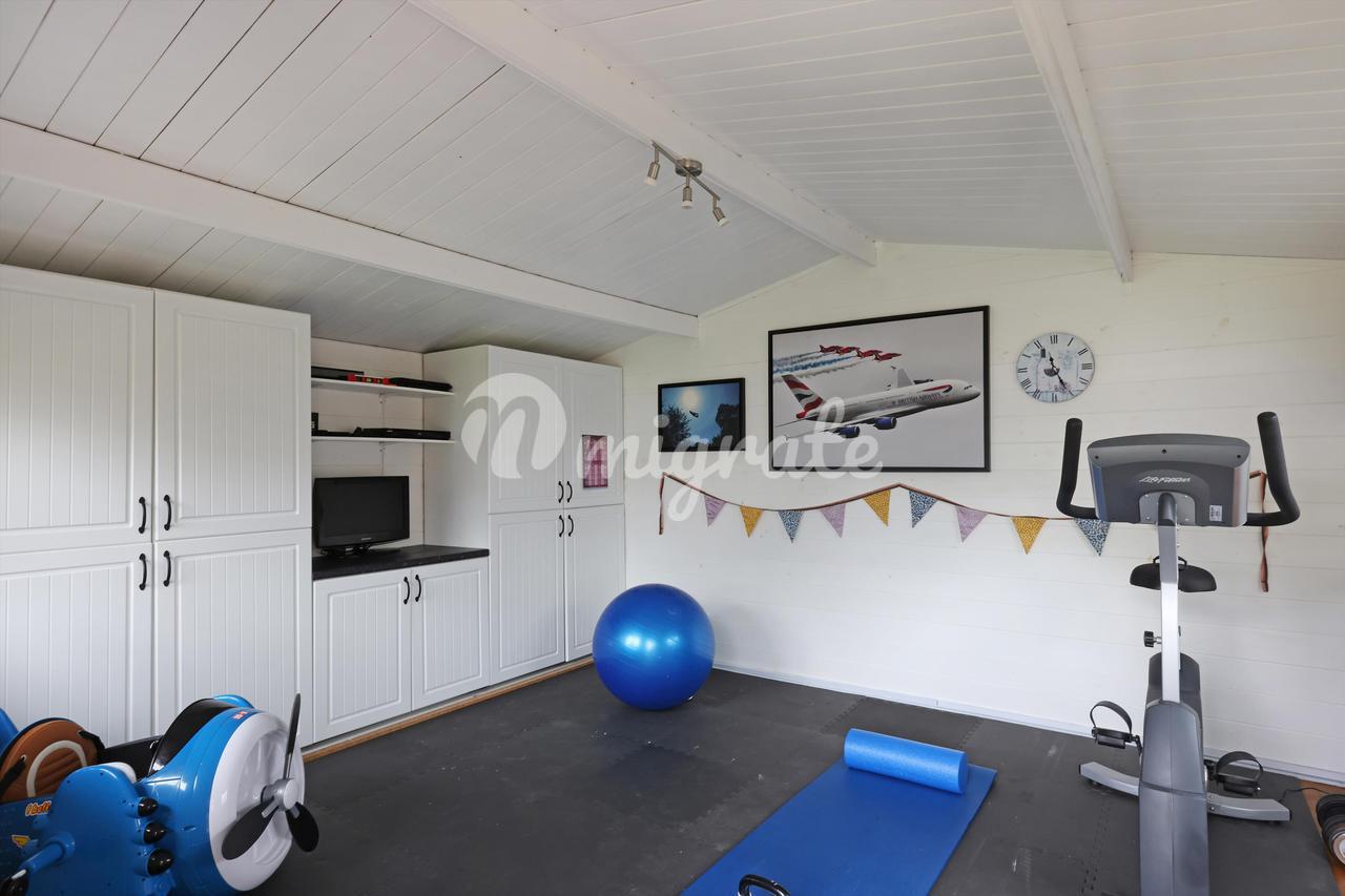Снаружи к дому ведет большая подъездная дорожка с парковкой на две машины. Сад на заднем дворе в основном представляет собой газон со смесью зрелых растений и кустарников. В дальнем конце также есть отдельно стоящий летний домик. С правой стороны дома находится домашний офис и магазин, которые ранее были гаражом.