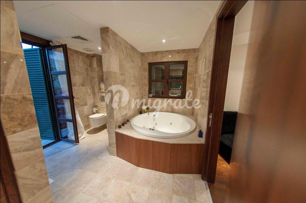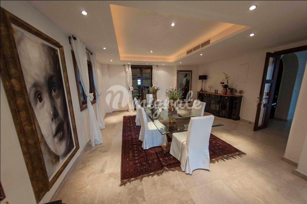 Общая площадь внутренних помещений 454 кв. м. Гостиная-столовая открытой планировки, отдельная кухня, прачечная и гостевой туалет с душем на нижнем этаже; четыре спальни со своими ванными комнатами, а главная к тому же с гардеробной и джакузи – на первом этаже. Во всех спальнях балконы с видом на море.